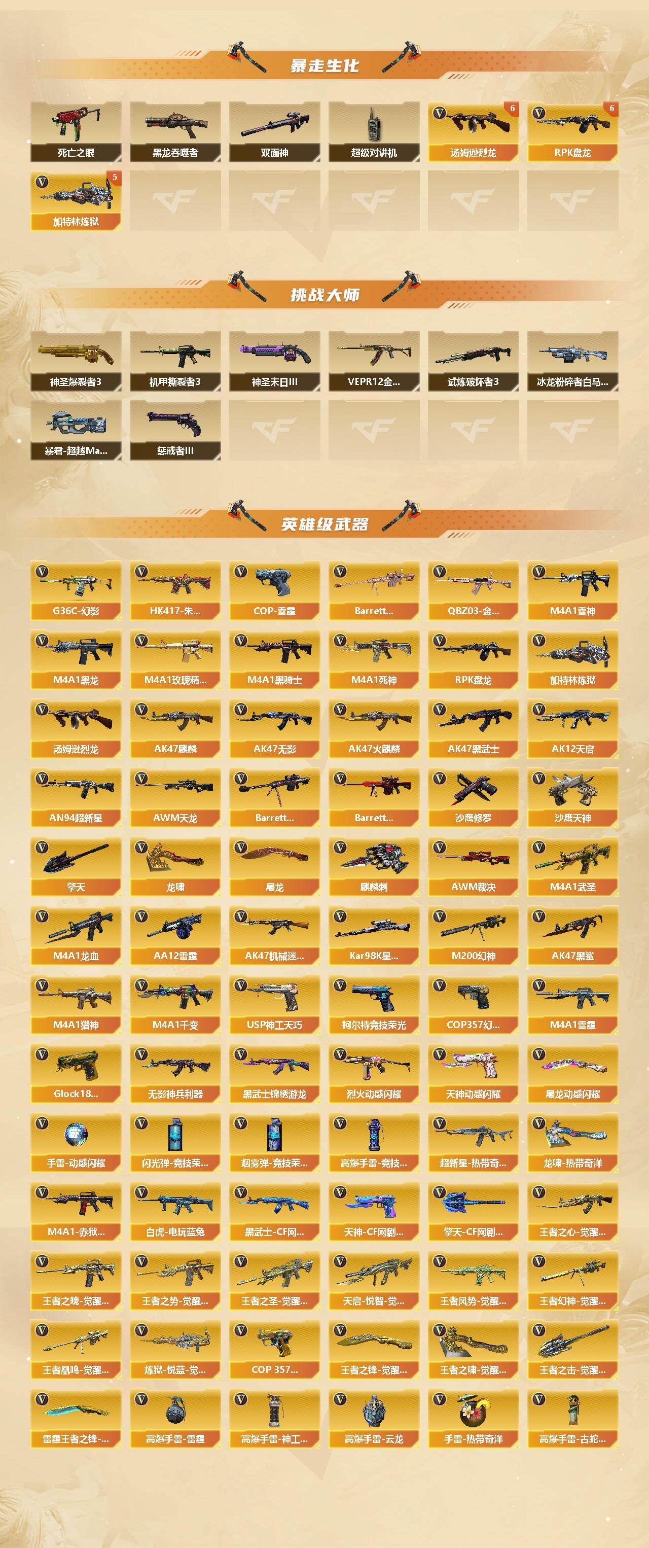 【热门武器】:G36C-幻影,QBZ03-金色蔷薇,HK417-朱雀,M200-幻神,死亡之眼,白虎-电玩蓝兔,QBZ03-街机,Kar98K-星神,C.A.T,M4A1-黑骑士*2,汤姆逊-烈龙*6,RPK-盘龙*6,加特林-炼狱*5,COP-白鲨,COP 357-幻灵,沙鹰-修罗*4