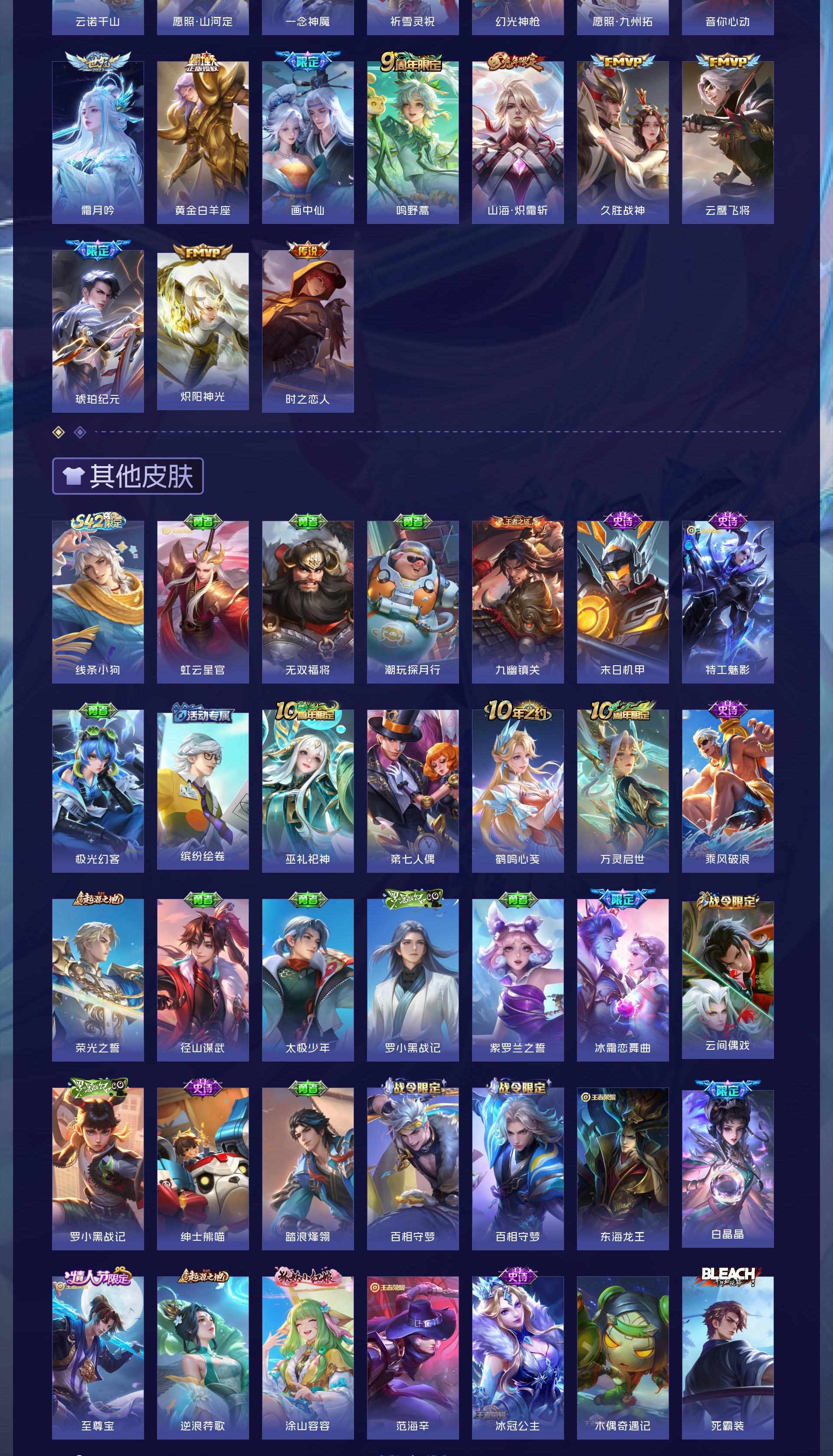 V8 皮肤216 英雄126 永恒钻石 荣耀典藏1 无双皮肤2 珍品传说6 传说24 其他皮肤188