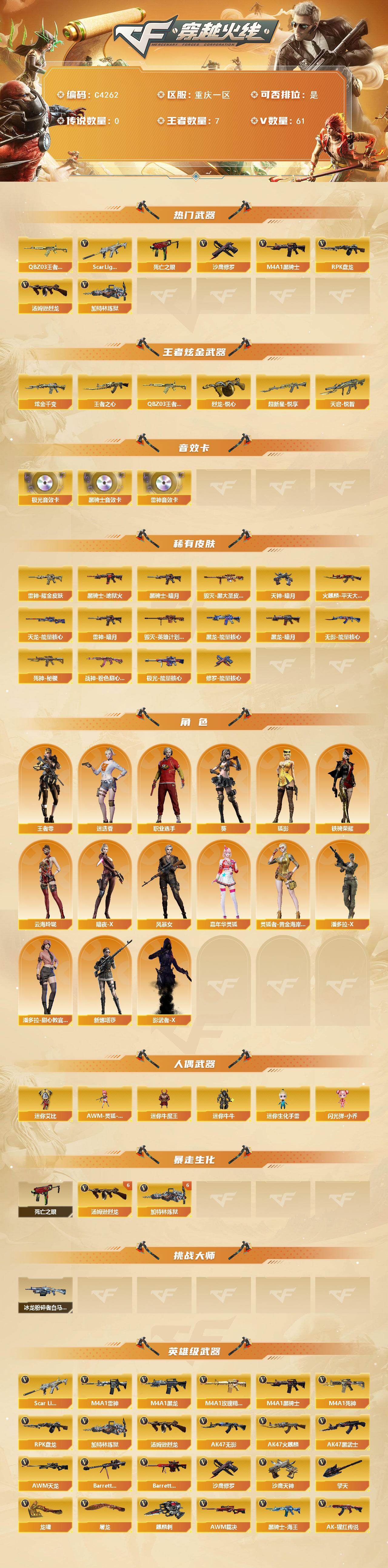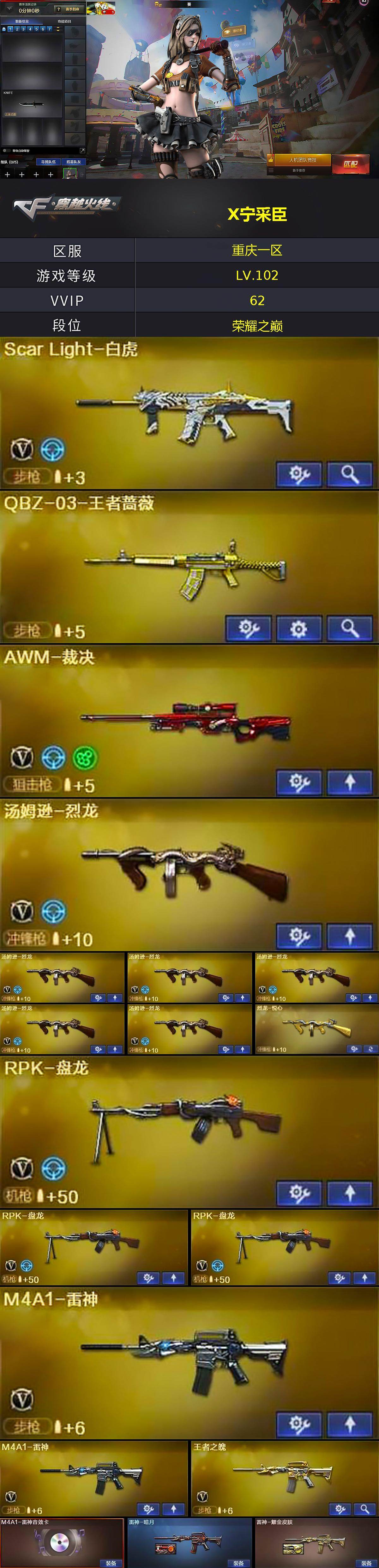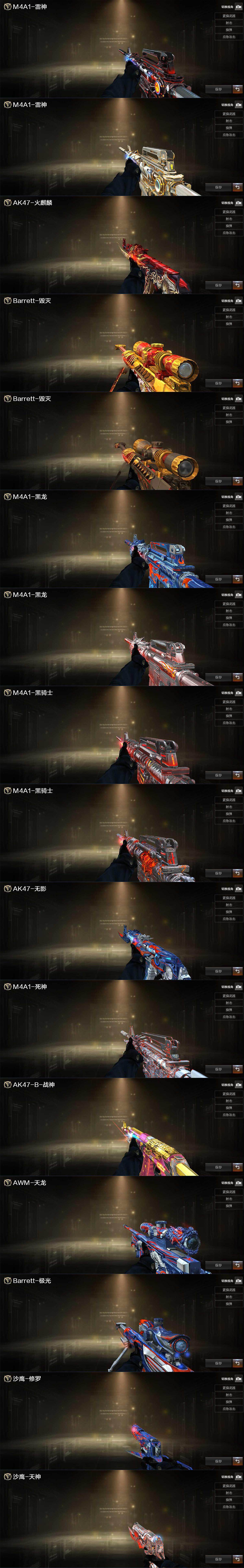 【热门武器】:Scar Light-白虎,QBZ-03-王者蔷薇,死亡之眼*3,M4A1-黑骑士,汤姆逊-烈龙*6,RPK-盘龙*3,加特林-炼狱*8,沙鹰-修罗*3
