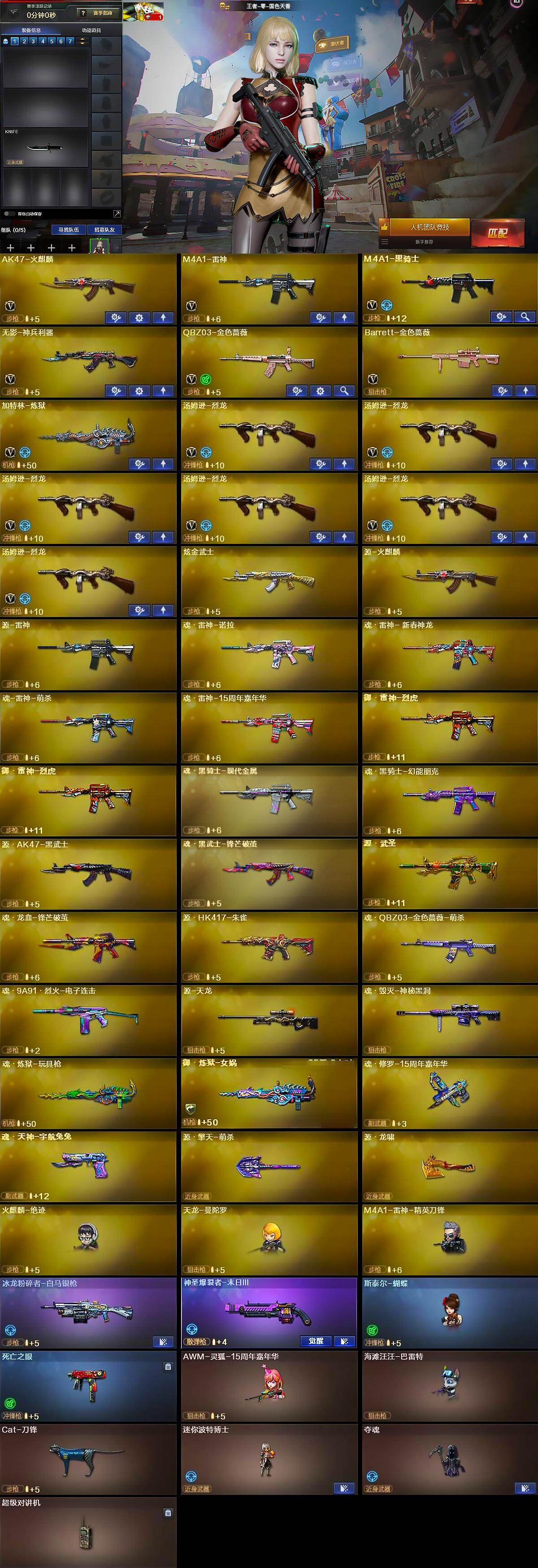 【人偶武器】:火麒麟-绝迹,天龙-曼陀罗,M4A1-雷神-精英刀锋,斯泰尔-蝴蝶,AWM-灵狐-15周年嘉年华,海滩汪汪-巴雷特