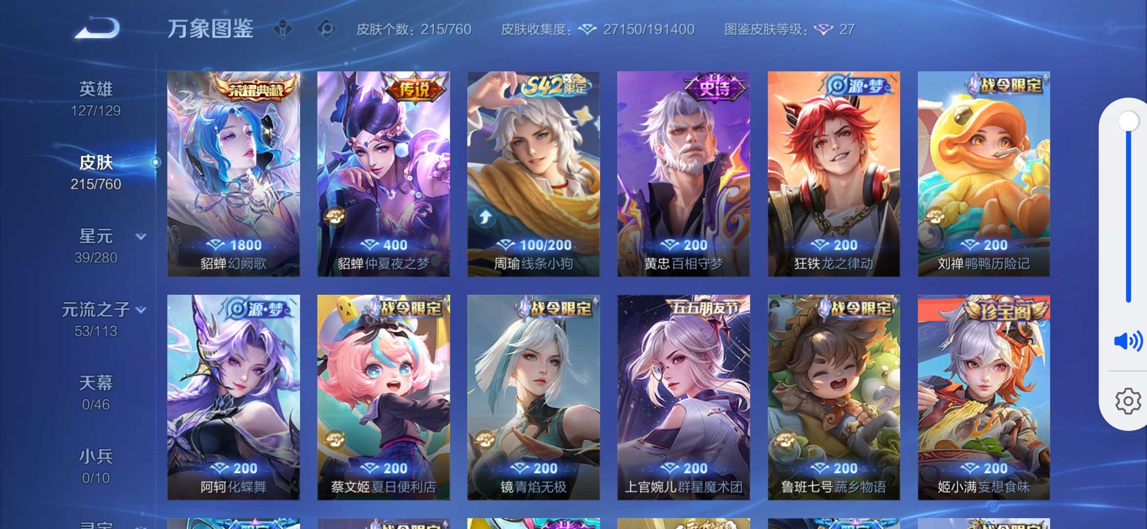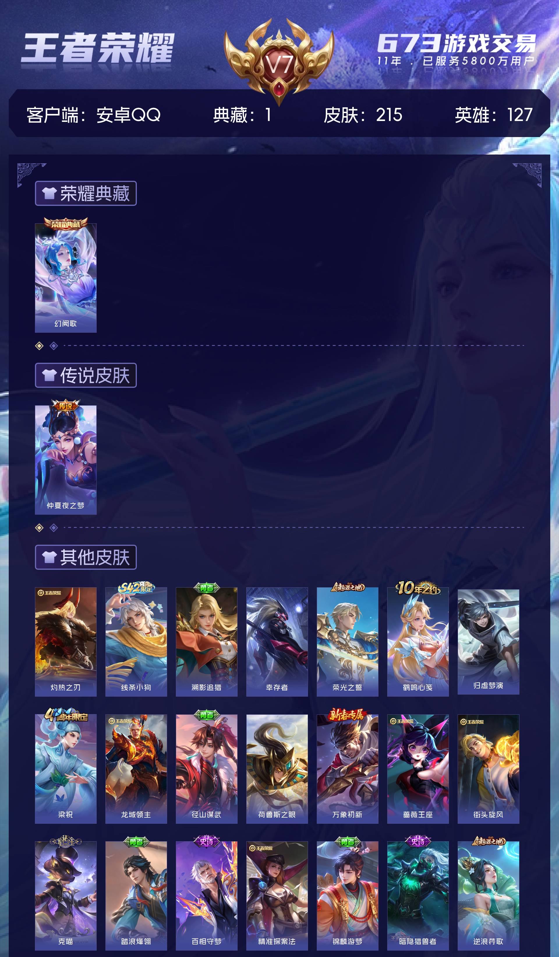 V7 皮肤215 英雄127 永恒钻石 荣耀典藏1 传说1 其他皮肤218
