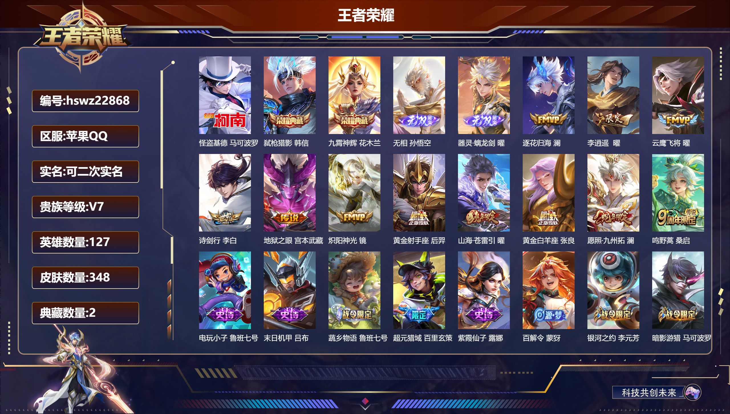 苹果QQ/永恒钻石/348皮肤/127英雄/2典藏/0珍品无双/2无双/1珍品传说/11传说/83史