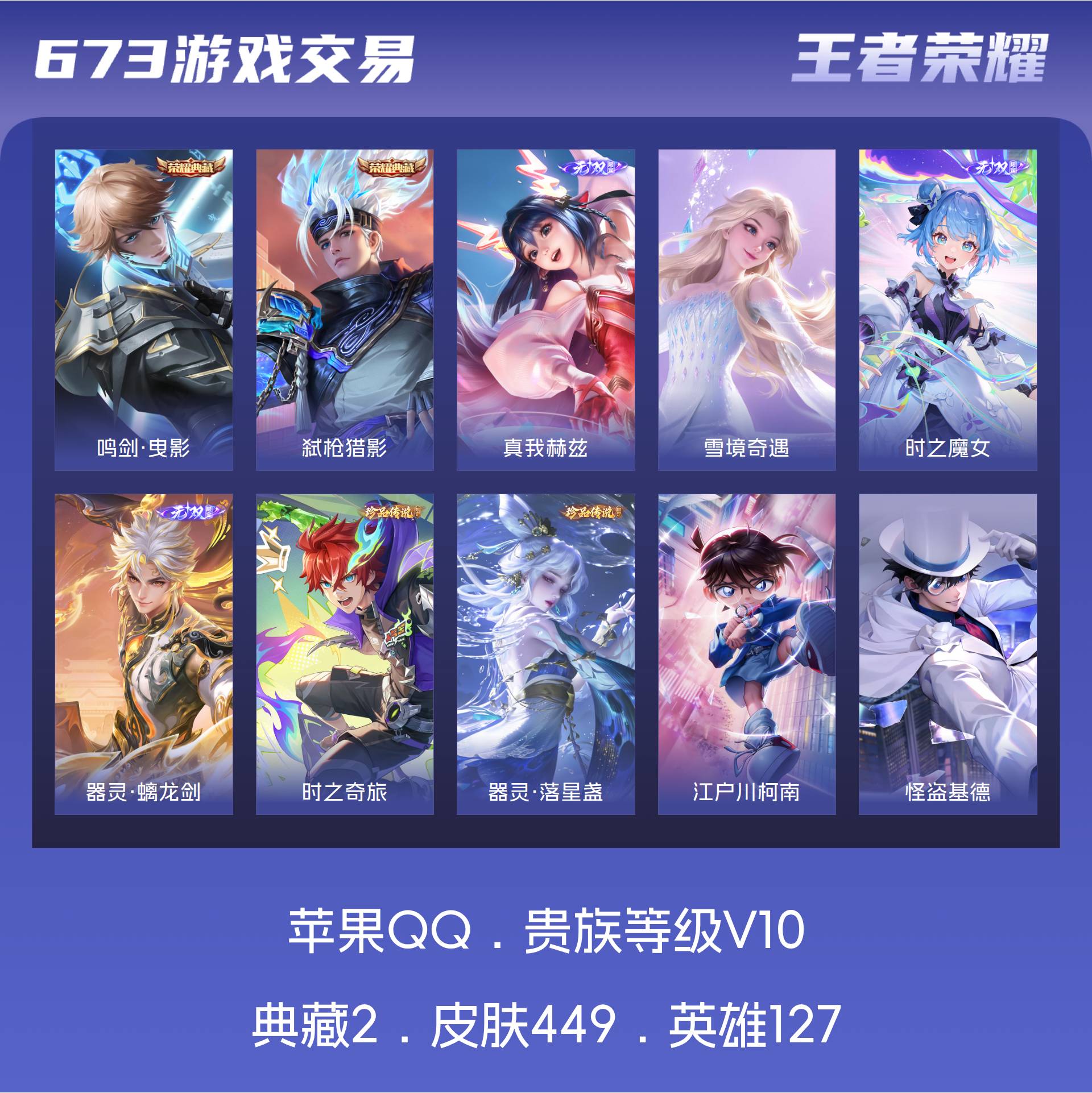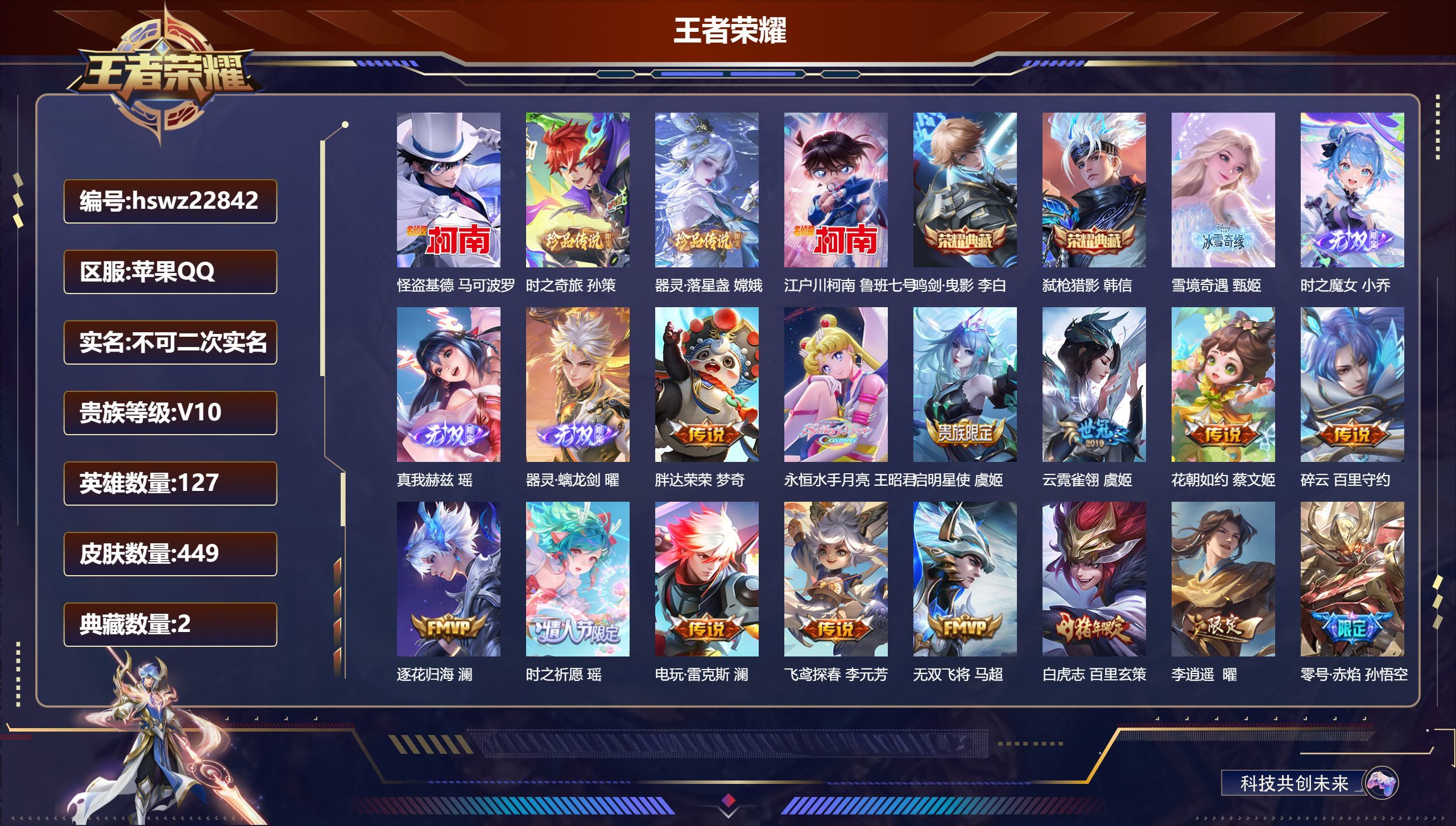 苹果QQ/尊贵铂金/449皮肤/127英雄/2典藏/0珍品无双/4无双/4珍品传说/66传说/135