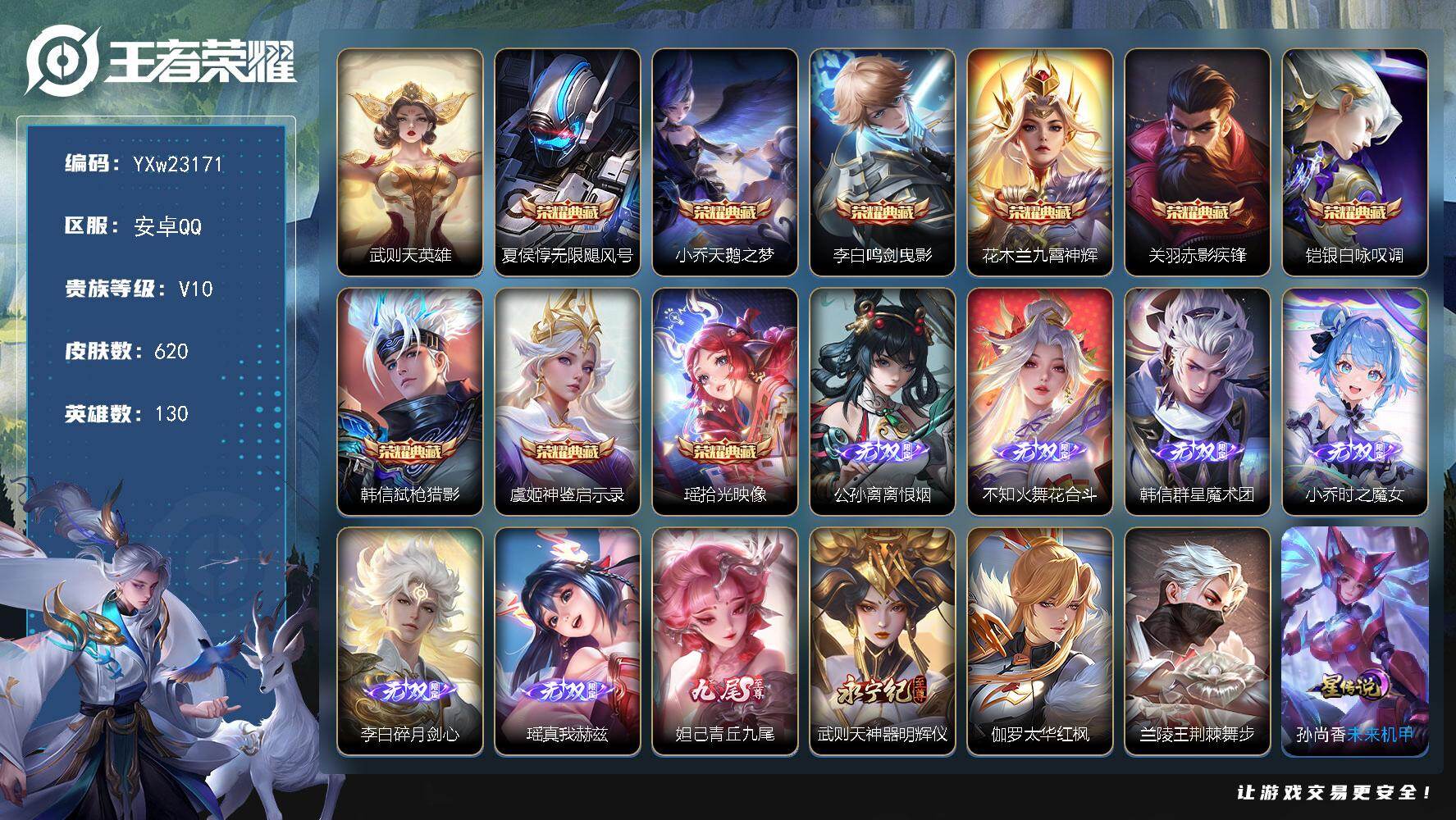 安卓QQ/非凡王者/621皮肤/129英雄/9典藏/0珍品无双/0无双/1珍品传说/102传说/21