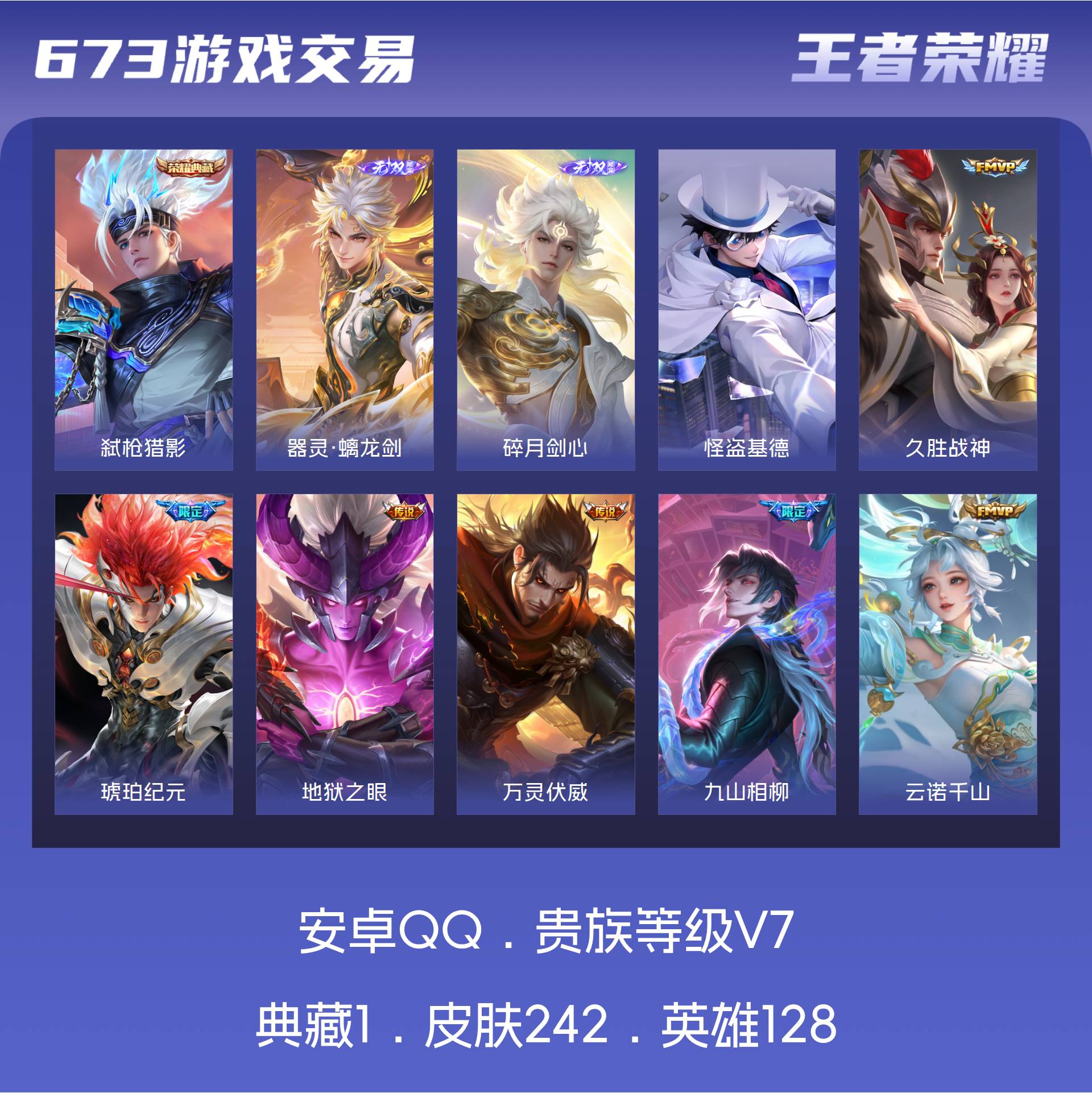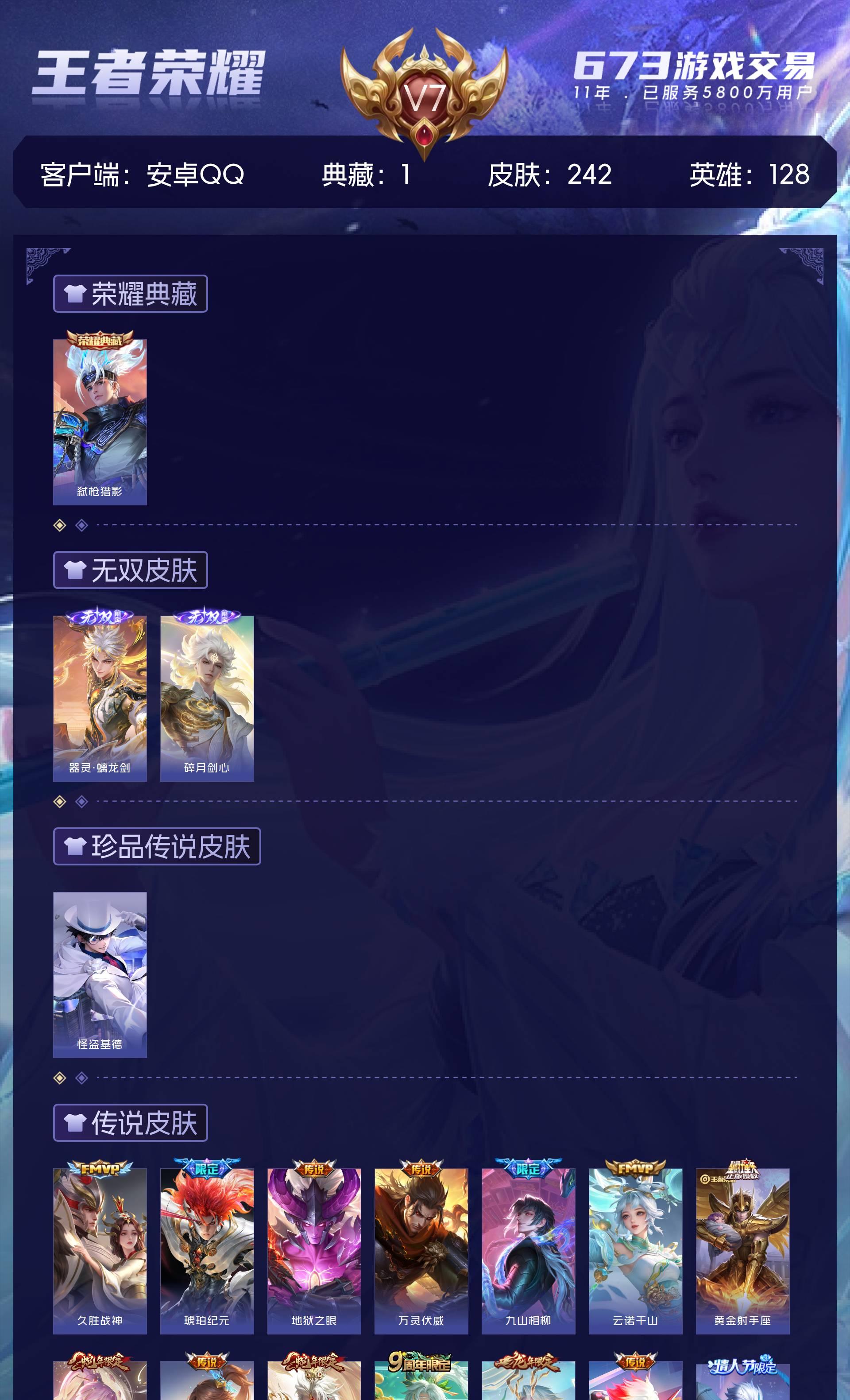 安卓QQ/至尊星耀/242皮肤/128英雄/1典藏/0珍品无双/2无双/1珍品传说/18传说/84史