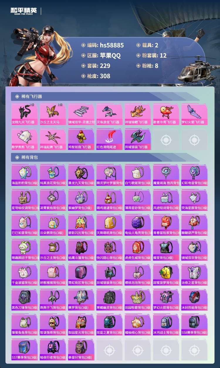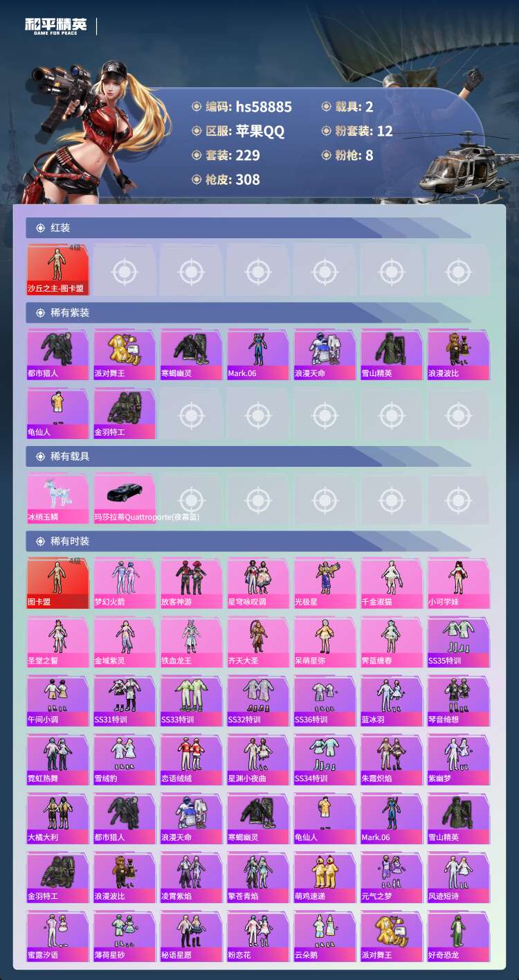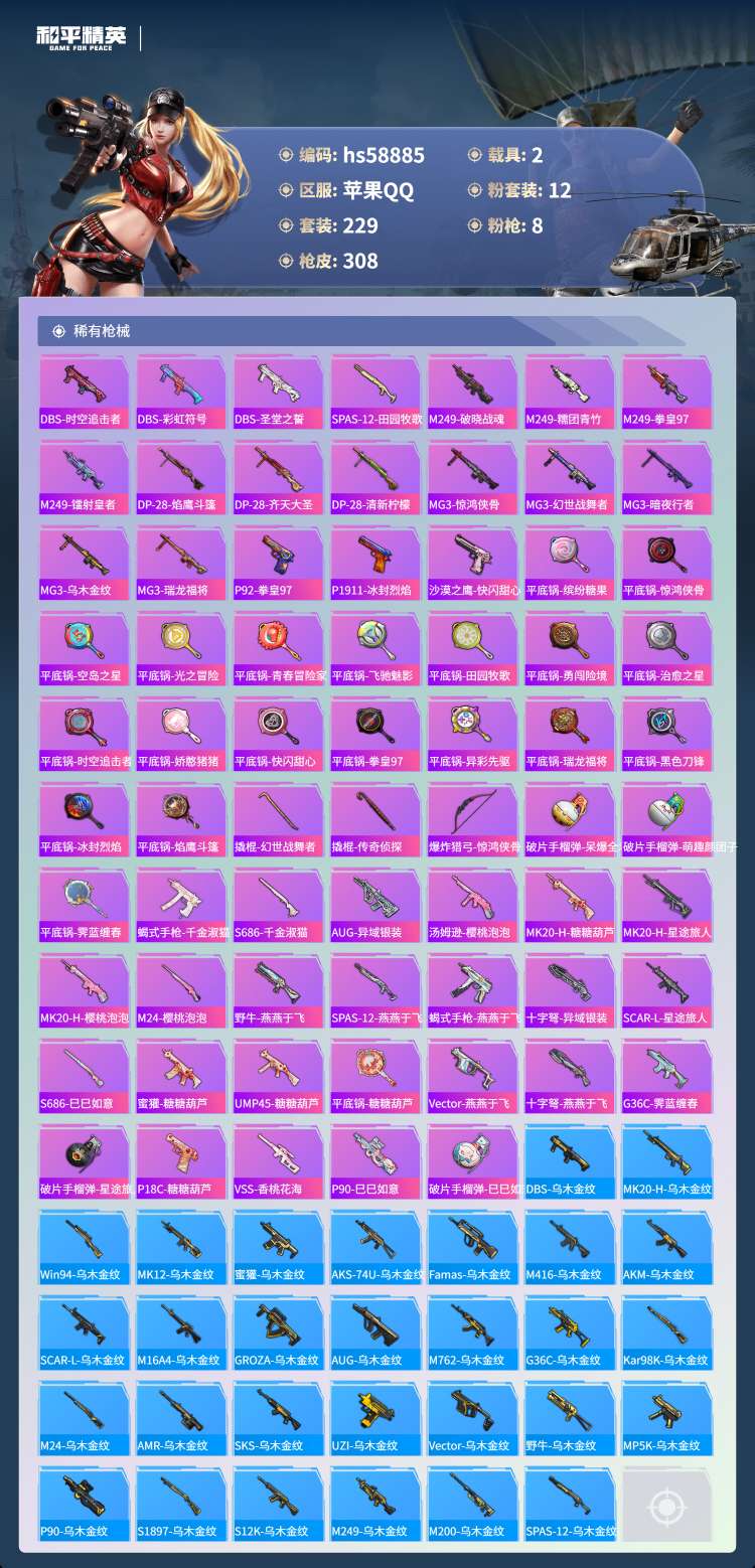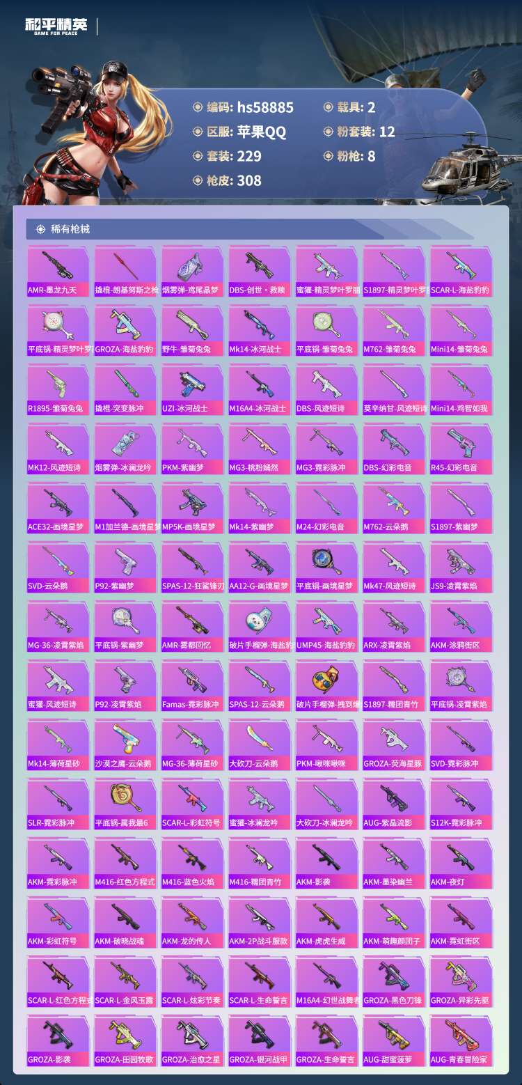 hs58885 苹果手Q-22王牌印记-1红装-12粉装-8特效枪-2载具-101139热力值-22