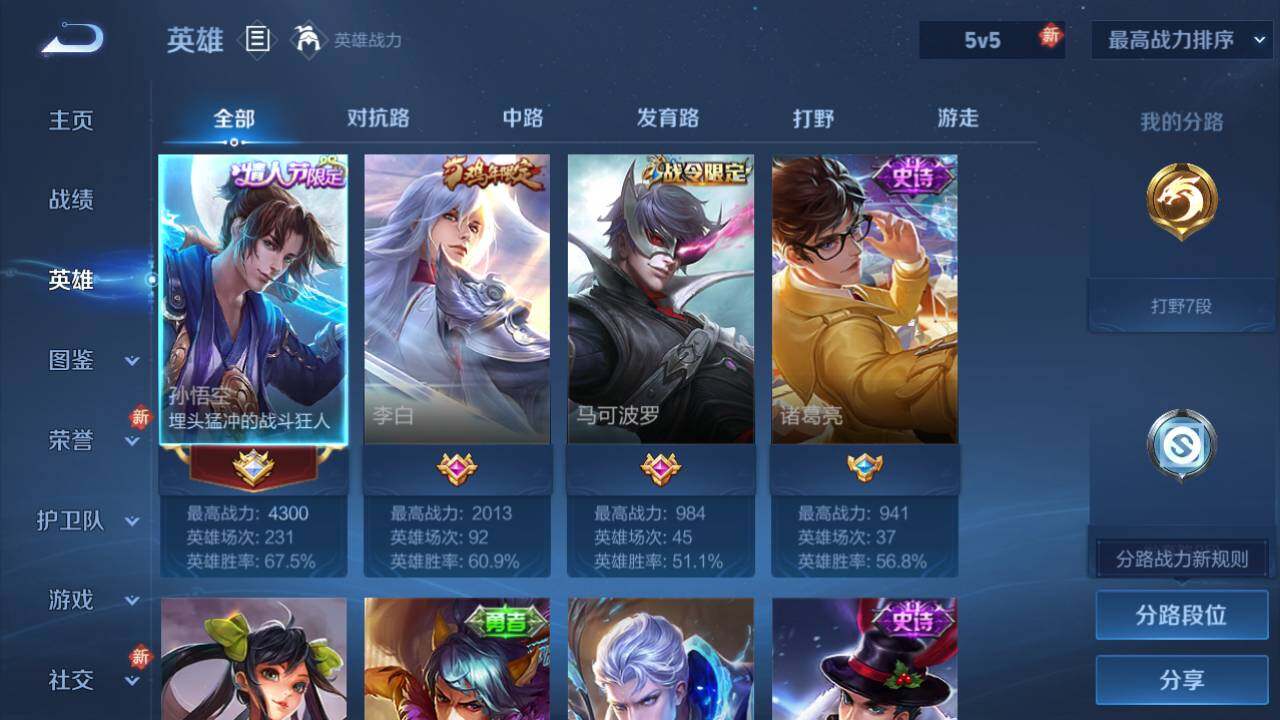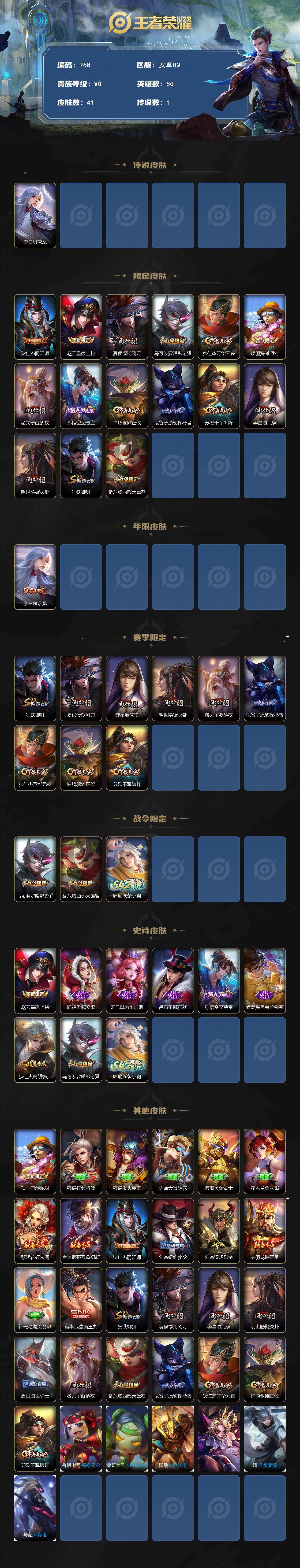 2085907 王者荣耀账号 安卓Q-V0-永恒钻石II段位-80英雄-41皮肤-1传说-8史诗