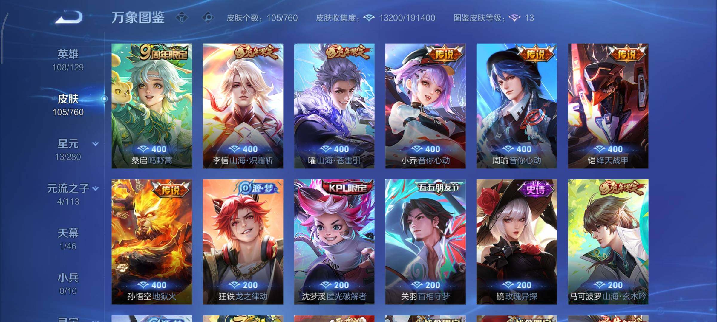【传说皮肤】:桑启鸣野蒿,曜山海苍雷引,李信山海炽霜斩,周瑜音你心动,小乔音你心动,铠绛天战甲,孙悟空地狱火【限定皮肤】:狄仁杰阴阳师,赵云皇家上将,墨子神迹守卫,高渐离玩趣恶龙,孙膑天狼运算者,吕布御风骁将,元歌无心,马可波罗山海玄木吟,狄仁杰魔术师,狄仁杰万华元夜,