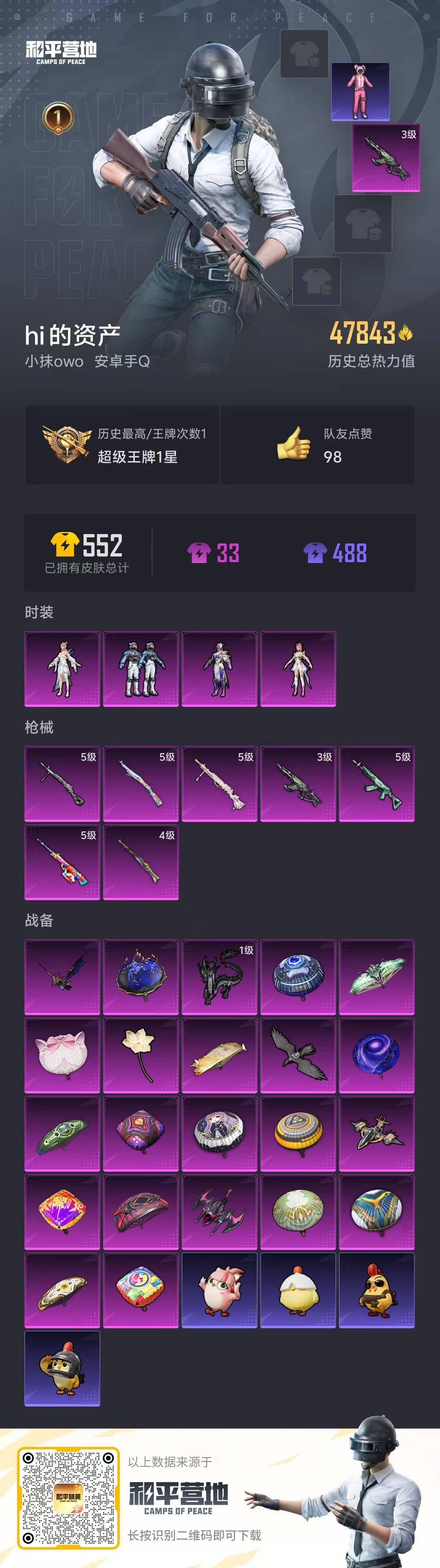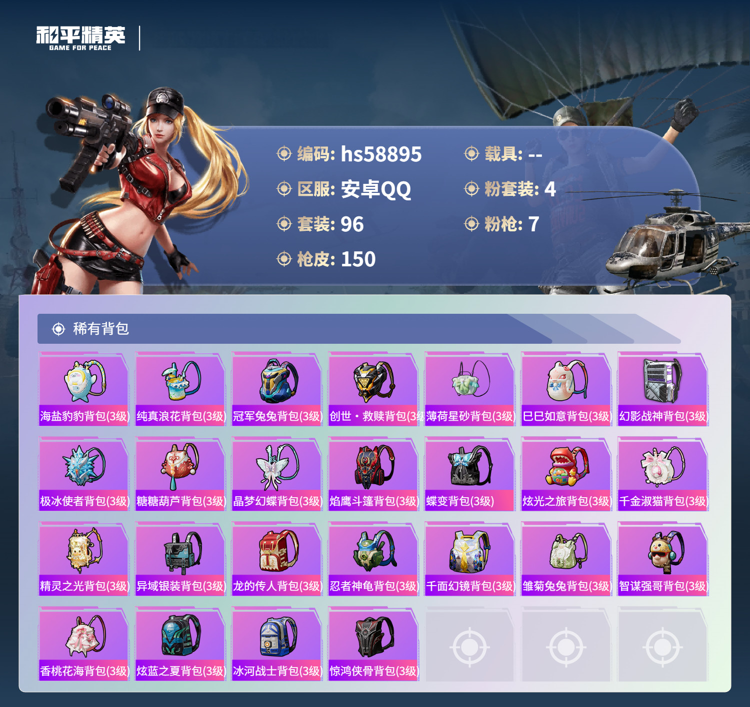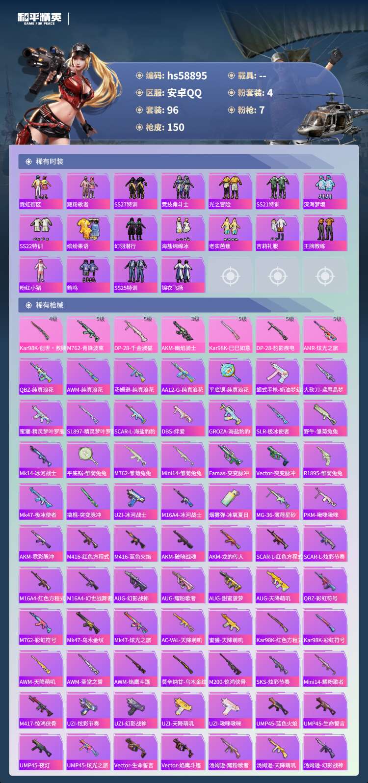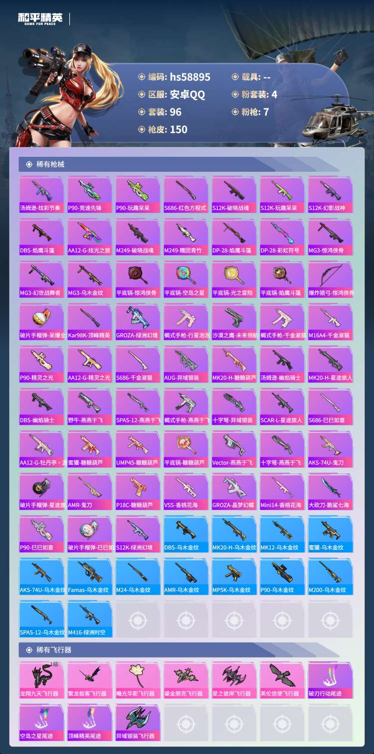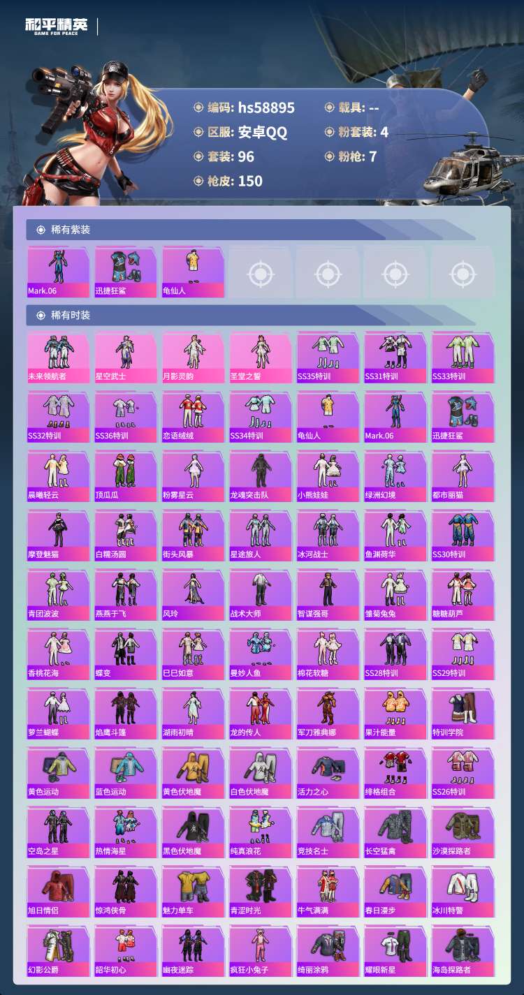 hs58895 安卓手Q-1王牌印记-4粉装-7特效枪-47843热力值-96套装-150枪皮【4粉