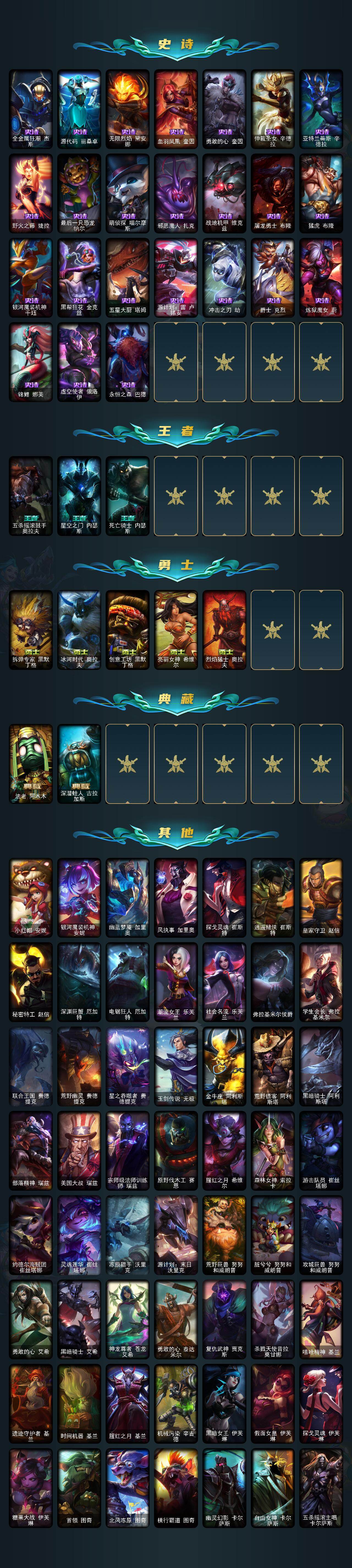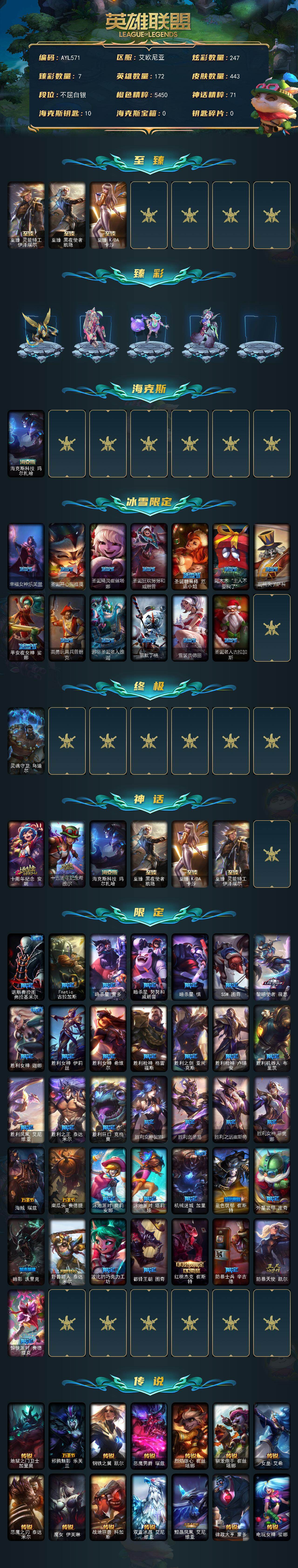 【特价出售/店主推荐】白银段位-172英雄-443皮肤-247炫彩-1终极-6神话-49限定-31传说-108史诗