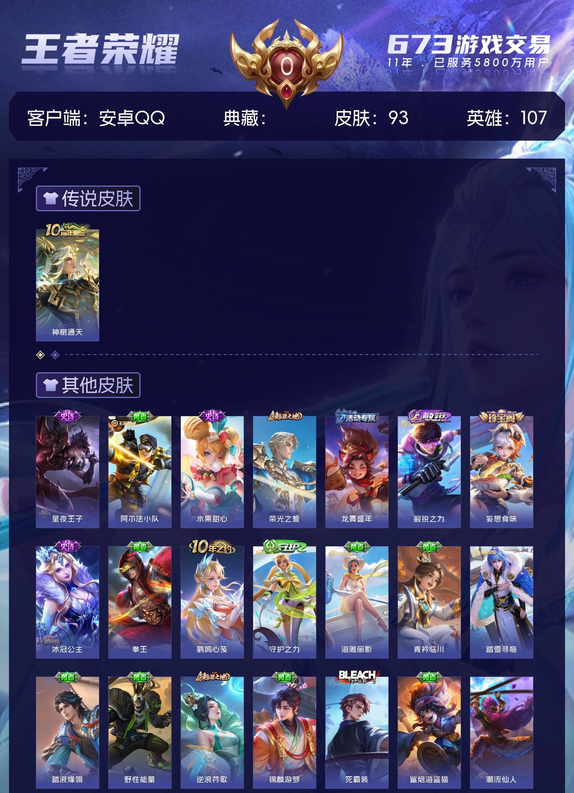 皮肤93 英雄107 至尊星耀 传说1 其他皮肤98