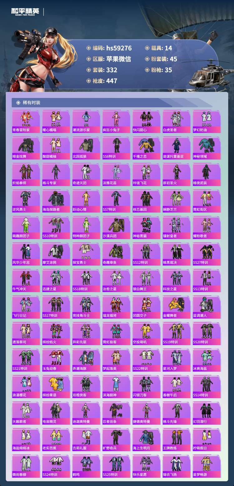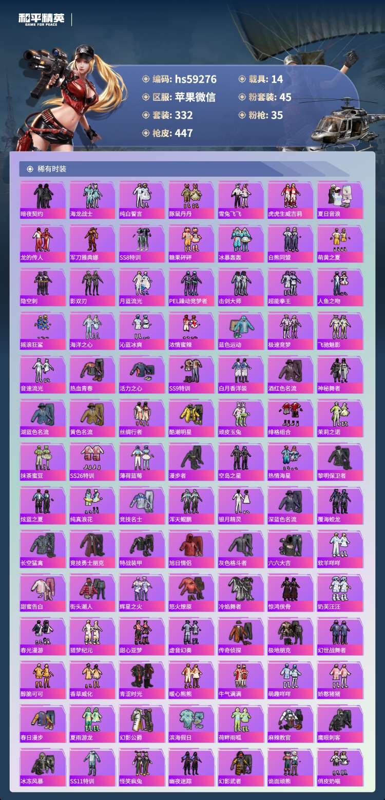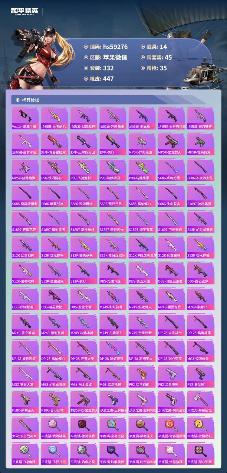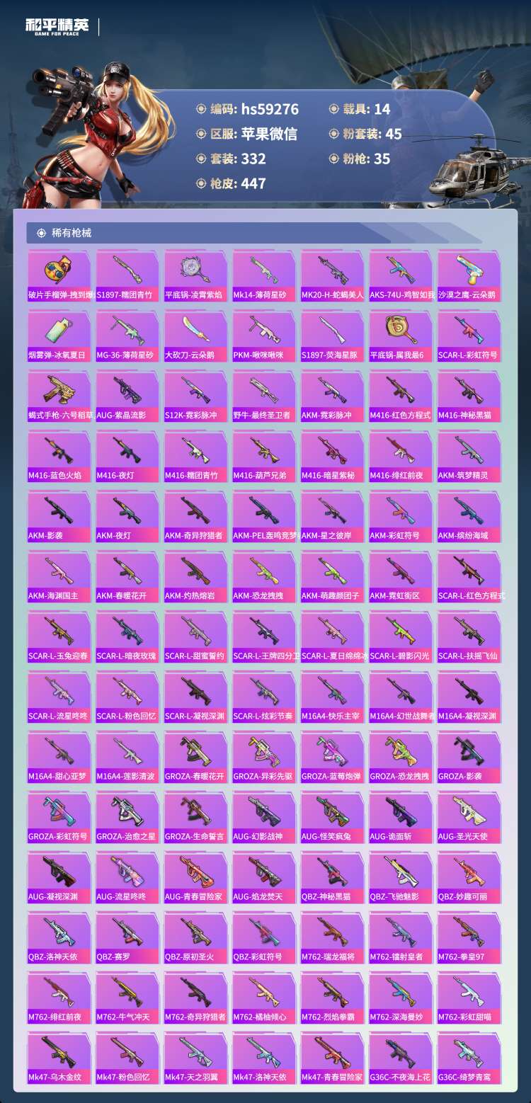 hs59276 苹果微-19王牌印记-45粉装-35特效枪-14载具-218304热力值-332套