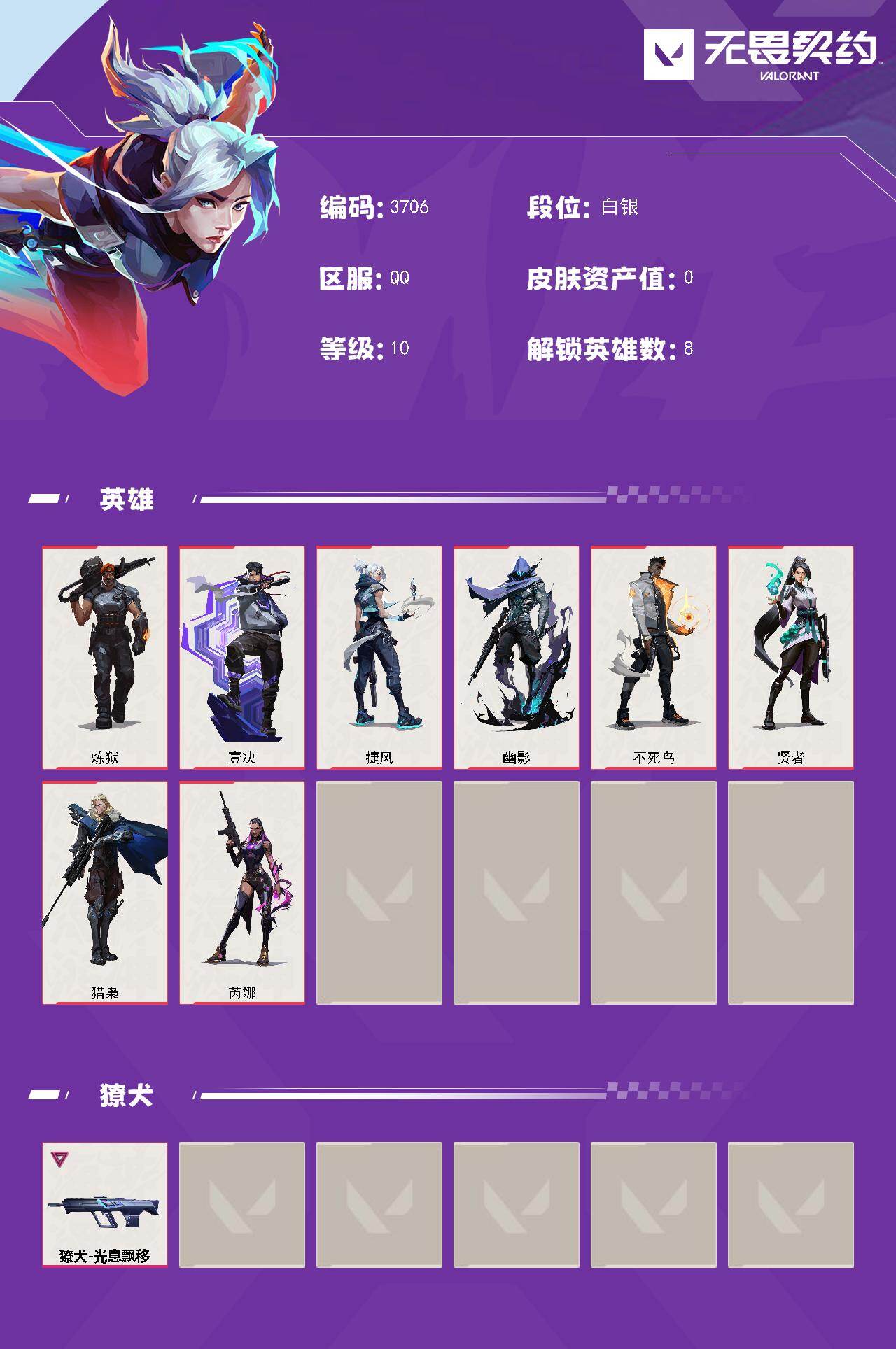 【英雄】:炼狱,壹决,捷风,幽影,不死鸟,贤者,猎枭,芮娜【獠犬】:獠犬-光