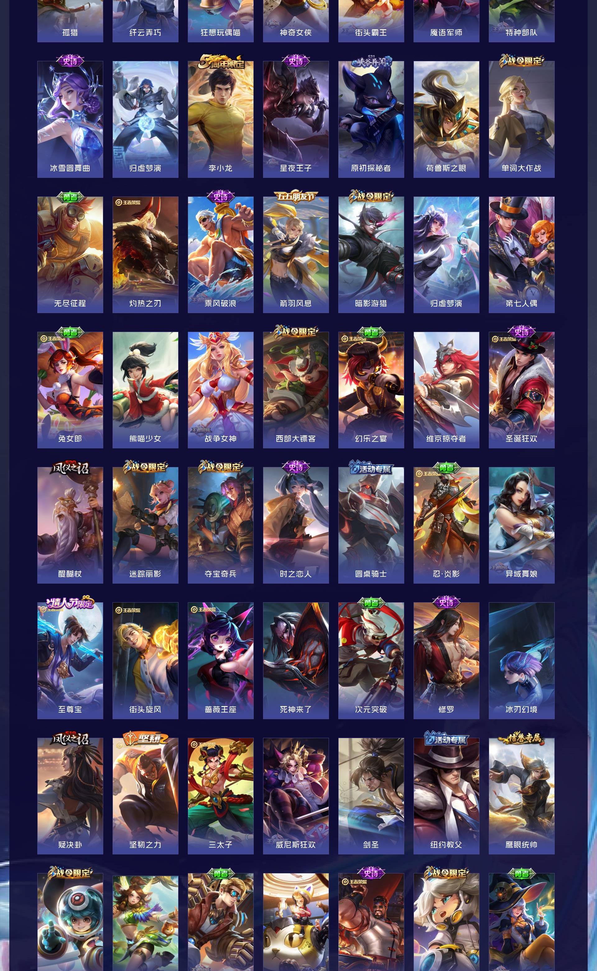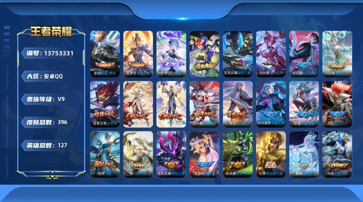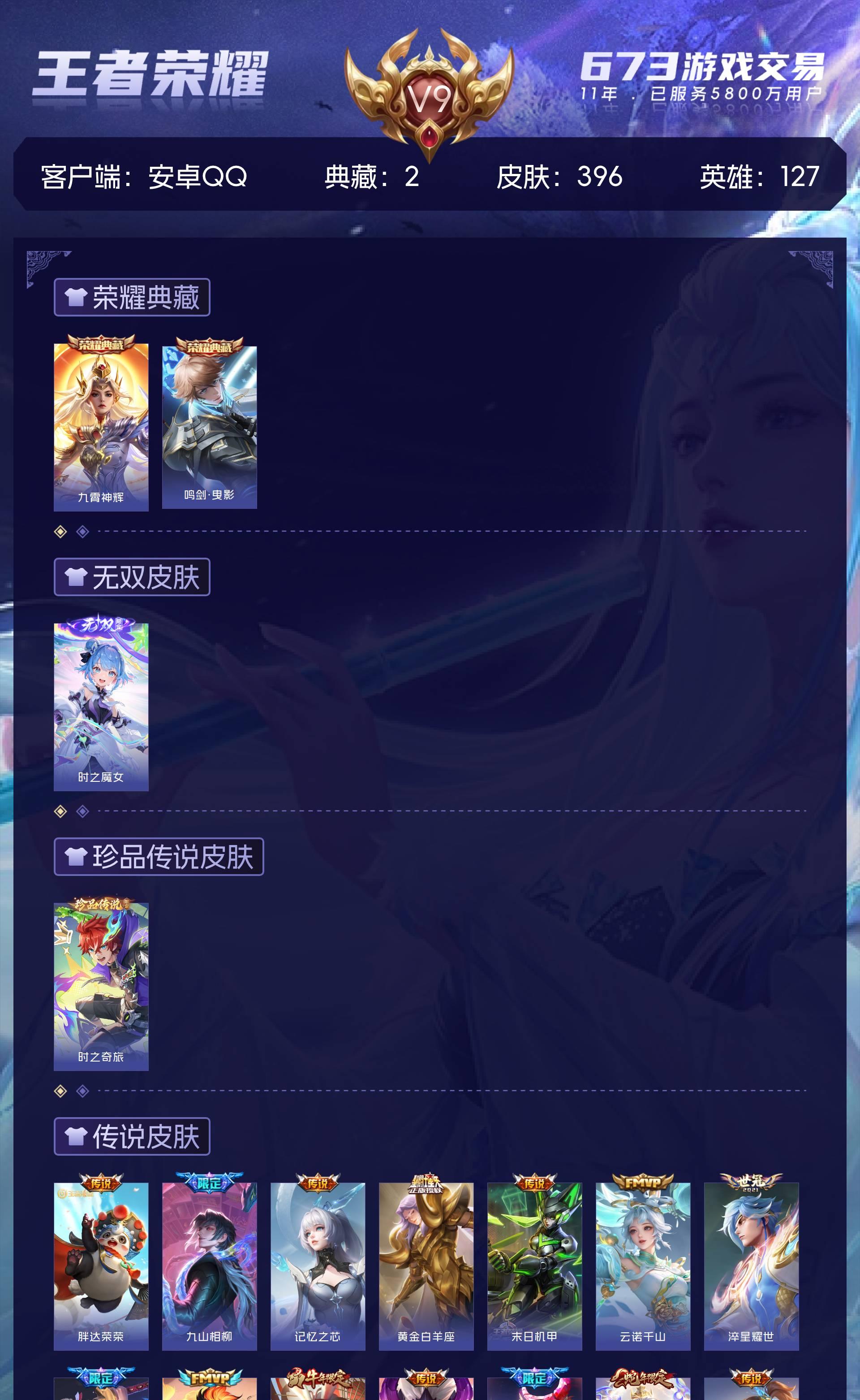 V9 皮肤396 英雄127 无双王者 荣耀典藏2 无双皮肤1 珍品传说1 传说34 其他皮肤364