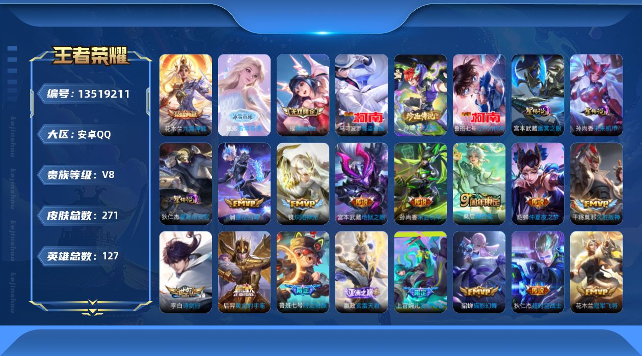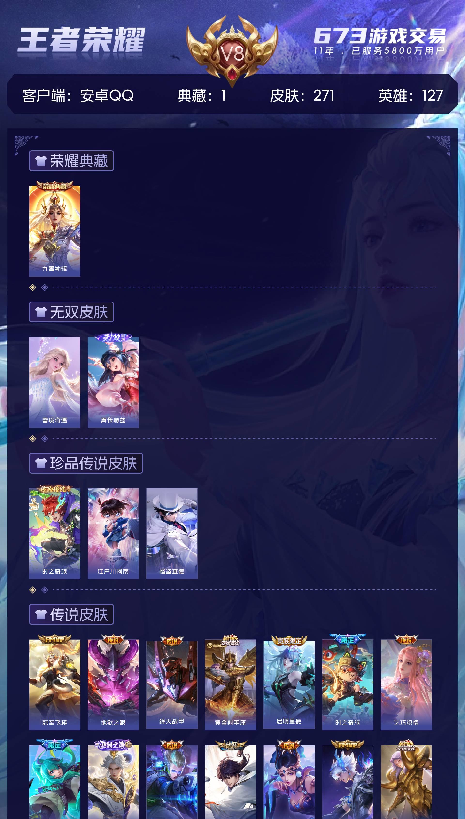 V8 皮肤271 英雄127 最强王者 荣耀典藏1 无双皮肤2 珍品传说3 传说20 其他皮肤251
