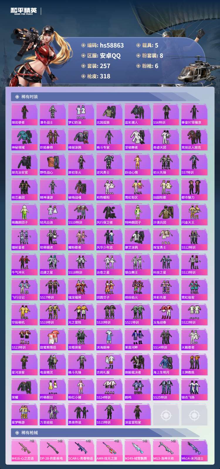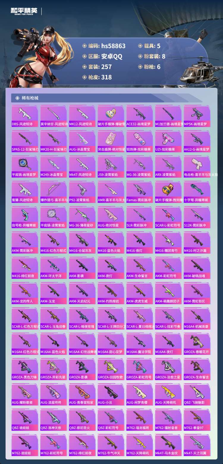 hs58863 安卓手Q-22王牌印记-8粉装-6特效枪-5载具-109135热力值-257套装-3
