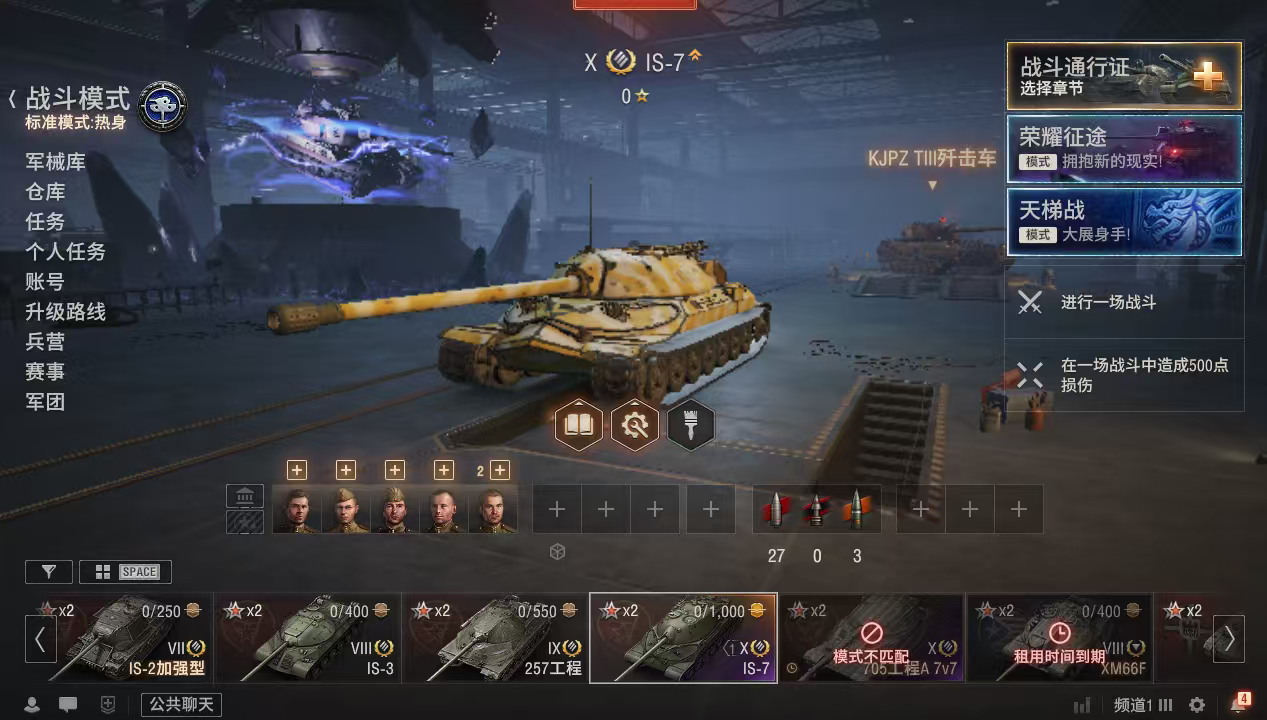 3辆10级银币车:爆裂者、IS7、试验型重战车6-9级银币车:12辆 银币700万