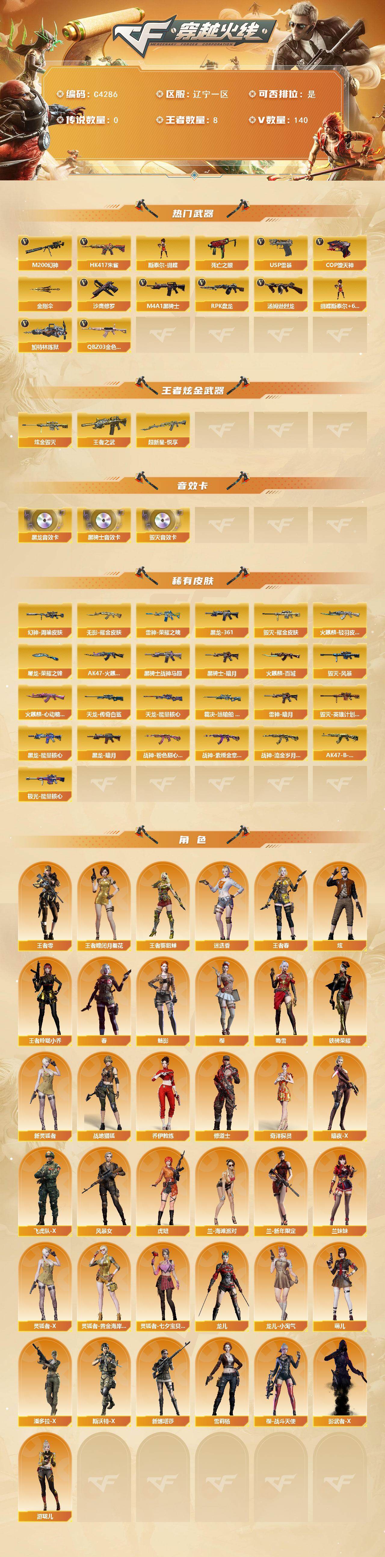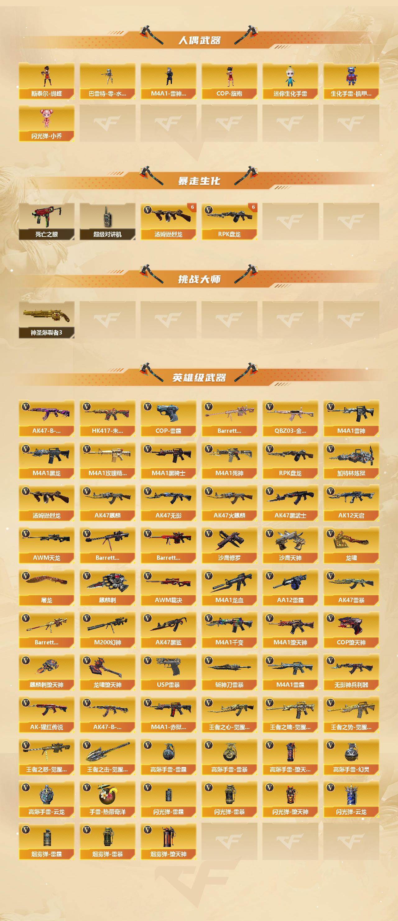 【热门武器】:QBZ03-金色蔷薇,HK417-朱雀,M200-幻神,死亡之眼,M4A1-黑骑士,汤姆逊-烈龙*6,RPK-盘龙*6,加特林-炼狱*2,斯泰尔-蝴蝶,USP-雷暴,COP-堕天神,沙鹰-修罗*4,金刚伞