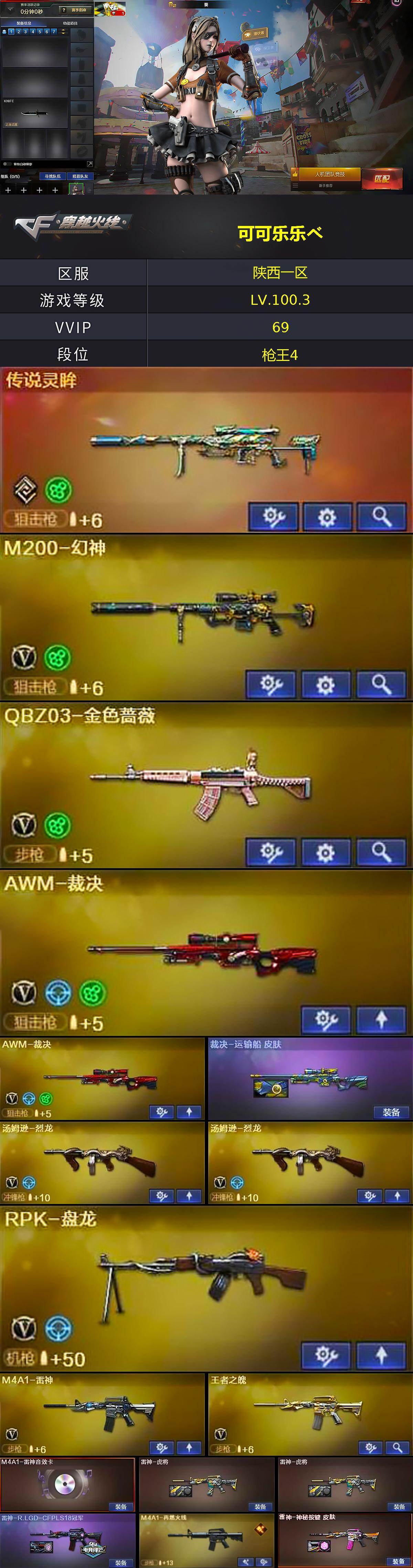 【热门武器】:传说灵眸,QBZ03-金色蔷薇,HK417-朱雀,M200-幻神,死亡之眼,M4A1-黑骑士,汤姆逊-烈龙*2,RPK-盘龙,加特林-炼狱*5,羊驼玩偶*4,毁灭-孙三炮,沙鹰-修罗*2