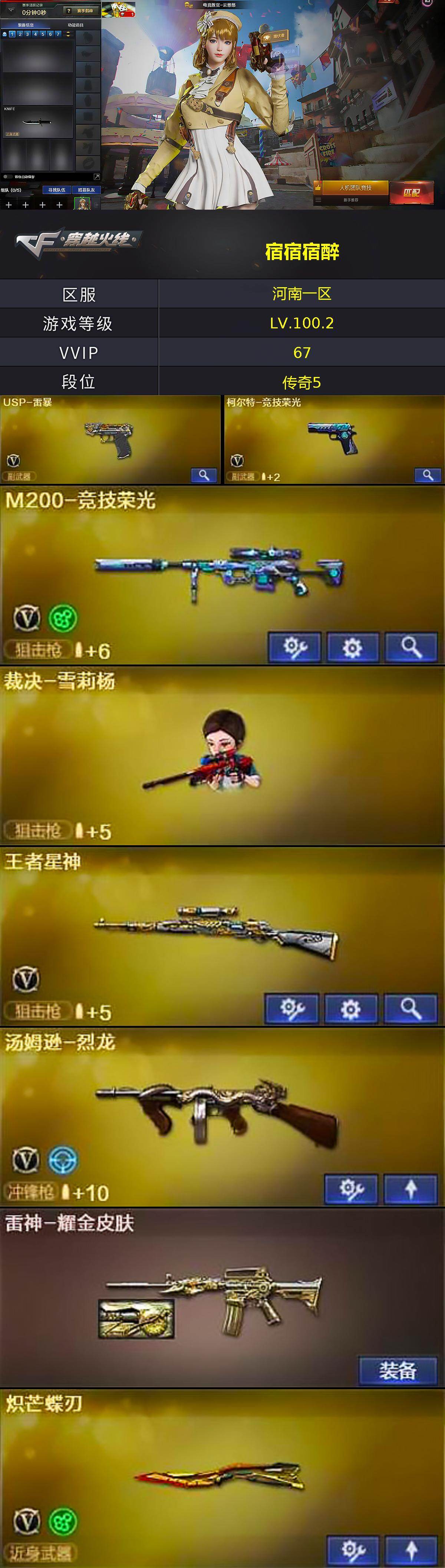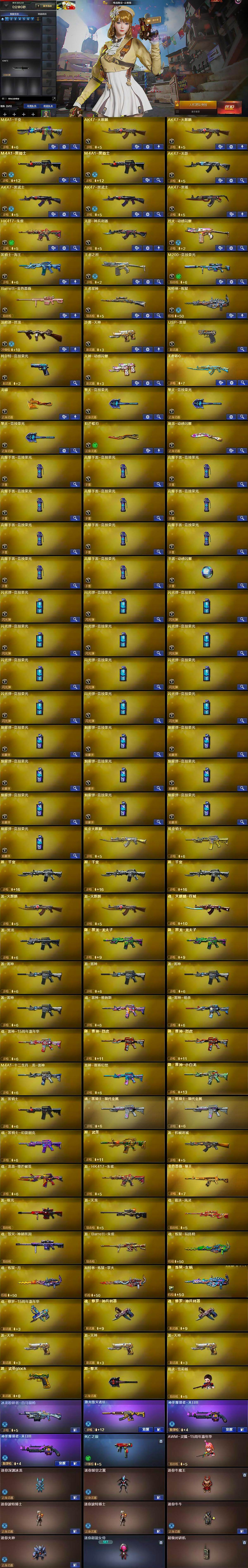 【热门武器】:HK417-朱雀,M200-竞技荣光,死亡之眼,M4A1-黑骑士*2,汤姆逊-烈龙,加特林-炼狱,裁决-雪莉杨,USP-雷暴,炽芒蝶刃