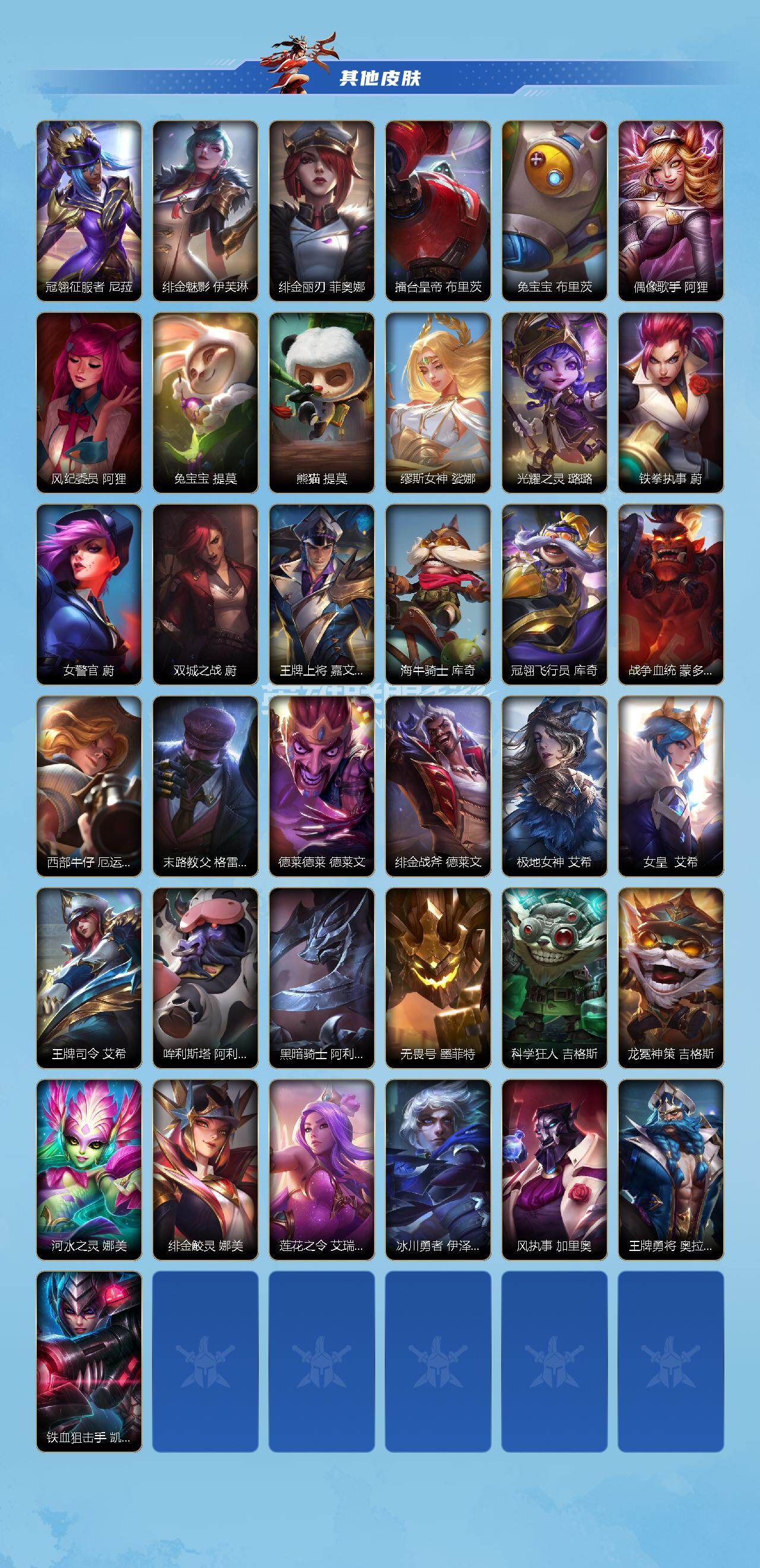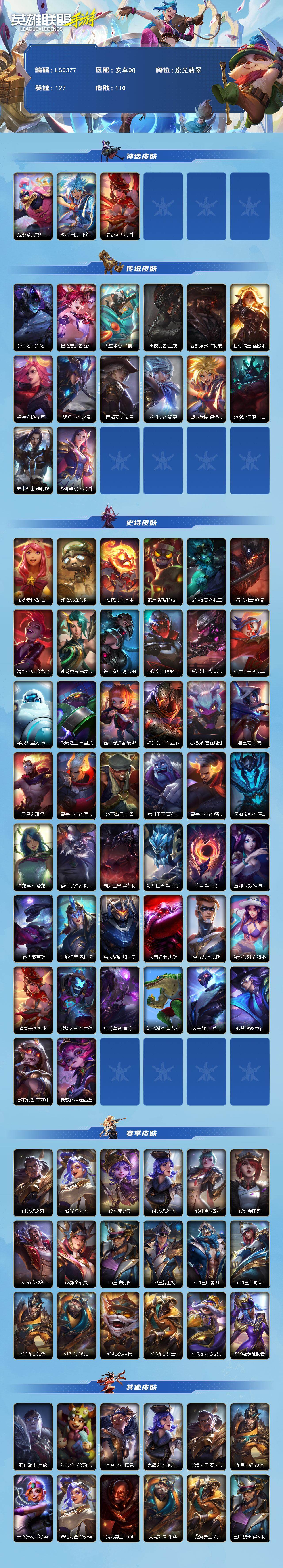 【LSC377】127英雄/110皮肤/流光翡翠/巡游踏云霄! 墨菲特/战斗学院 白金学长 伊泽瑞尔/蝶恋春 凯特琳/源计划:净化 薇恩/星之守护者 金克丝/太空律动 “猫猫”布里和里茨 布里茨/黑夜使者 亚索/西部魔影 卢锡安/日蚀骑士 蕾欧娜/福牛守护者 厄运小姐/黎明使者 永恩/西部天使 艾希/黎明使者 锐雯/战斗学院 伊泽瑞尔/地狱之门卫士 加里奥/未来战士 凯特琳/战斗学院 凯特琳/睡衣守护者 拉克丝/殇之机器人 阿木木/地狱火 阿木木/丧尸 努努和威朗普/地狱行者 孙悟空/猎龙勇士