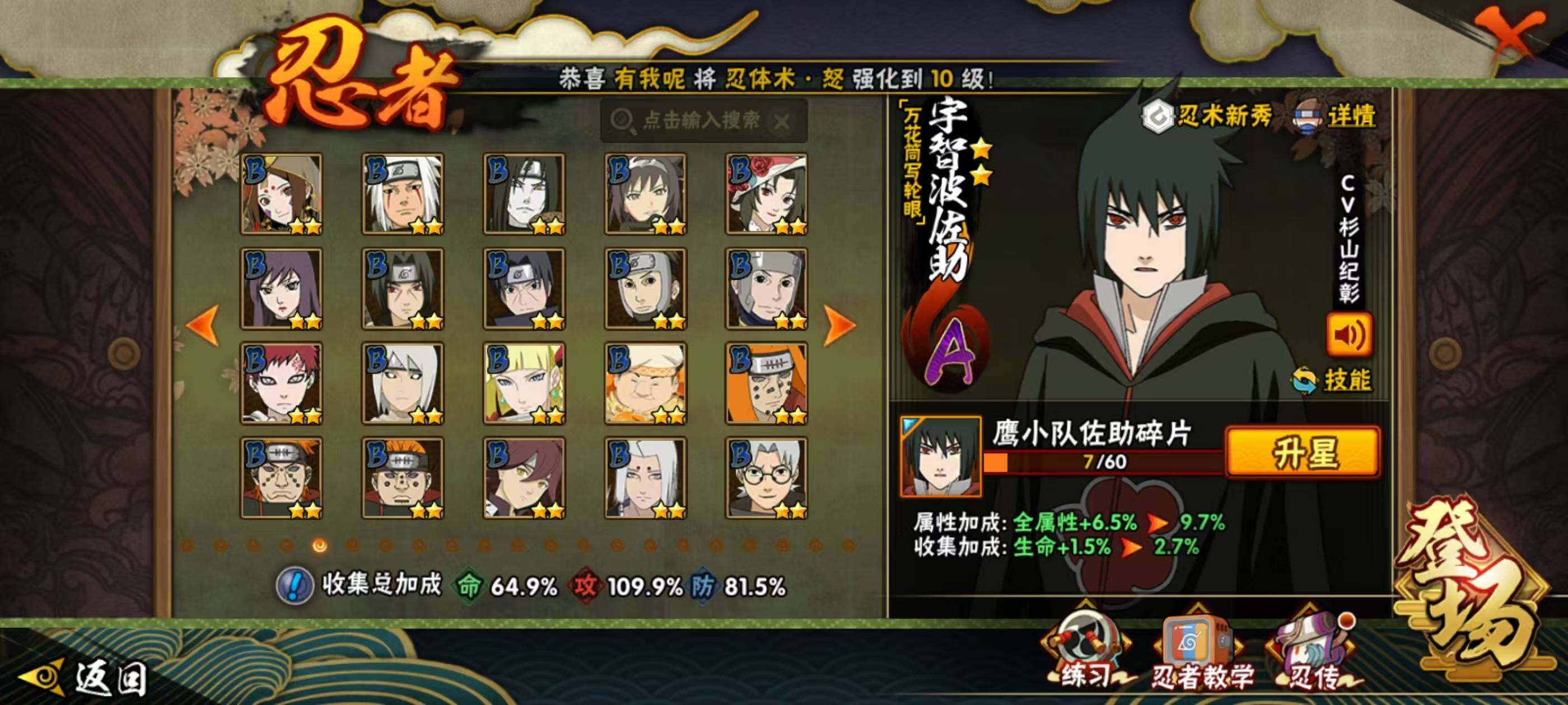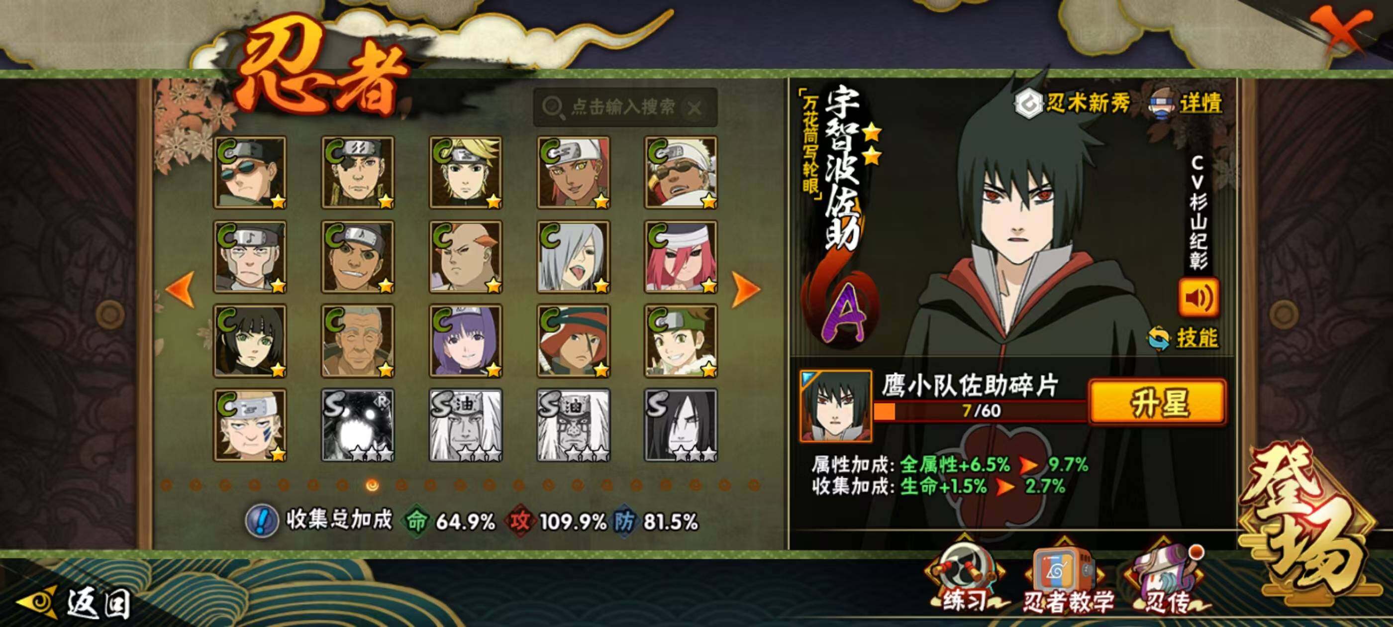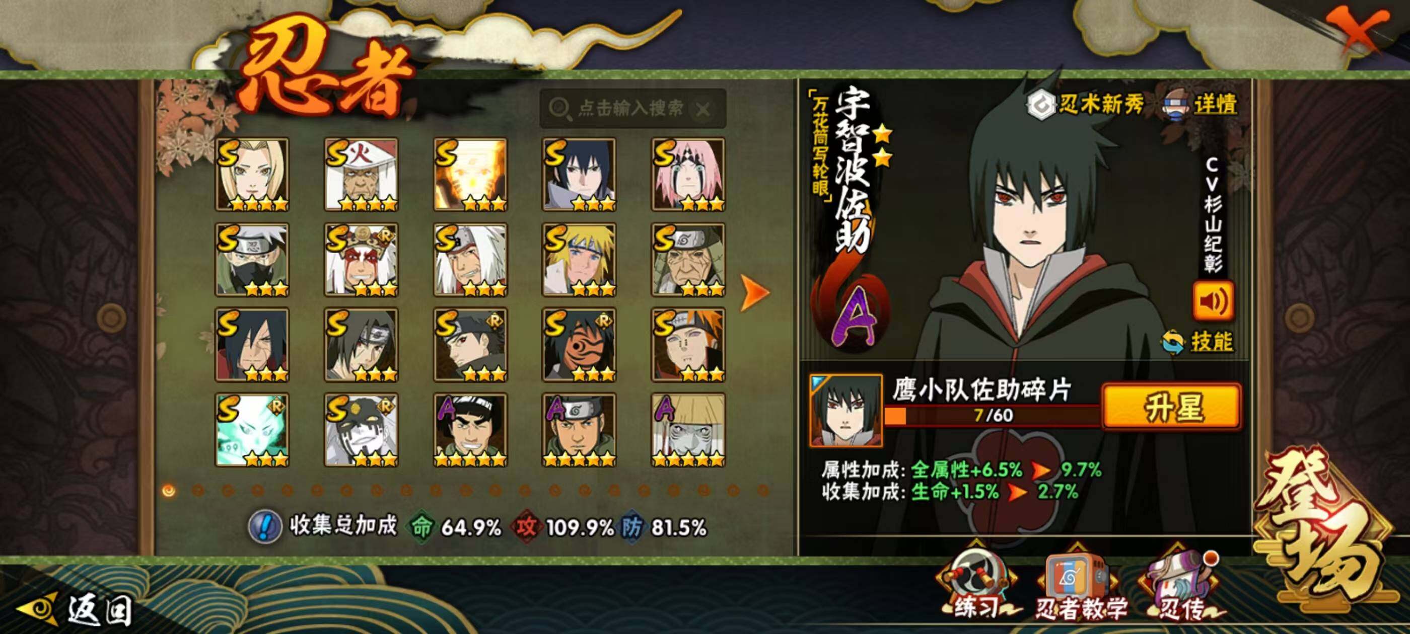 【S级】宇智波佐助「永恒万花筒」 大筒木桃式 漩涡鸣人「九喇嘛连结」 猿飞日斩「秽土转生」 自来也「传说中的三忍」 纲手 春野樱「忍界大战」 波风水门 猿飞日斩 佩恩「天道」 宇智波止水「须佐能乎」 大筒木舍人「最终章」 宇智波斑「秽土转生·解」 自来也「舞之豪杰」 旗木卡卡西「须佐能乎」 宇智波鼬「须佐能乎」 神秘面具男「红夜之刃」