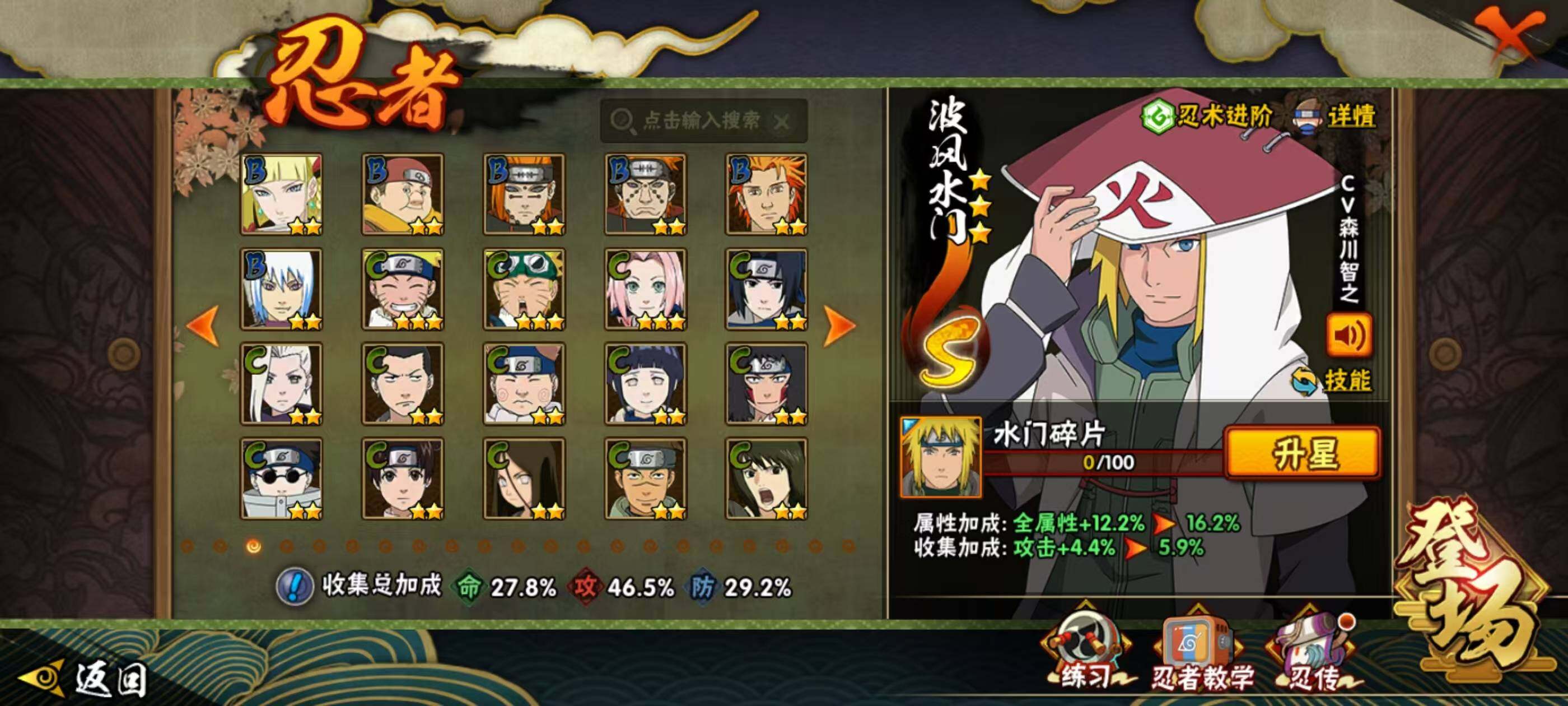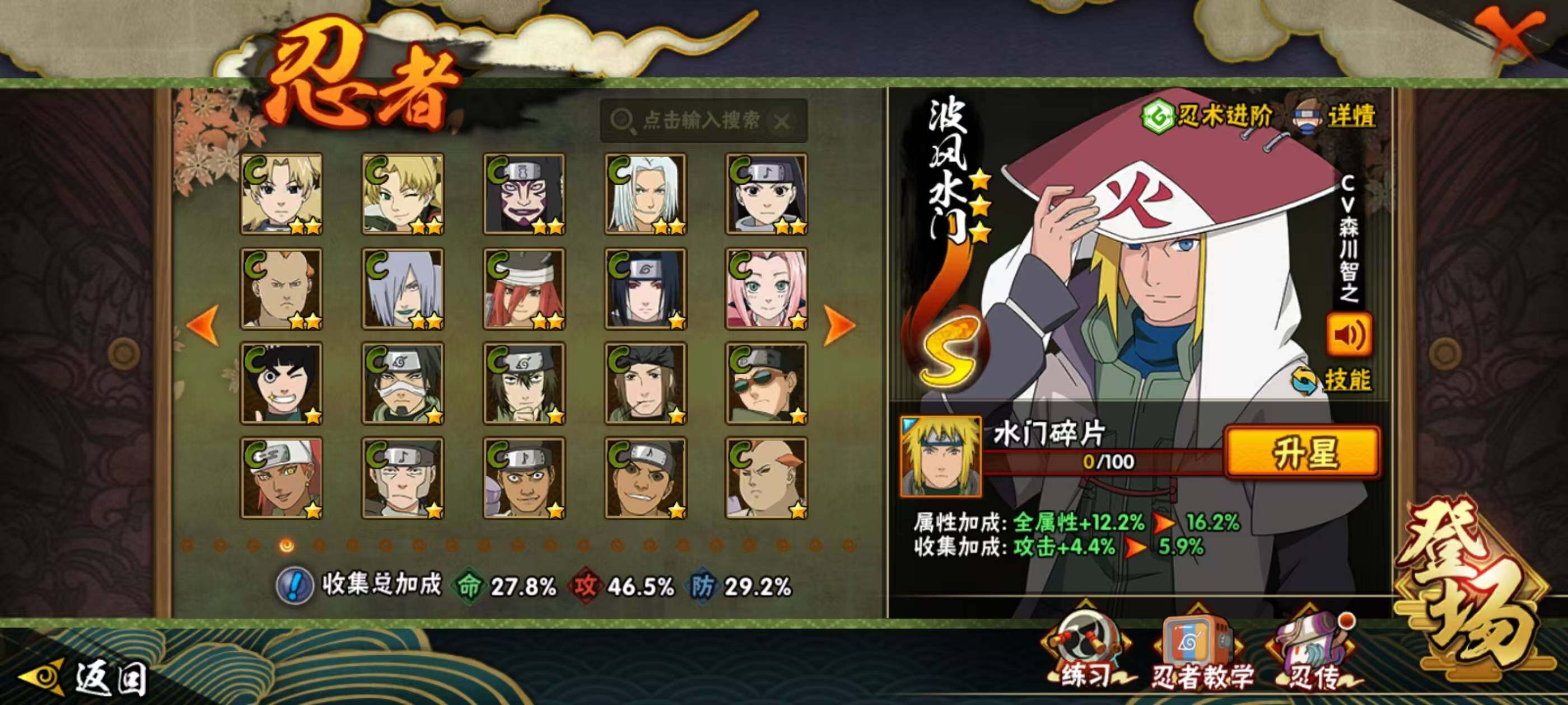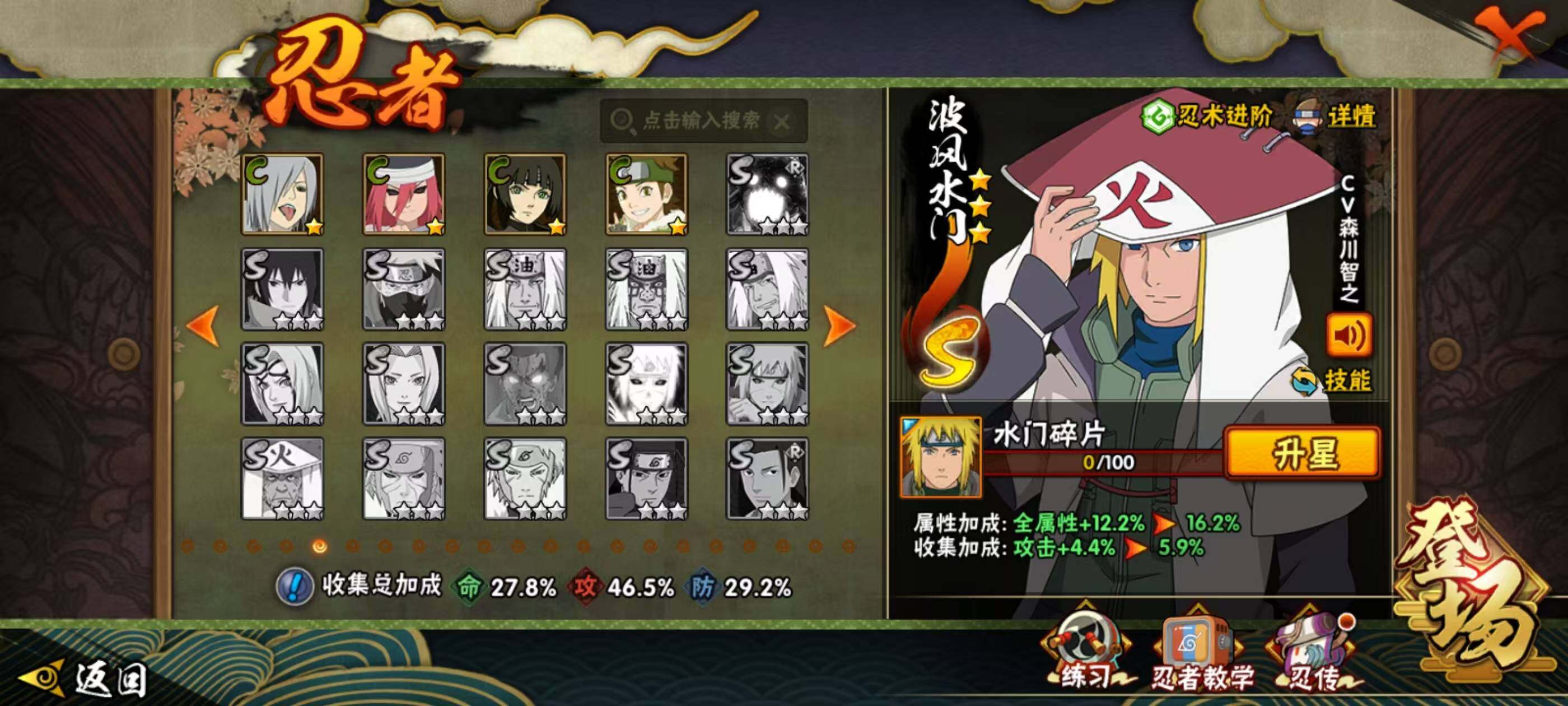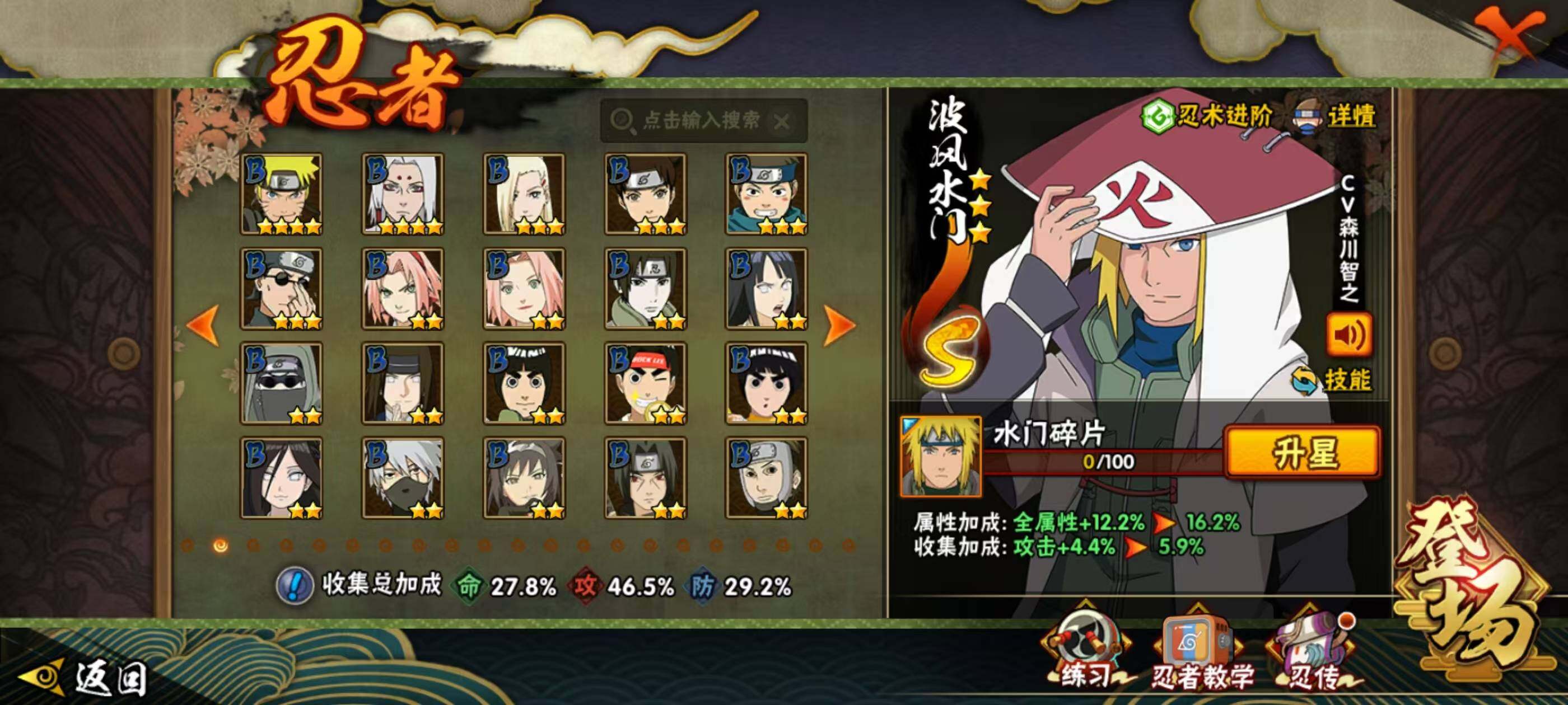 【S级】大蛇丸 宇智波斑「白面具」 猿飞日斩「秽土转生」 漩涡鸣人「九喇嘛连结」 春野樱「忍界大战」 波风水门 佩恩「天道」 自来也「舞之豪杰」 宇智波鼬「须佐能乎」