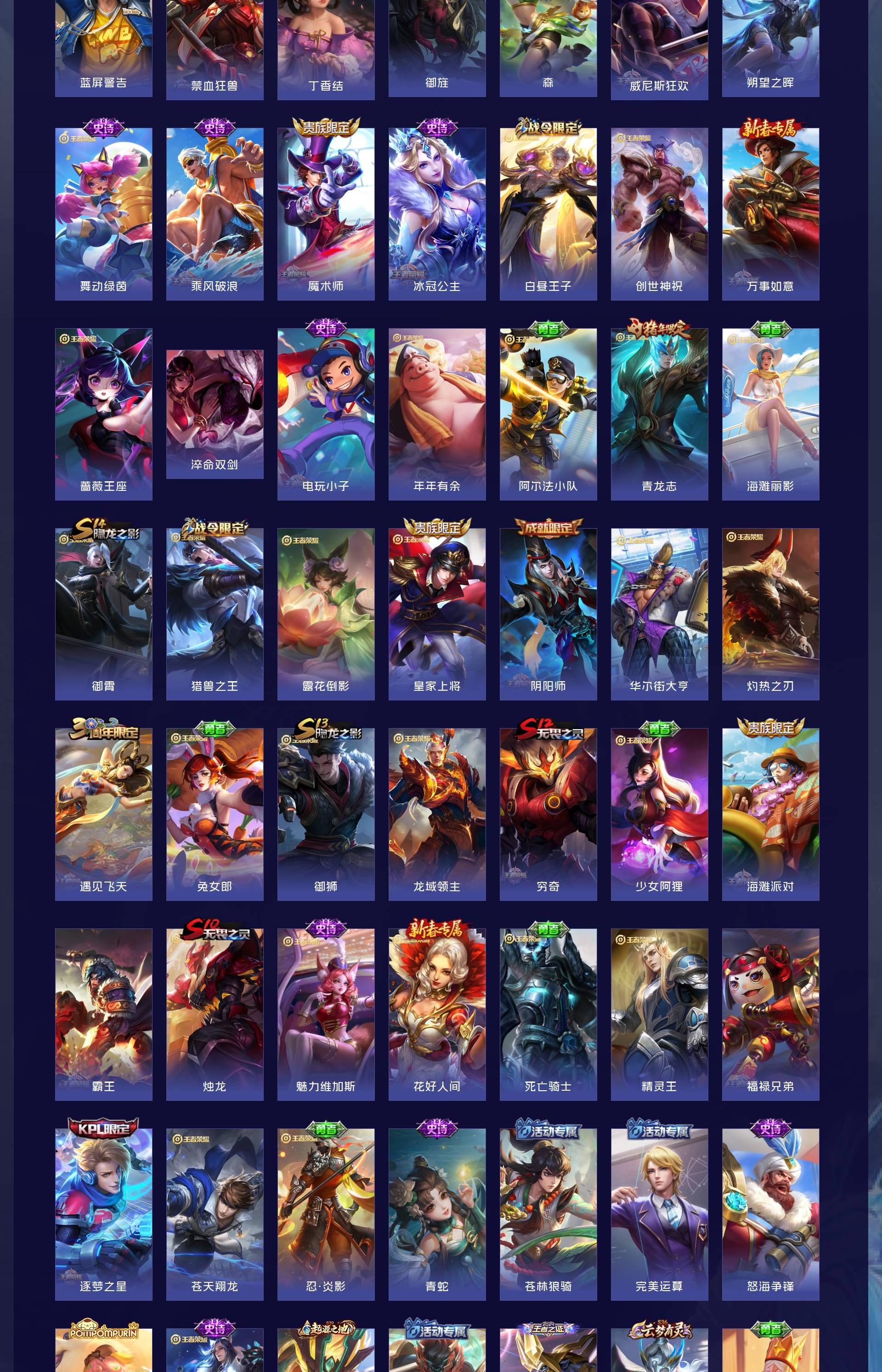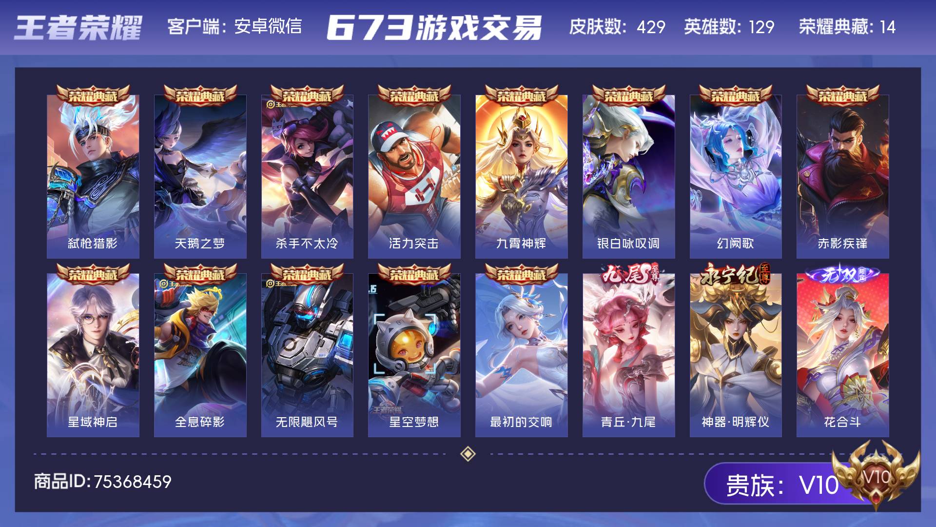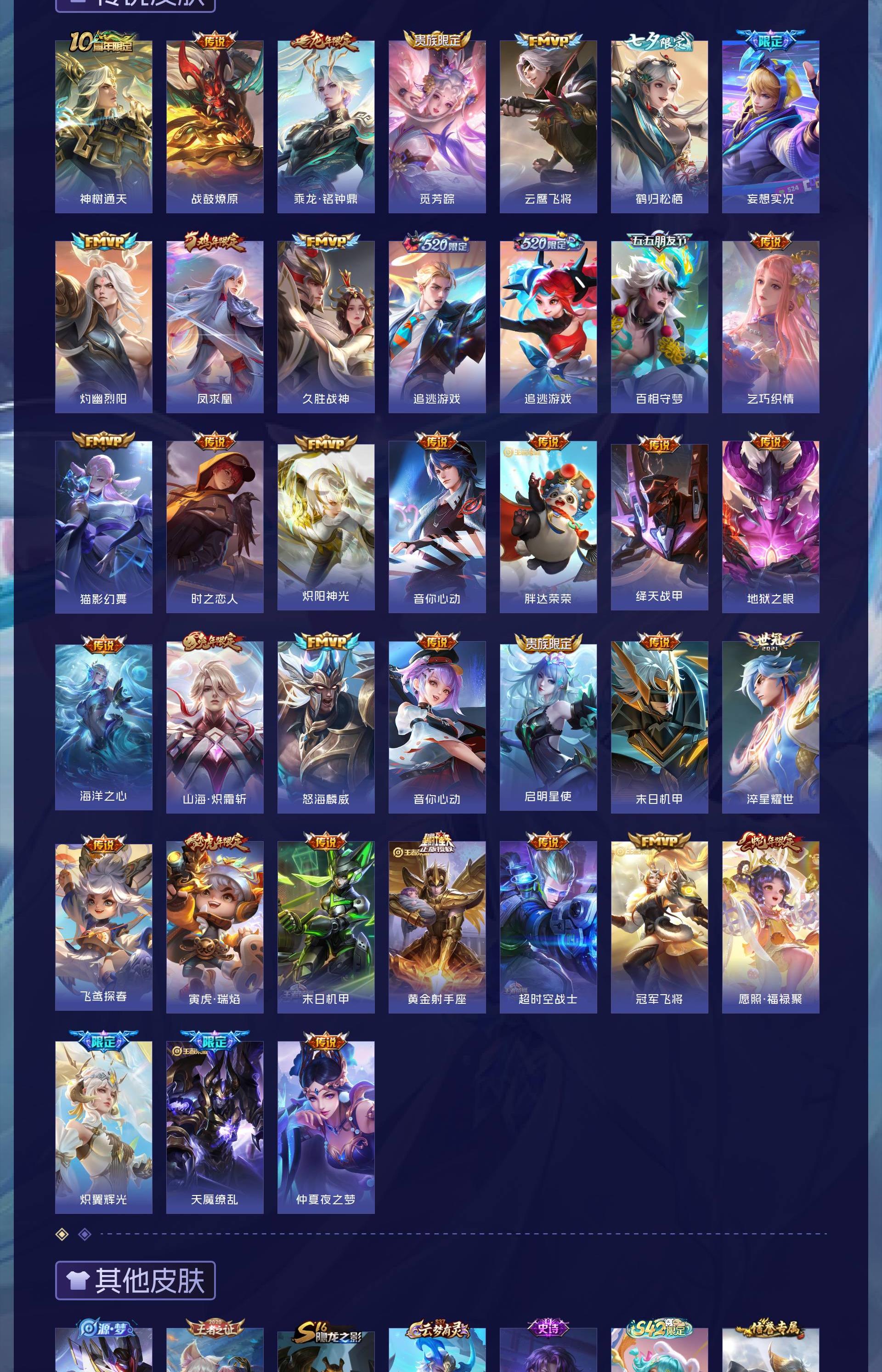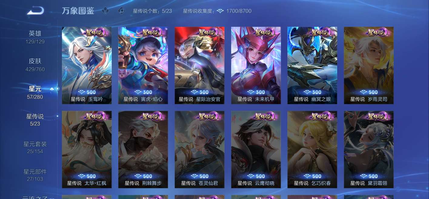 V10 皮肤429 英雄129 非凡王者 荣耀典藏14 无双皮肤3 珍品传说1 星传说6 传说38 其他皮肤378