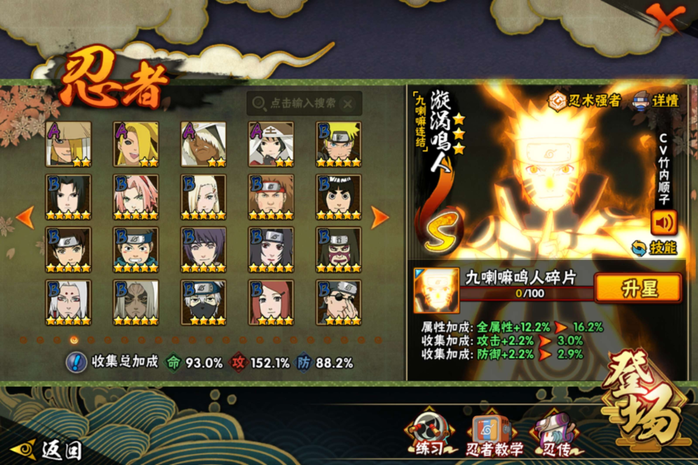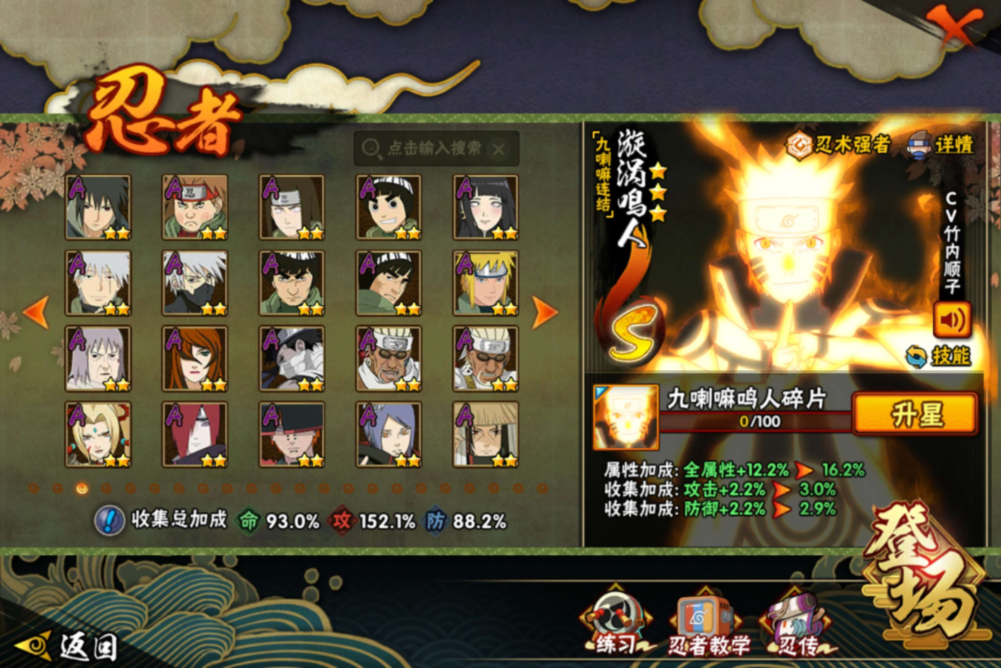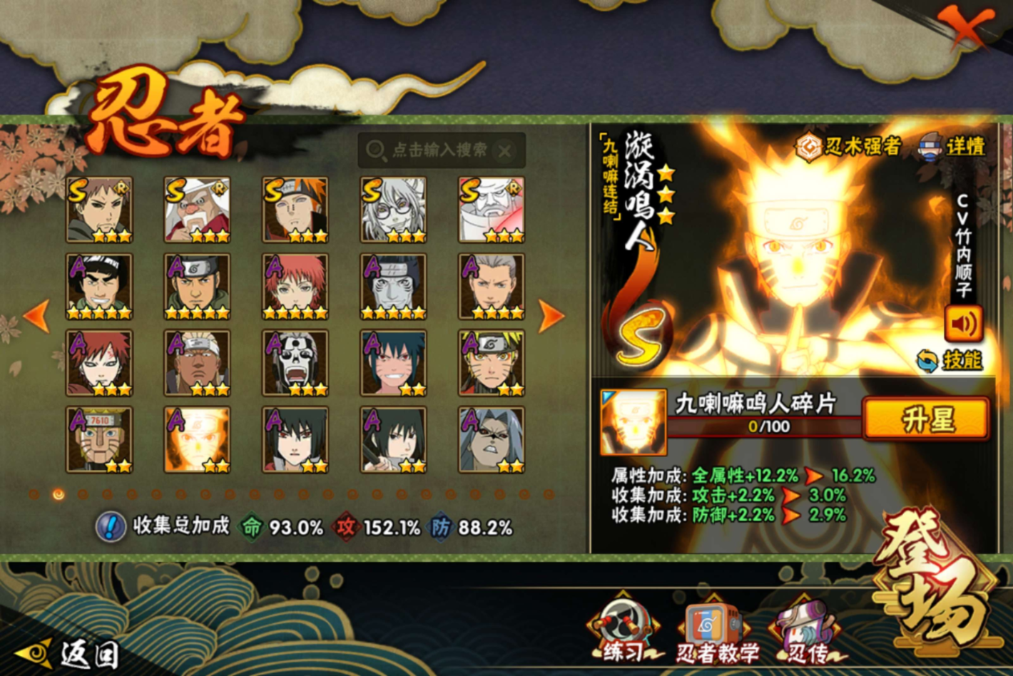 【S级忍者】宇智波带土「忍界大战」(3星),宇智波斑「木叶创立」(3星),迈特凯「死门」(3星),宇智波佐助「永恒万花筒」(3星),大筒木金式(3星),春野樱「忍界大战」(3星),千手柱间「秽土转生」(3星),漩涡鸣人「九喇嘛连结」(3星),宇智波斑「白面具」(3星),药师兜「仙人模式」(3星),宇智波斑「秽土转