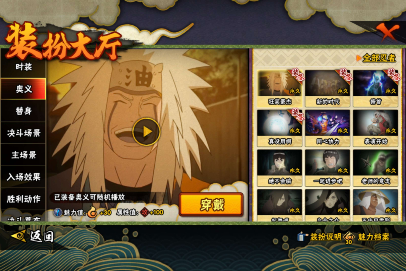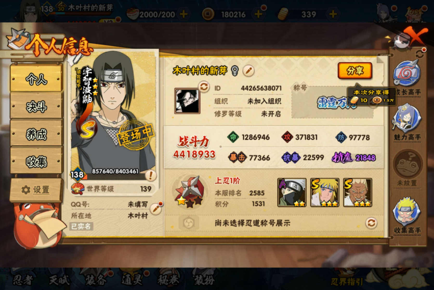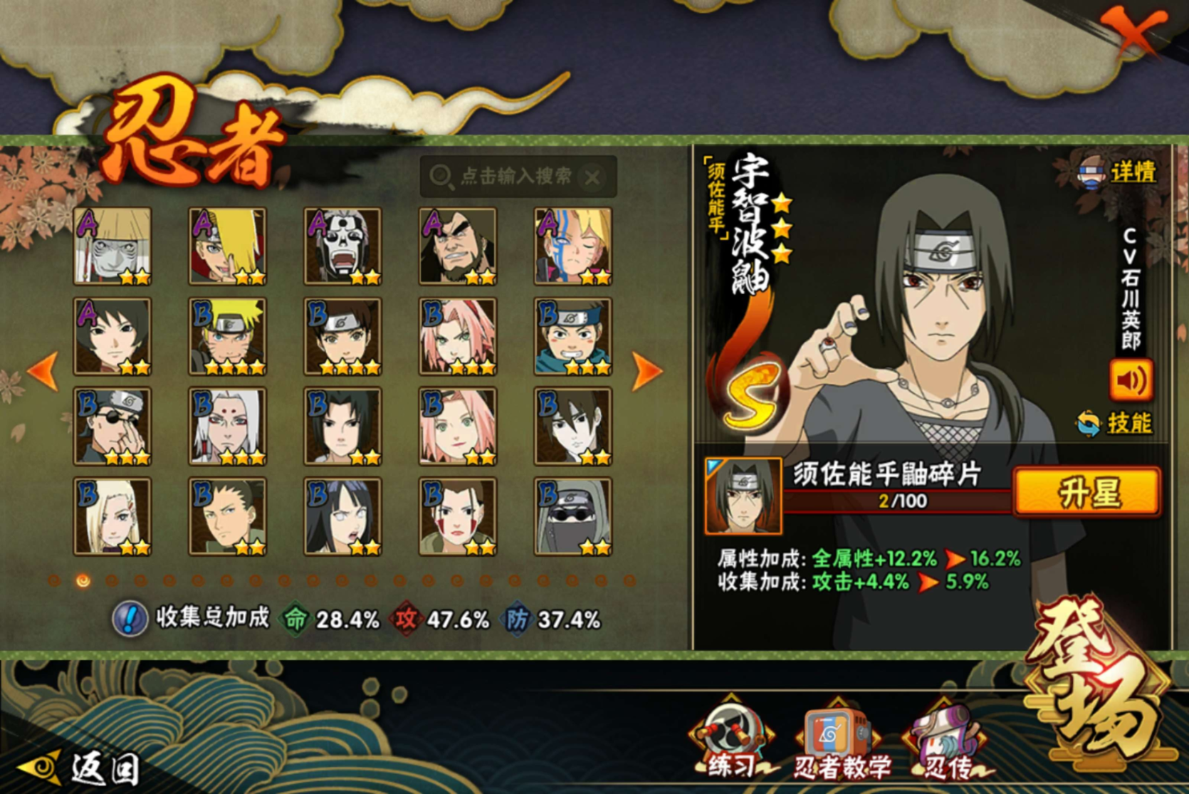【S级忍者】自来也「传说中的三忍」(3星),艾「忍界大战」(3星),自来也「舞之豪杰」(3星),宇智波鼬「须佐能乎」(3星),漩涡鸣人·宇智波佐助(3星),佩恩「天道」(3星),波风水门(3星),猿飞日斩「秽土转生」(3星),
