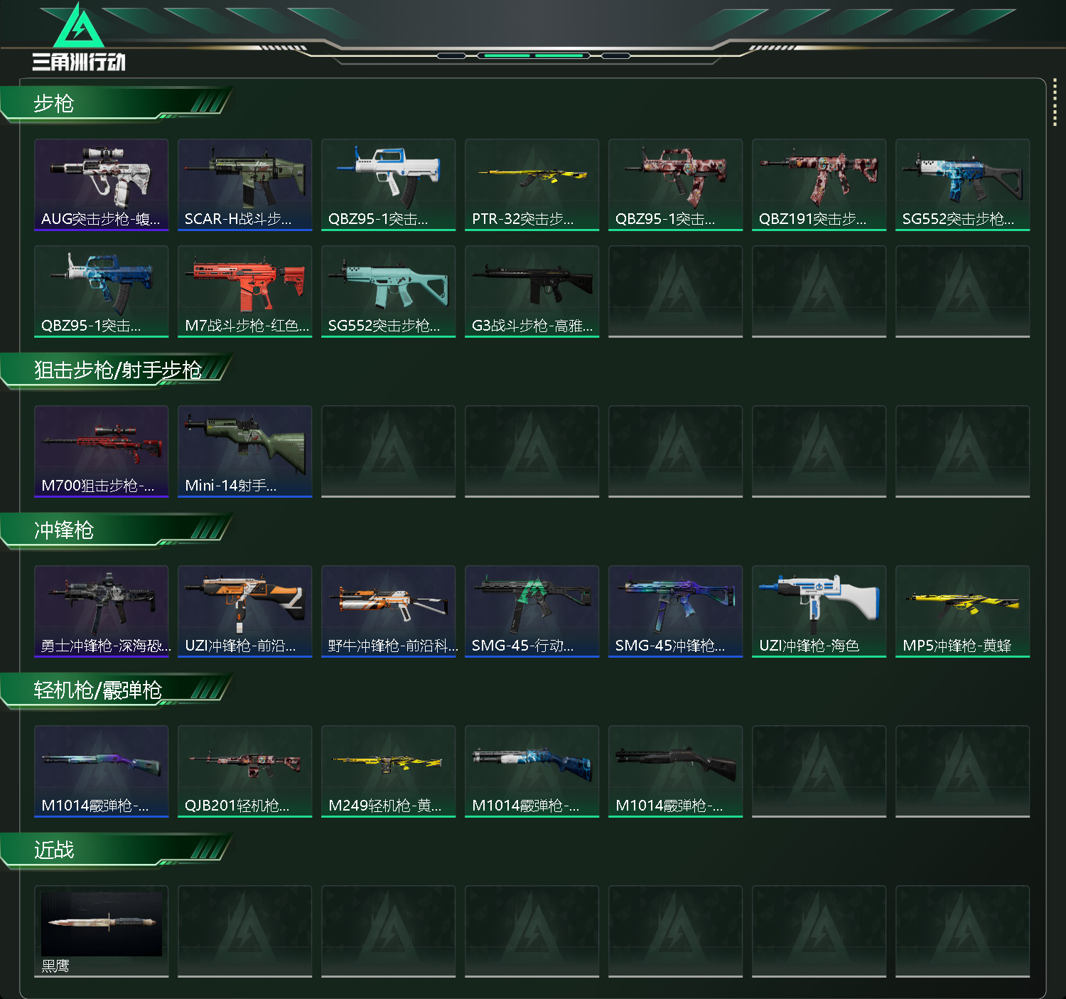 【步枪】AUG突击步枪-蝮蛇,QBZ95-1突击步枪-海色,SCAR-H战斗步枪-荣耀列队,PTR-32突击步枪-黄蜂,QBZ95-1突击步枪-三角洲力量,QBZ191突击步枪-三角洲力量,SG552突击步枪-海浪,QBZ95-1突击步枪-海浪,M7