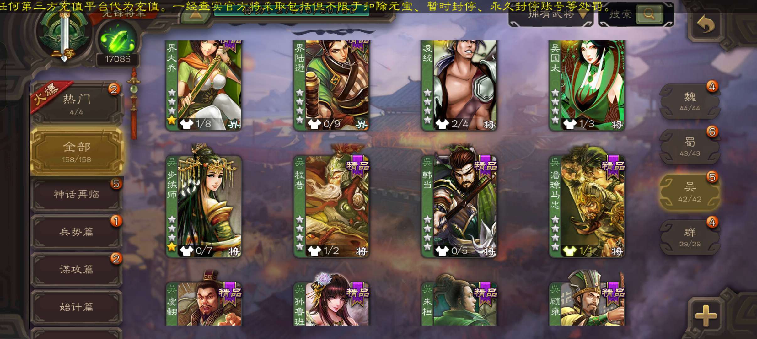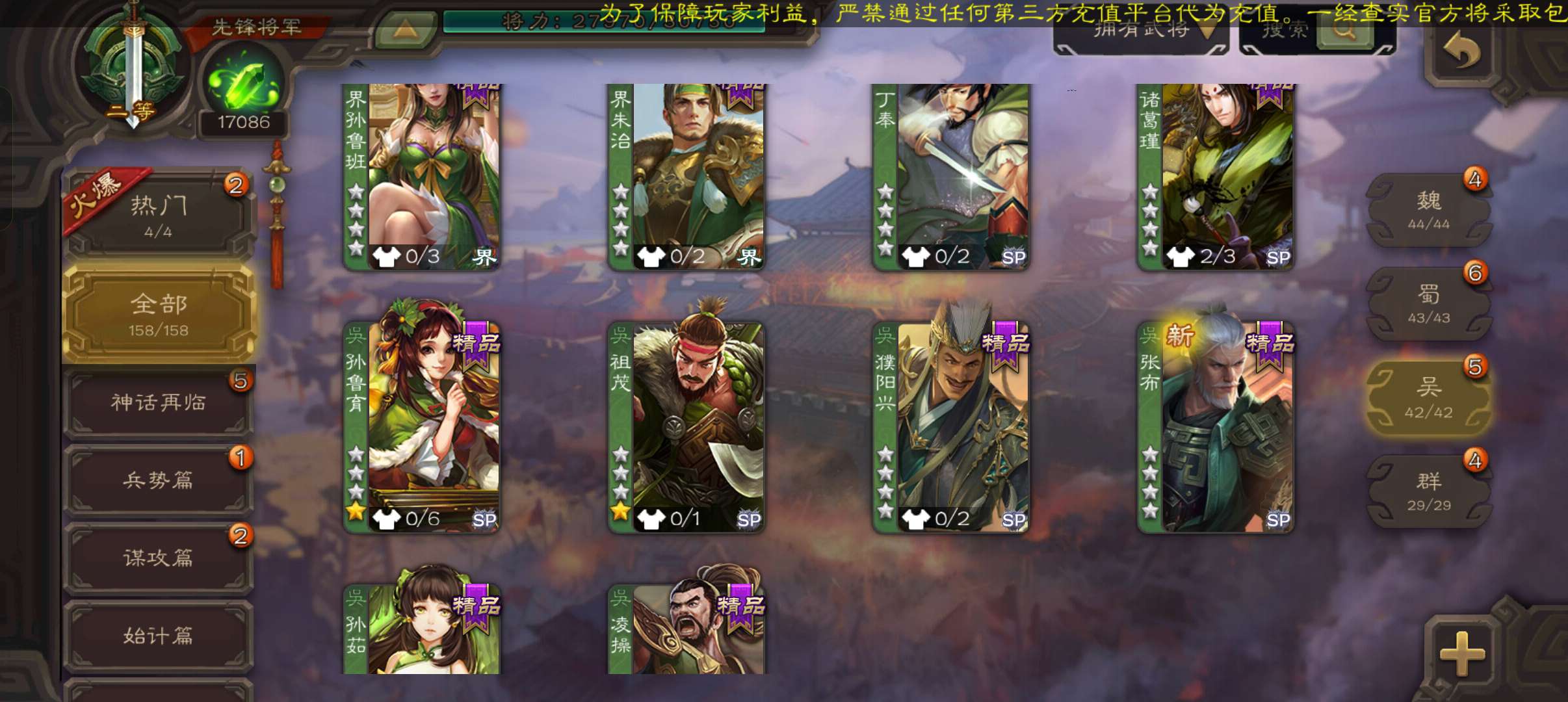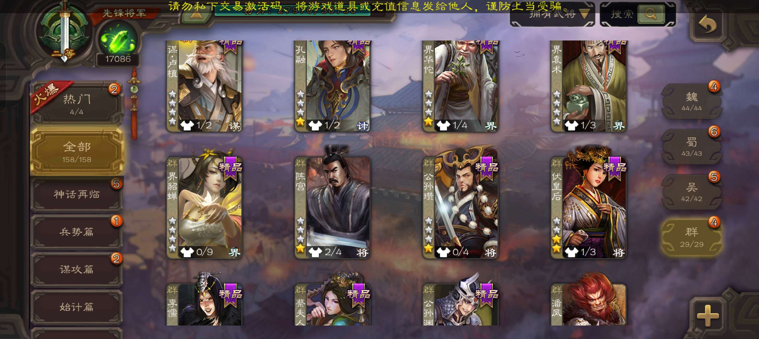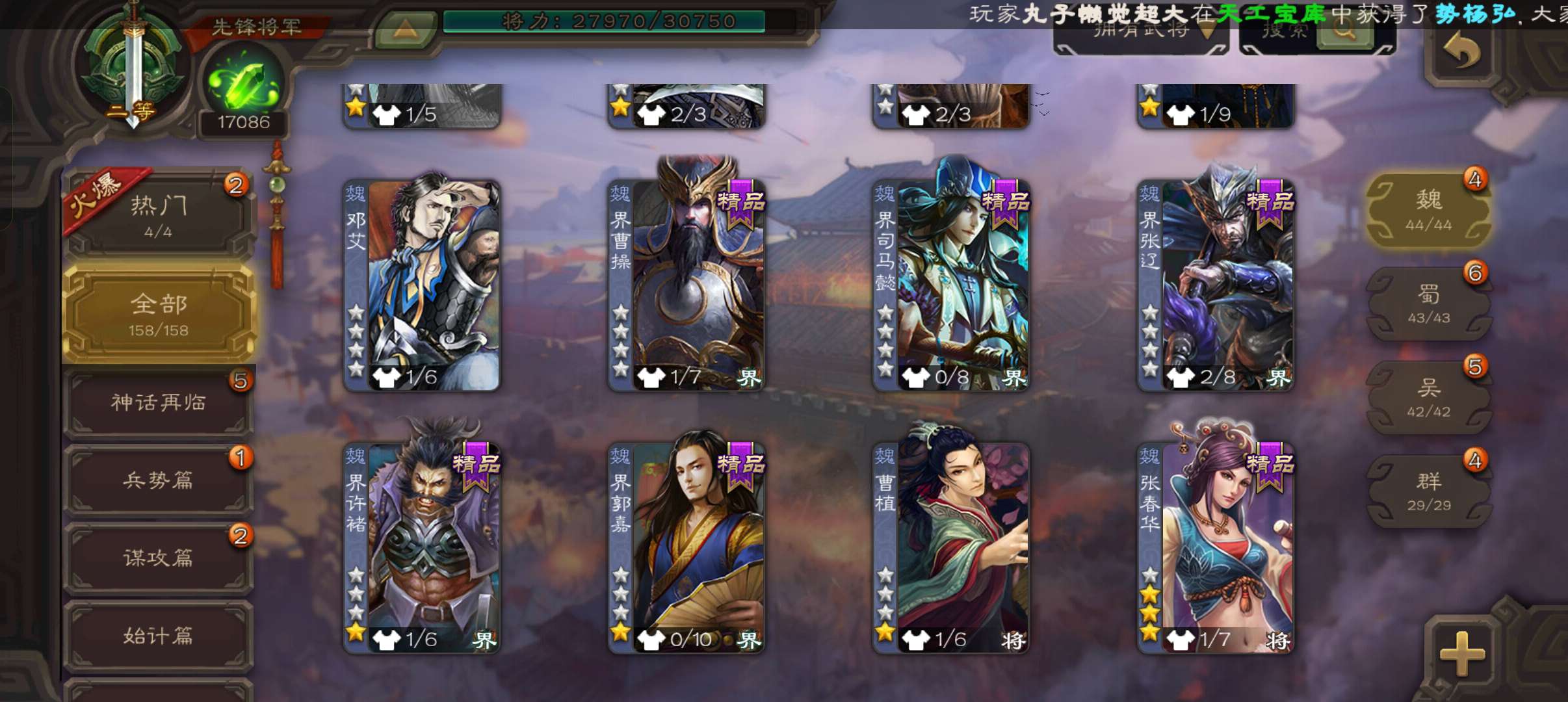33宝珠8万羽毛1.7万将魂,张春华鲁肃sp赵云孔融谋韩当谋卢植谋小乔158将