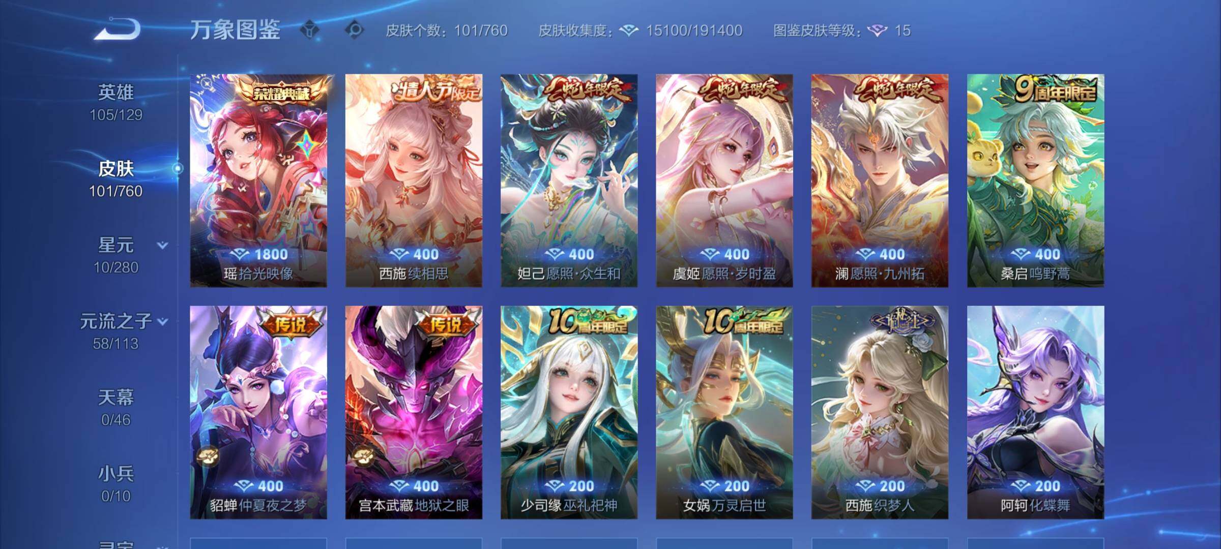/可换绑【捡漏号 瑶典藏 西施情人节 蛇年限定 多传说限定号】2星传说 10按键 五级铭文80 可二次EE0296 安卓Q-V5-101皮肤-1典藏皮肤-7传说-21史诗【荣耀典藏】:瑶拾光映像【星元皮肤】:貂蝉金色仲夏夜,貂蝉幻舞叠翠【传说皮肤】:西施续相思,妲己愿照众生和,澜愿照九州拓,虞姬愿照岁时盈,桑启鸣野蒿,貂蝉仲夏夜之梦,宫本武藏地狱之眼【限定皮肤】:蒙