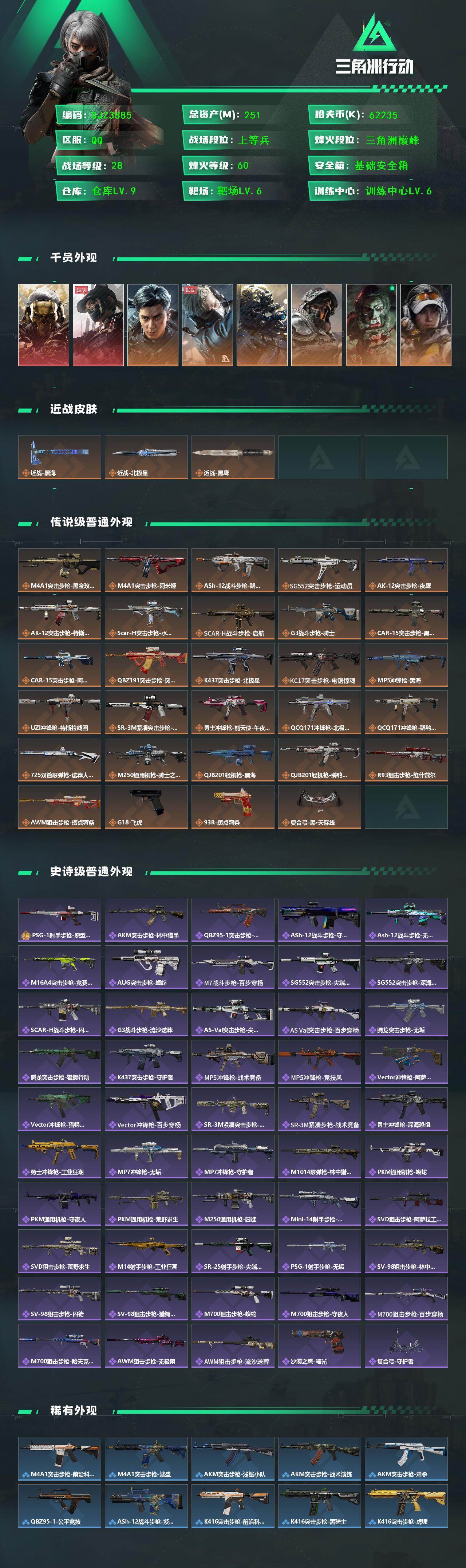 总资产(M):251M/哈夫币(K):62235K传说枪皮数:29/全面战场等级:28_段位:上等兵/烽火地带等级:60_段位:三角洲巅峰/