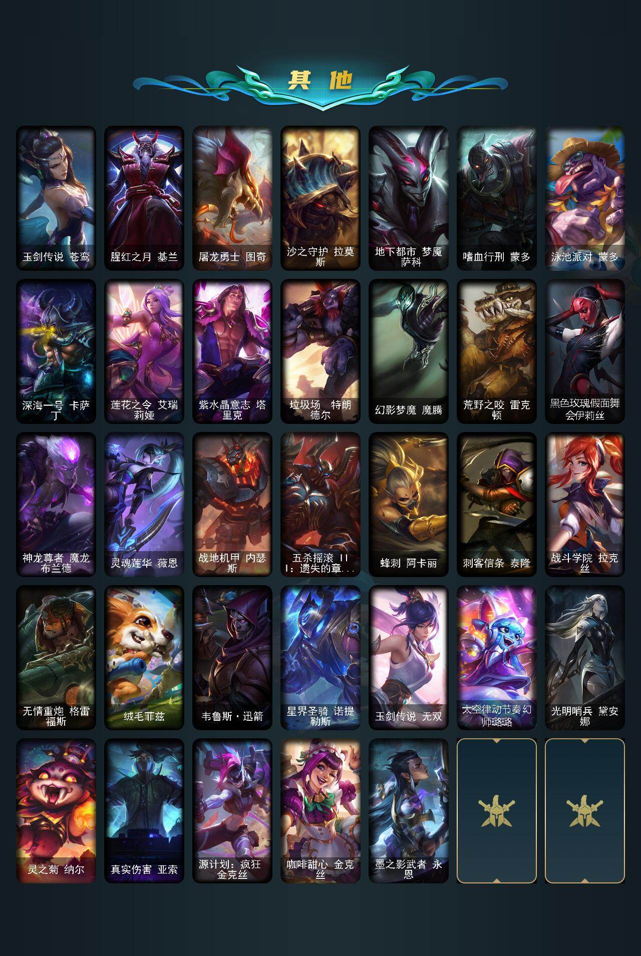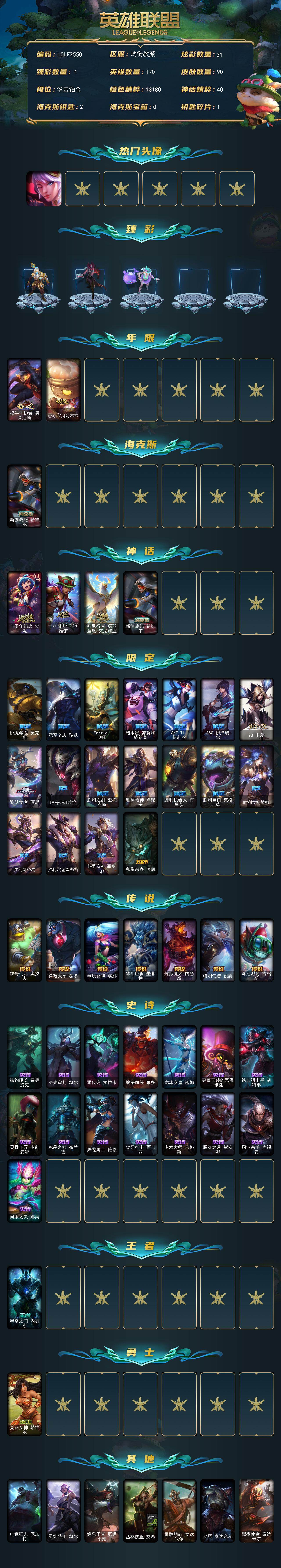 170英雄/90皮肤/4神话/21限定/4臻彩/31炫彩/7传说/15史诗/铂金/