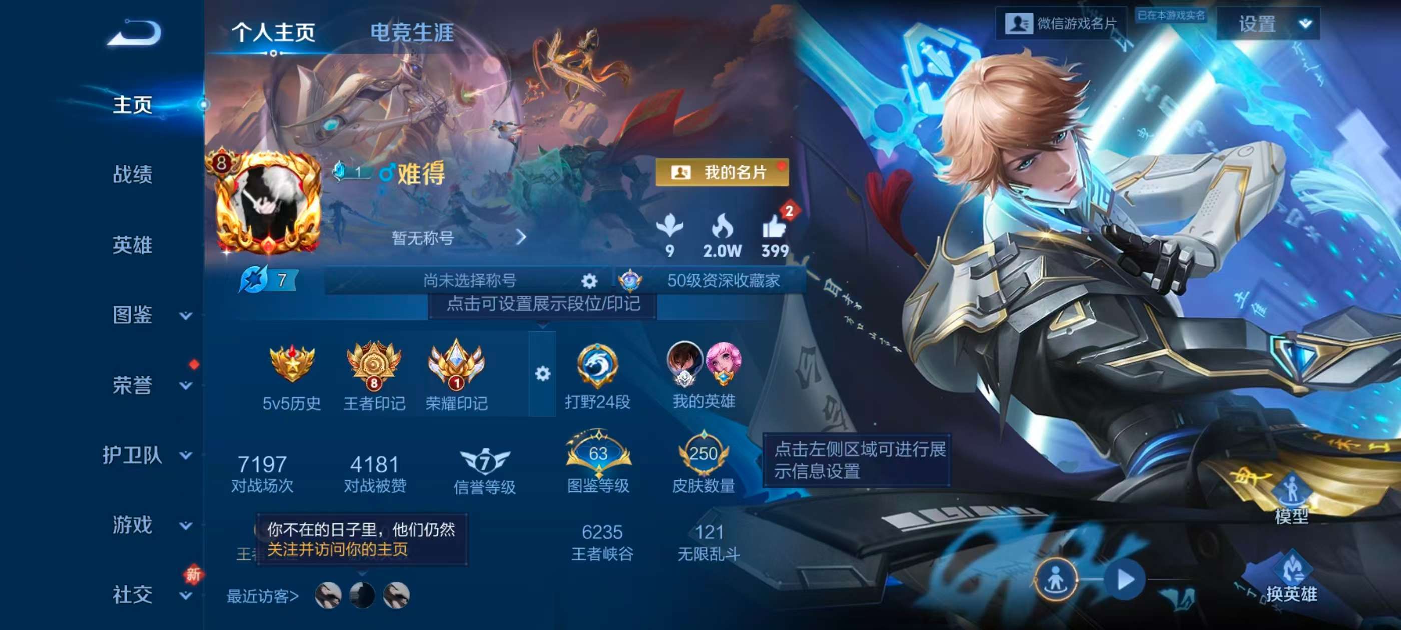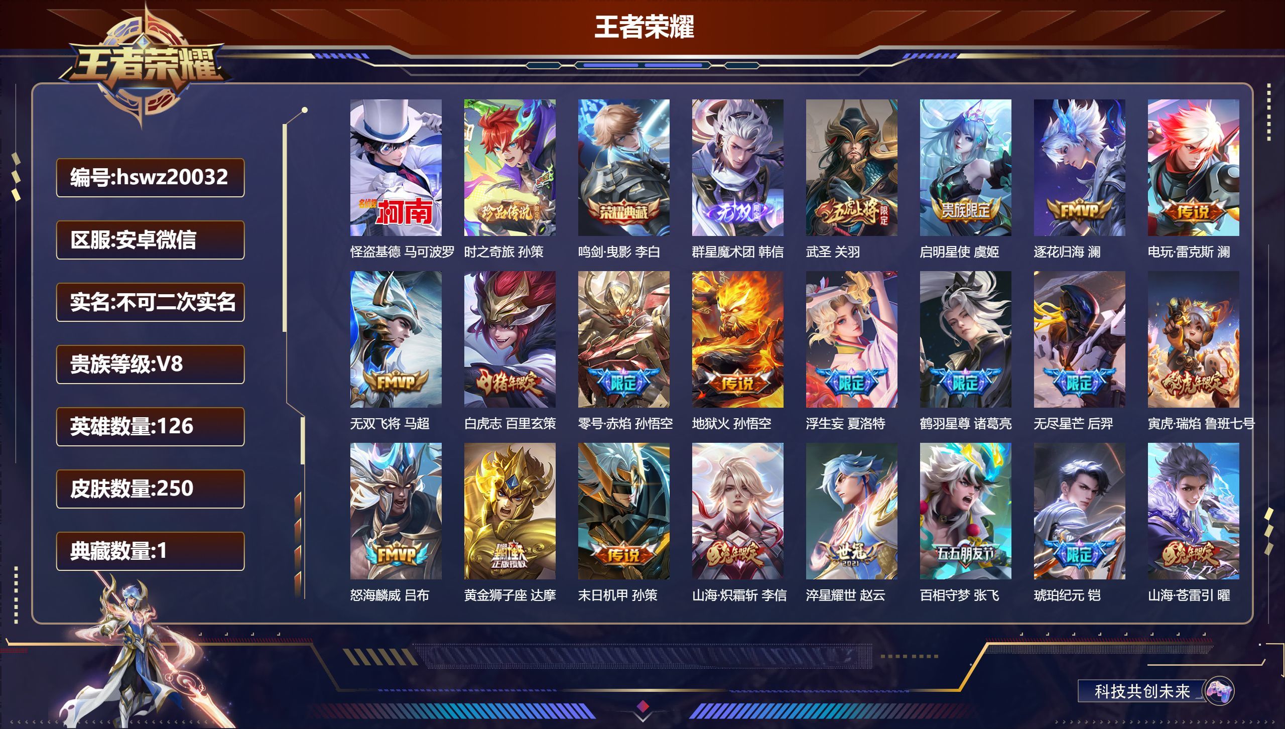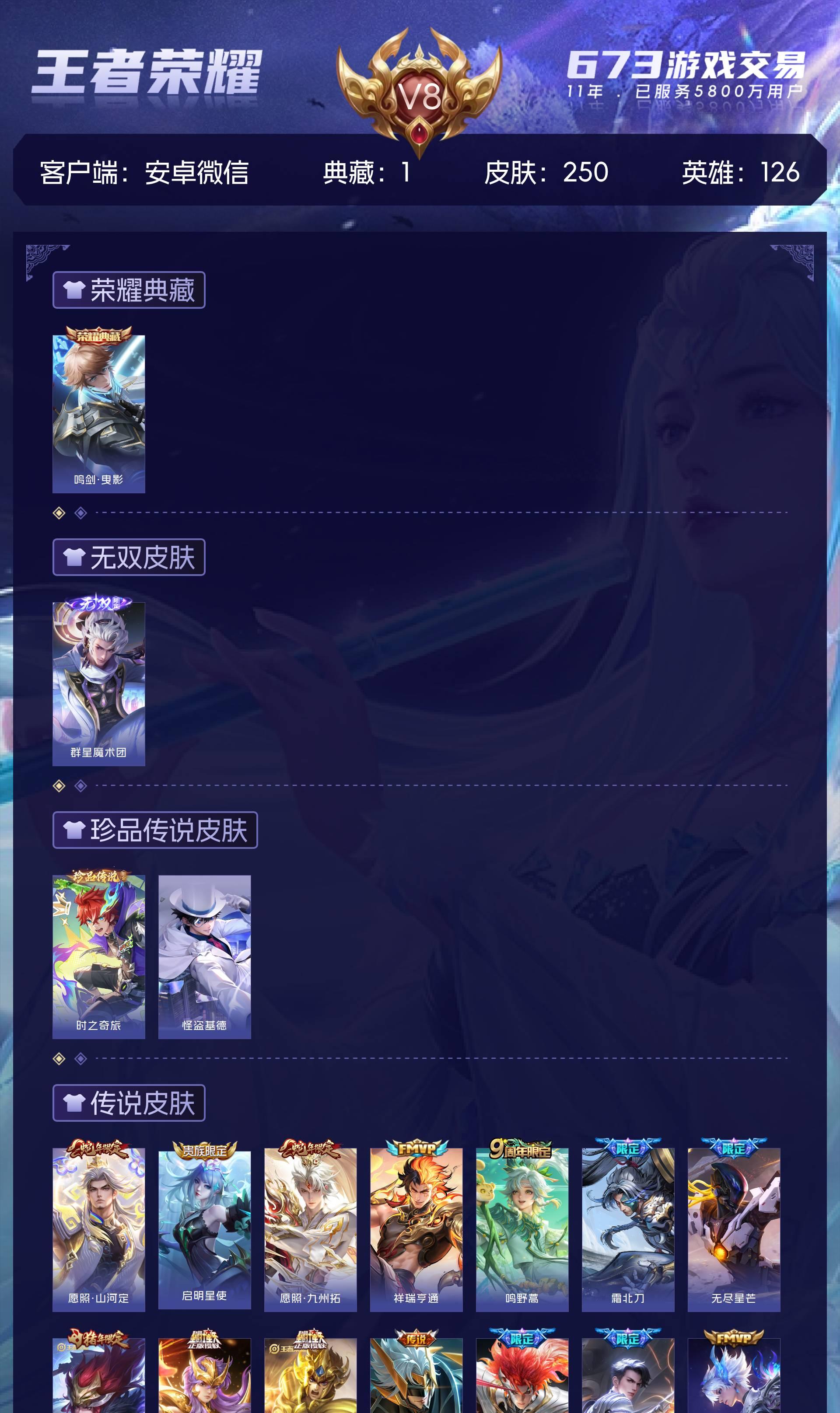 安卓微/最强王者/250皮肤/126英雄/1典藏/0珍品无双/1无双/2珍品传说/27传说/72史