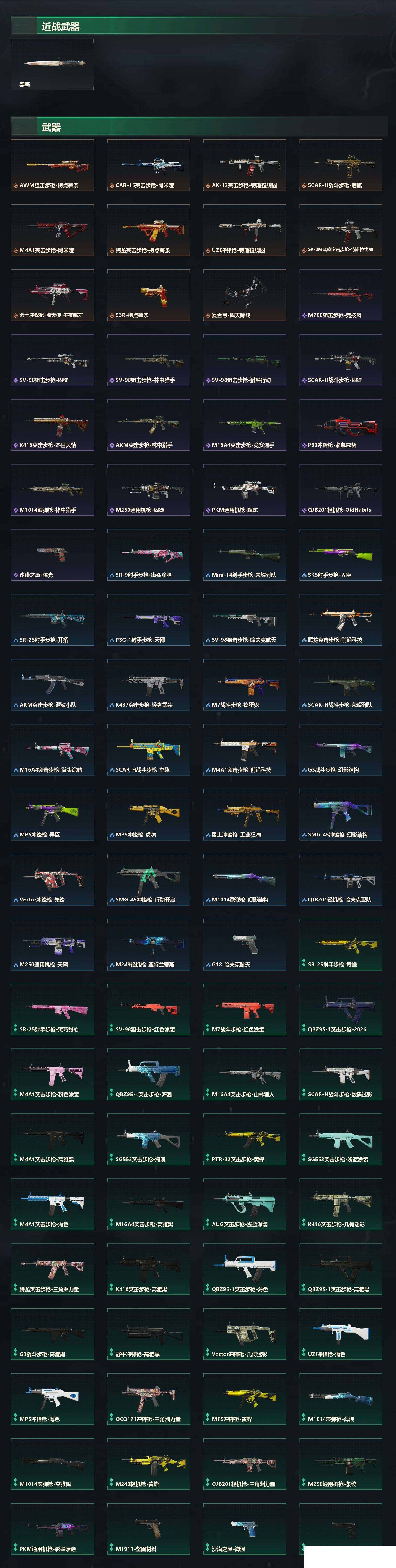 【传说外观】:M4A1突击步枪-阿米娅,AK-12突击步枪-特斯拉线圈,SCAR-H战斗步枪-启航,CAR-15突击步枪-阿米娅,腾龙突击步枪-捞点薯条,UZI冲锋枪-特斯拉线圈,SR-3M紧凑突击步枪-特斯拉线圈,勇士冲锋枪-能天使-午夜邮差,AWM狙击步枪-捞点薯条,93R-捞点薯条,复合弓-黑·天际线