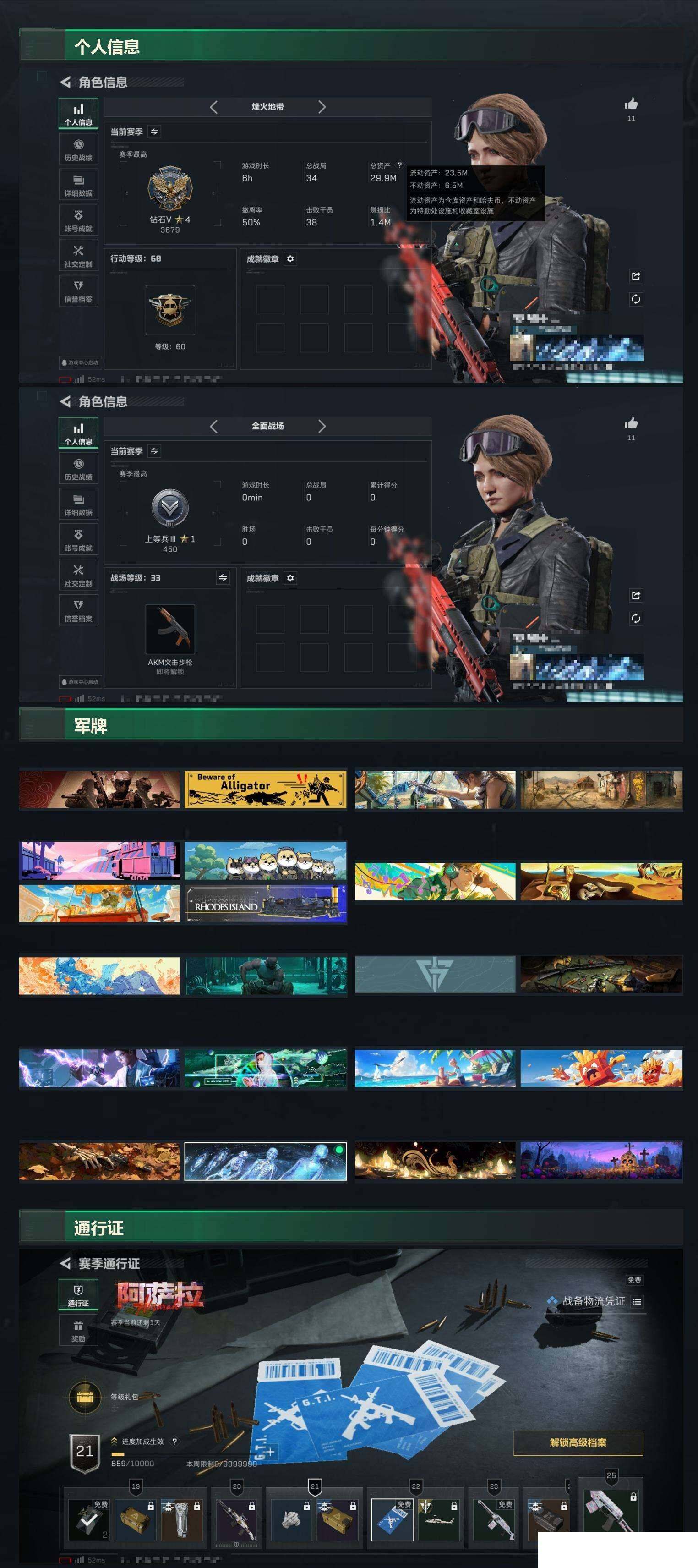 29m总资产-8638k哈伏币-60烽火等级-钻石-33战场等级-上等兵
