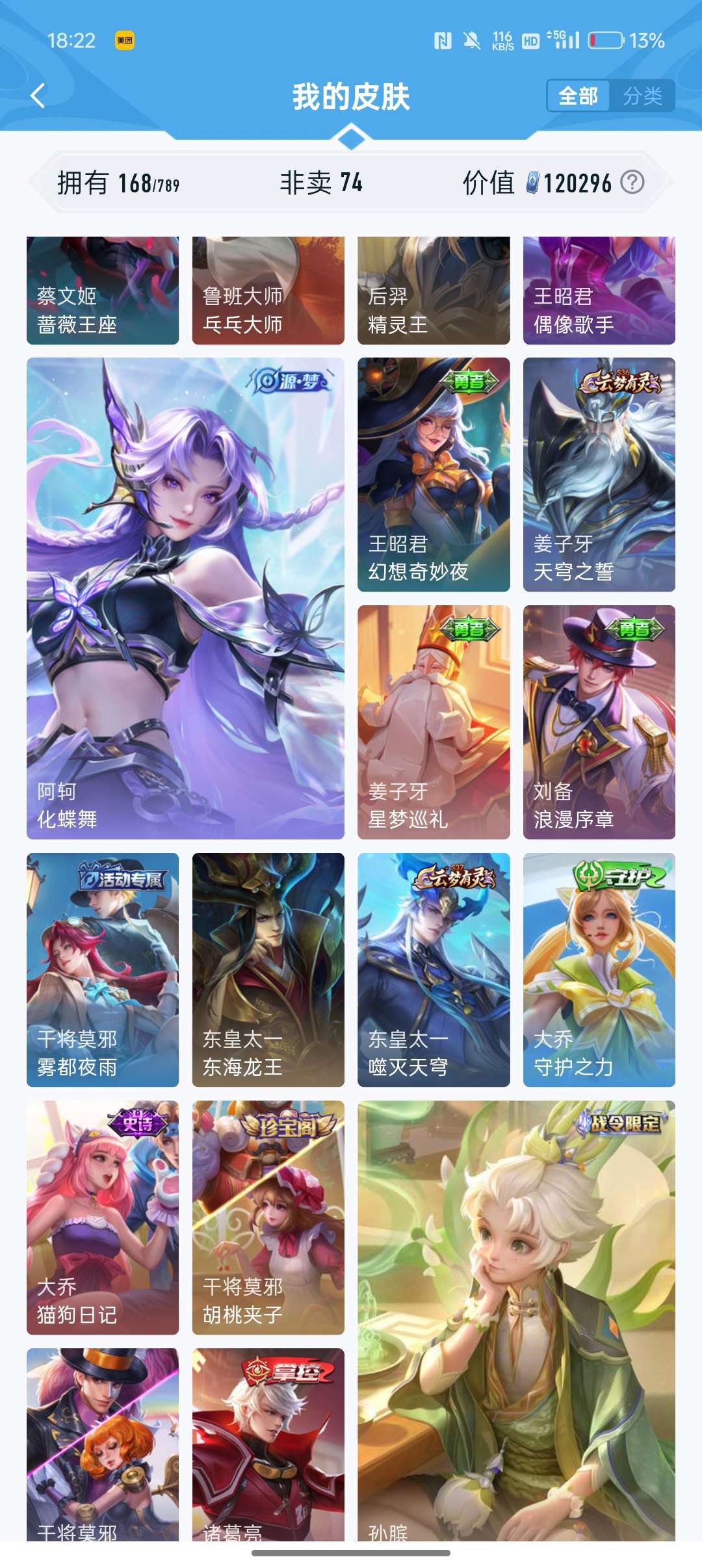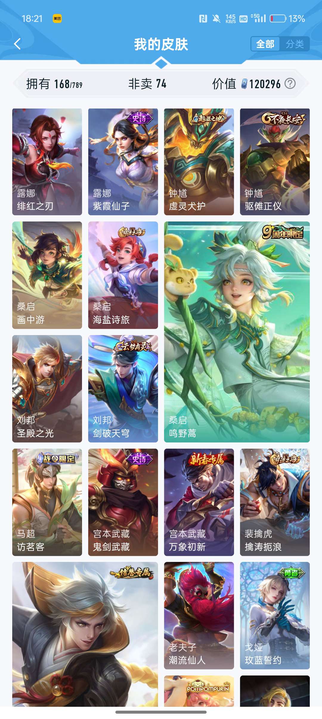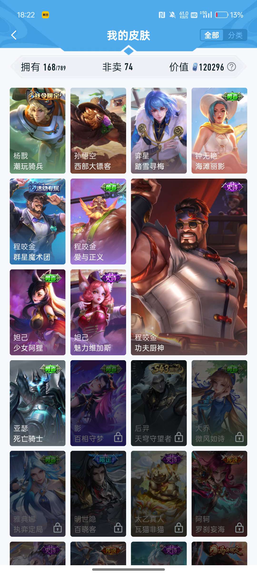 V6 皮肤168英雄127 至尊星耀 荣耀典藏1 传说5 其他皮肤160
