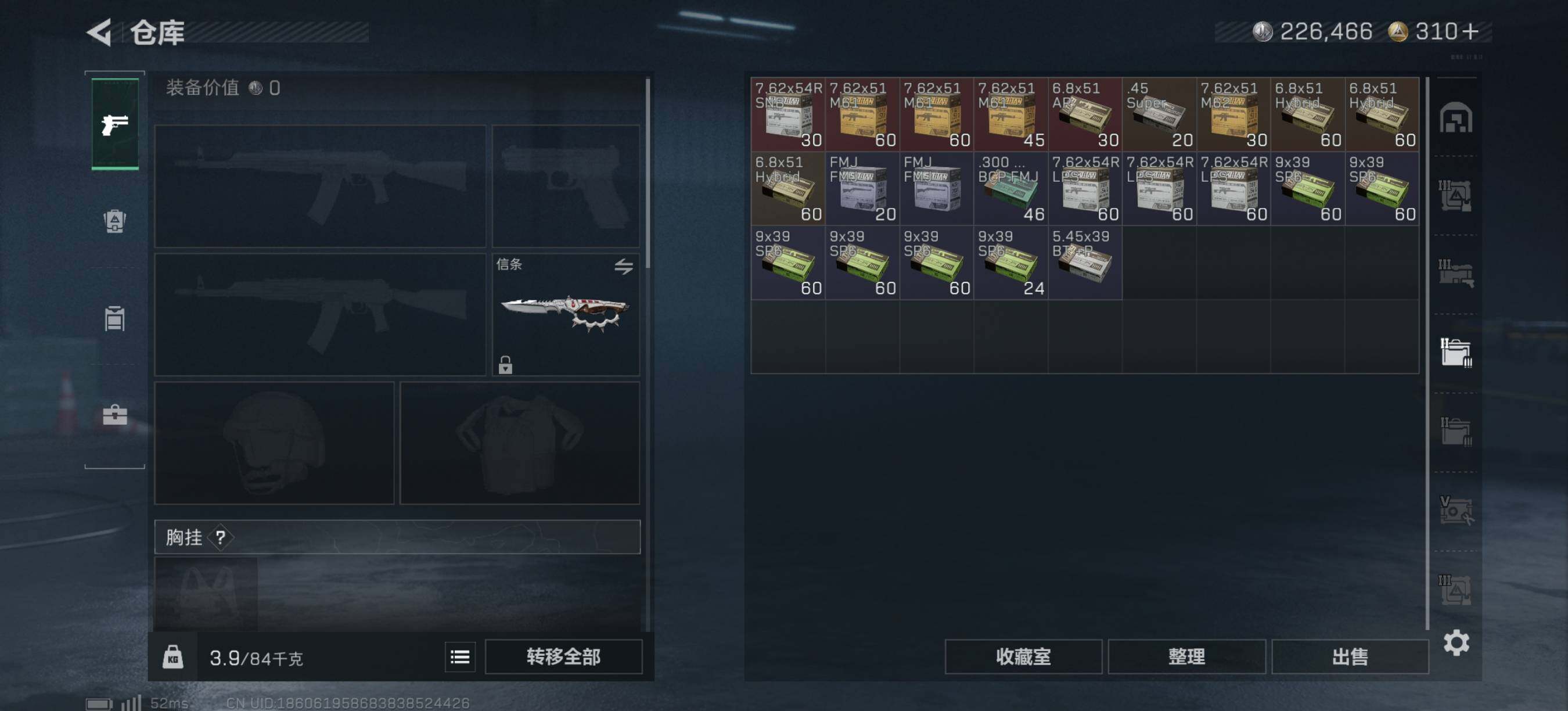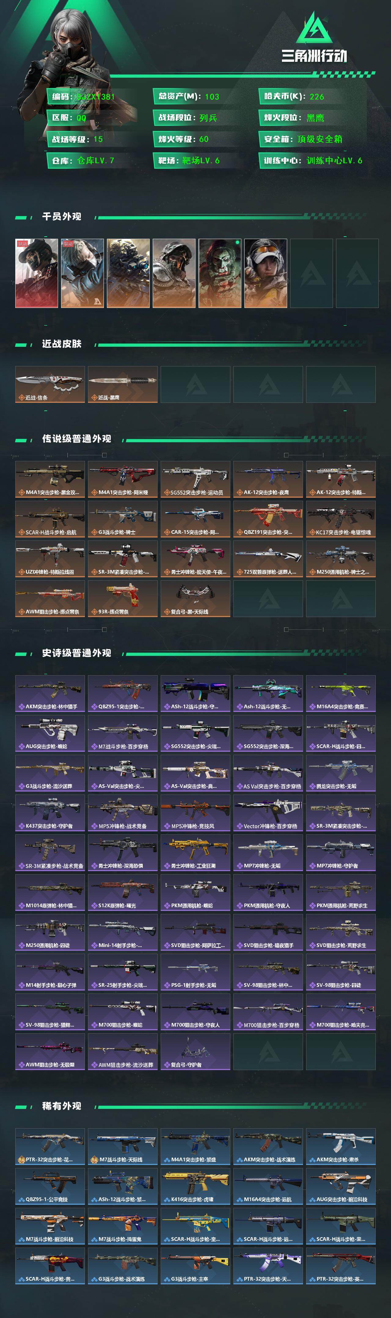 总资产(M):103M/哈夫币(K):226K/传说枪皮数:18/全面战场等级:15_段位:列兵/烽火地带等级:60_段位:黑鹰/