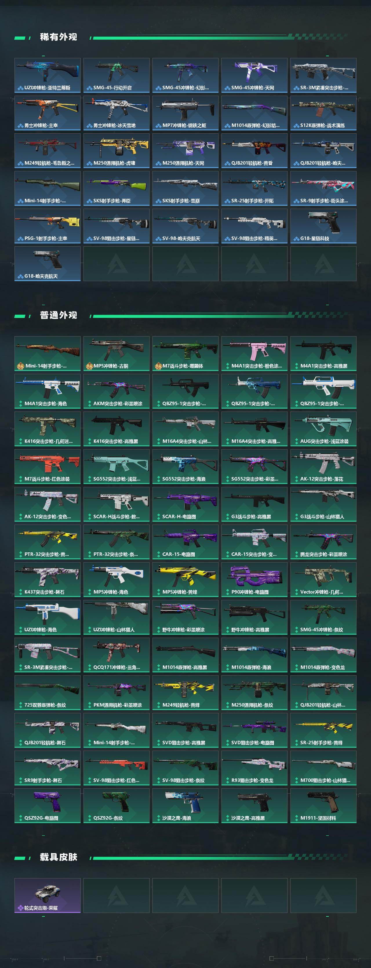 【传说外观】:M4A1突击步枪-阿米娅,AKM突击步枪-赤枭,ASh-12战斗步枪-鹅鸭杀,SG552突击步枪-运动员,AK-12突击步枪-特斯拉线圈,SCAR-H战斗步枪-启航,CAR-15突击步枪-阿米娅,