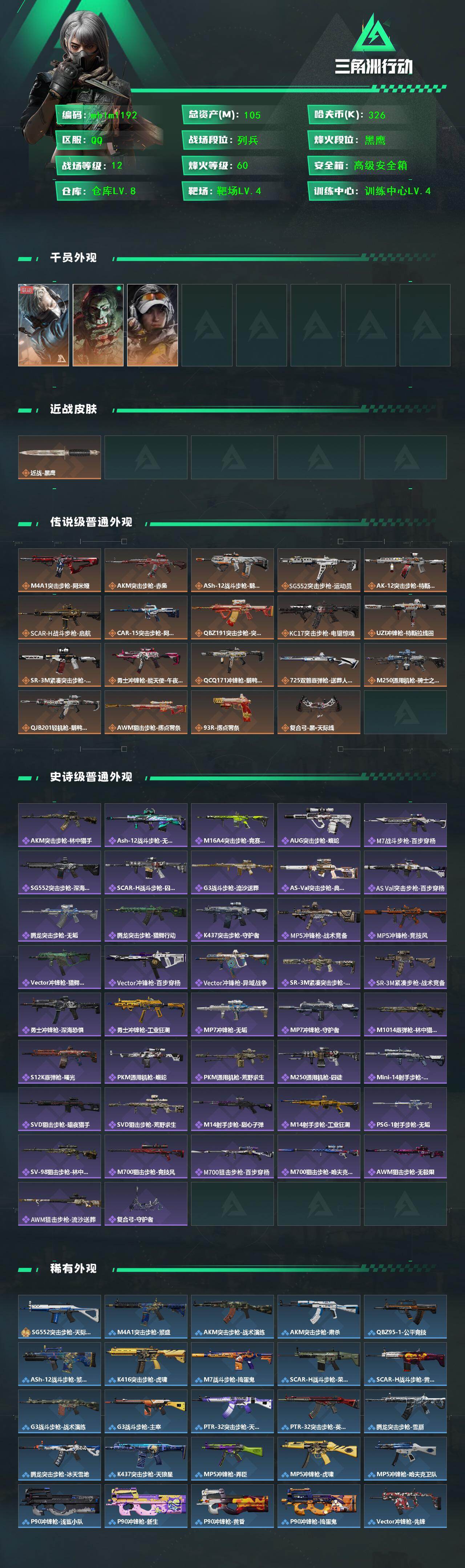 【mhlm1192】105m总资产-326k哈伏币-60烽火等级-黑鹰-12战场等级-列兵