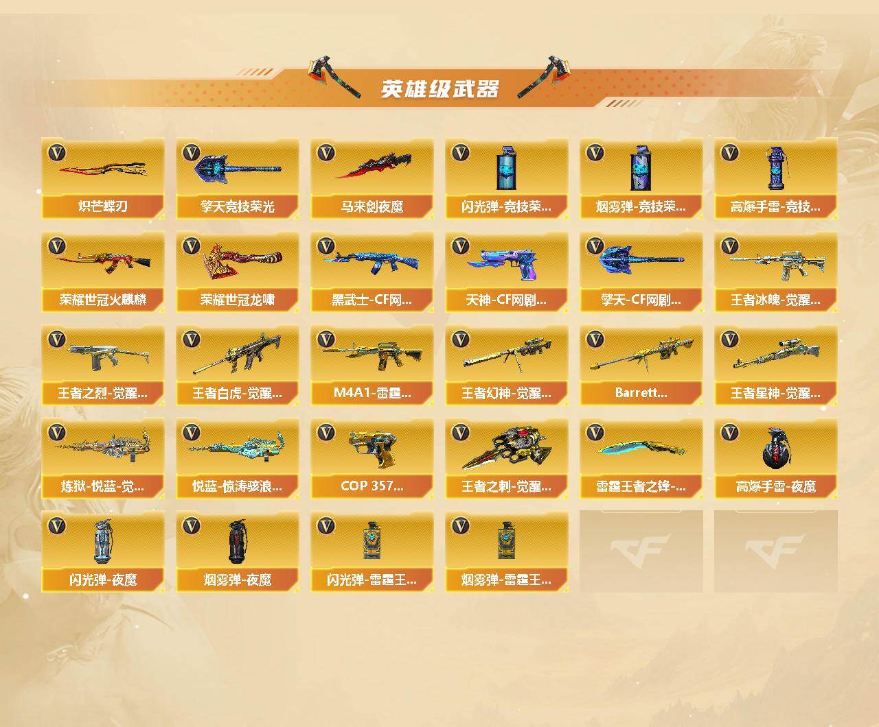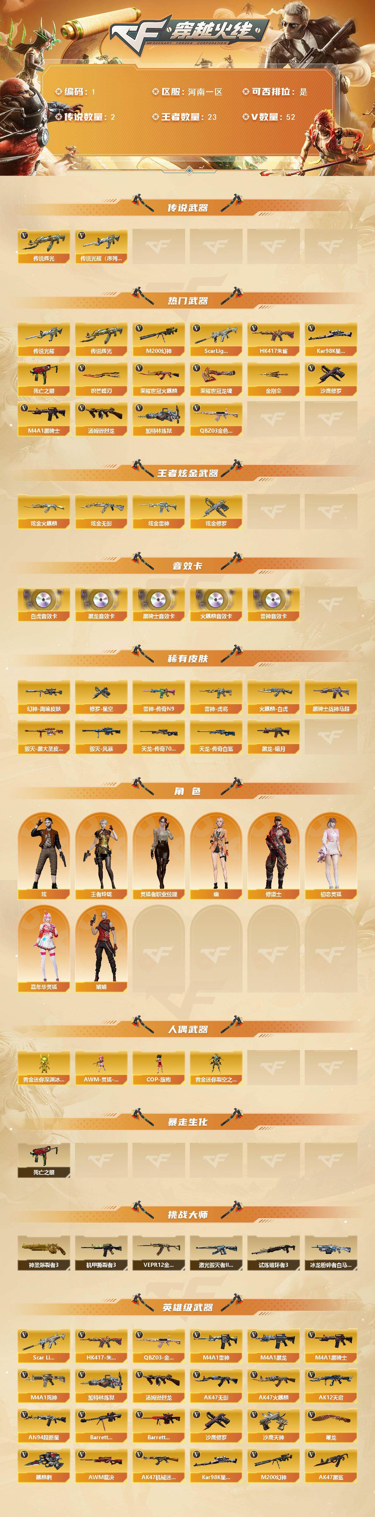 河南一区-52V-23王者-4炫金 传说光耀(序列号版) 传说辉光 M200-幻神,死亡之眼,荣耀世冠-火麒麟,QBZ03-金色蔷薇,Scar Light-白虎,HK417-朱雀 Kar98K-星神,M4A1-黑骑士,汤姆逊-烈龙*2,加特林-炼狱,沙鹰-修罗*2,炽芒蝶刃,荣耀世冠-龙啸,金刚伞 炫金火麒麟,炫金无影,炫金雷神,炫金修罗