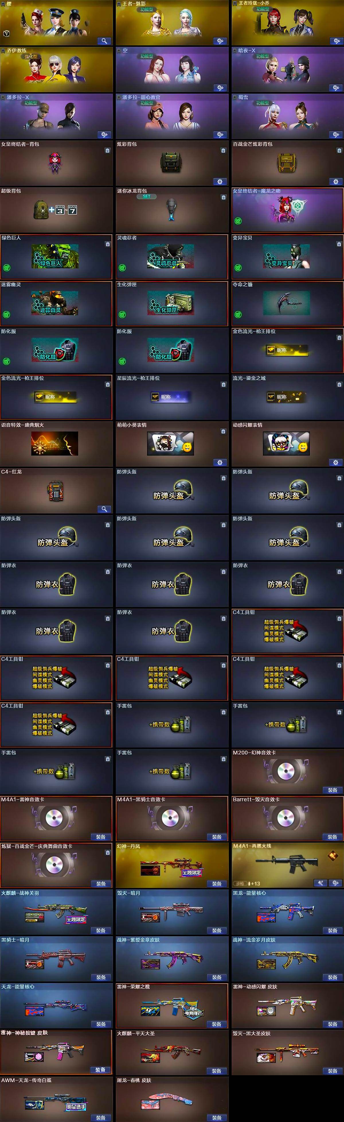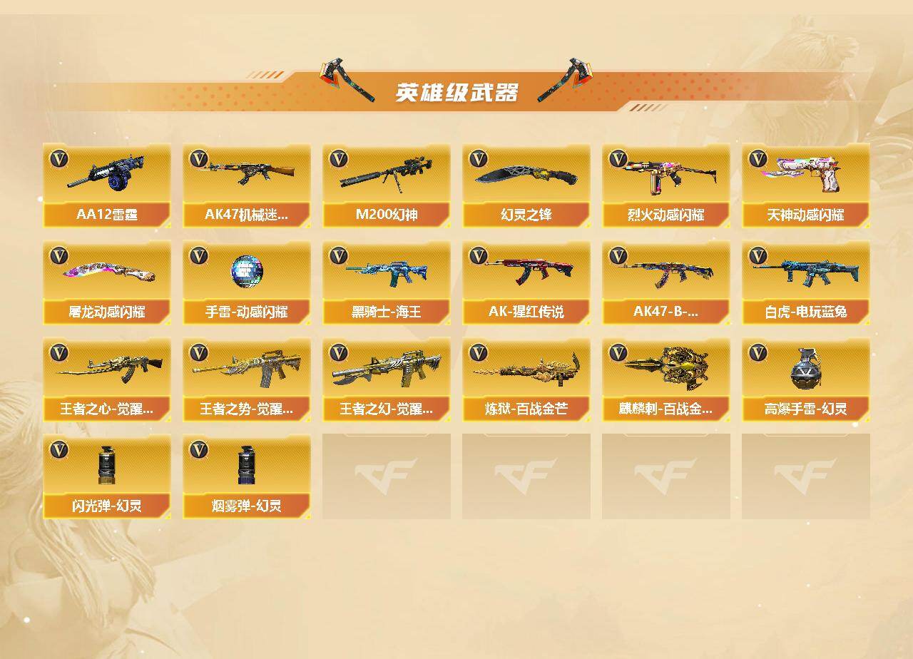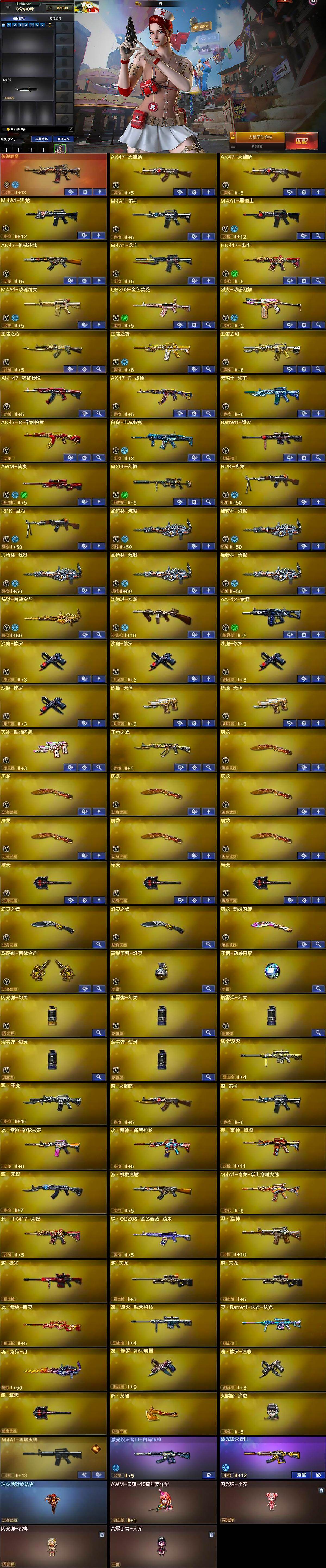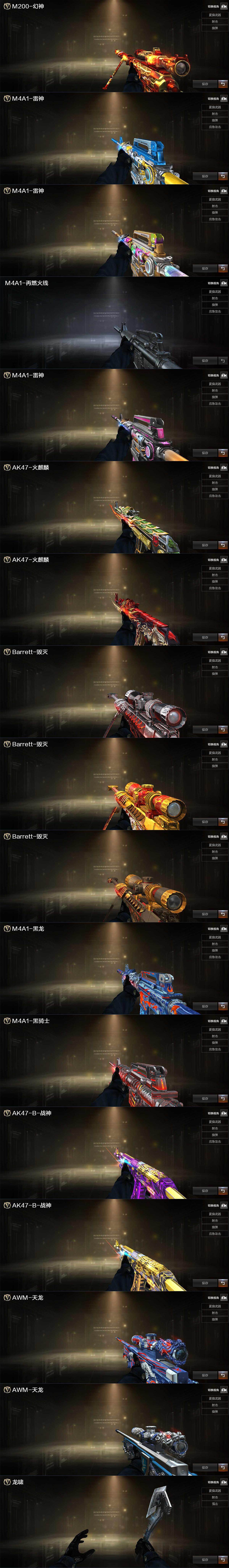 【热门武器】:传说暗裔,QBZ03-金色蔷薇,HK417-朱雀,M200-幻神,白虎-电玩蓝兔,M4A1-黑骑士,汤姆逊-烈龙,RPK-盘龙*2,加特林-炼狱*5,羊驼玩偶,火麒麟-绝迹,沙鹰-修罗*4