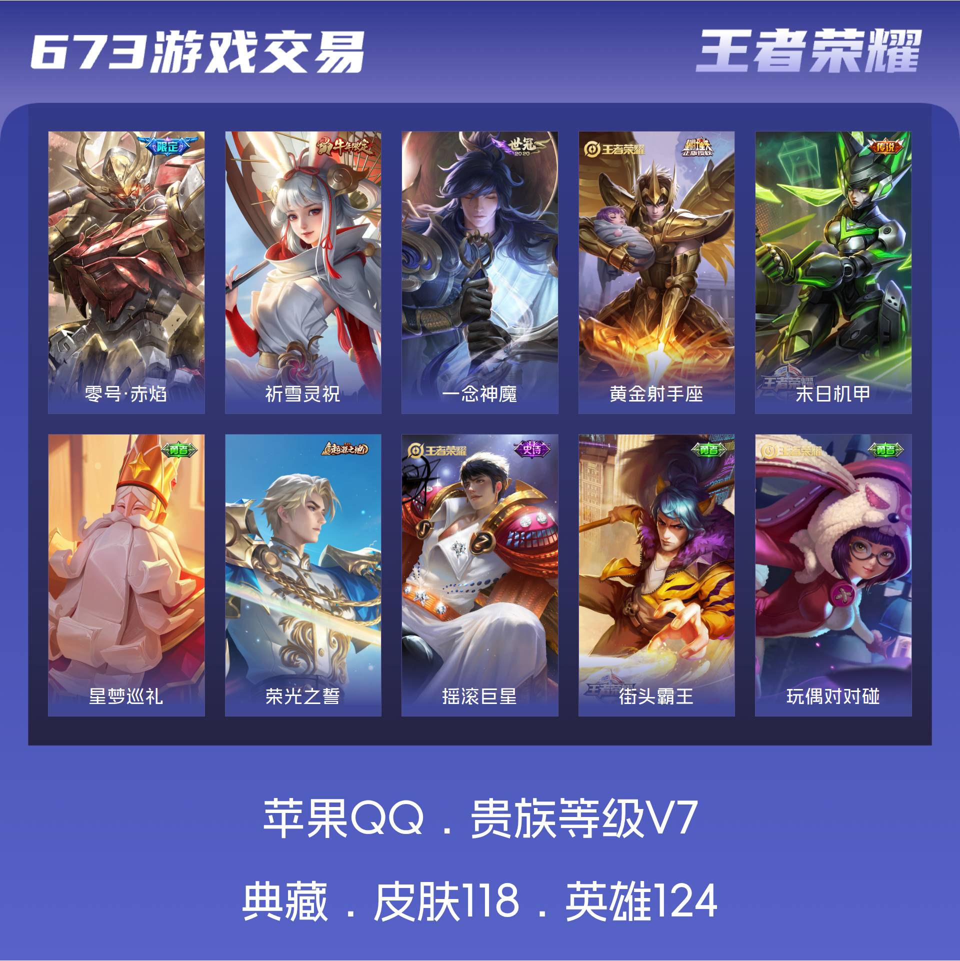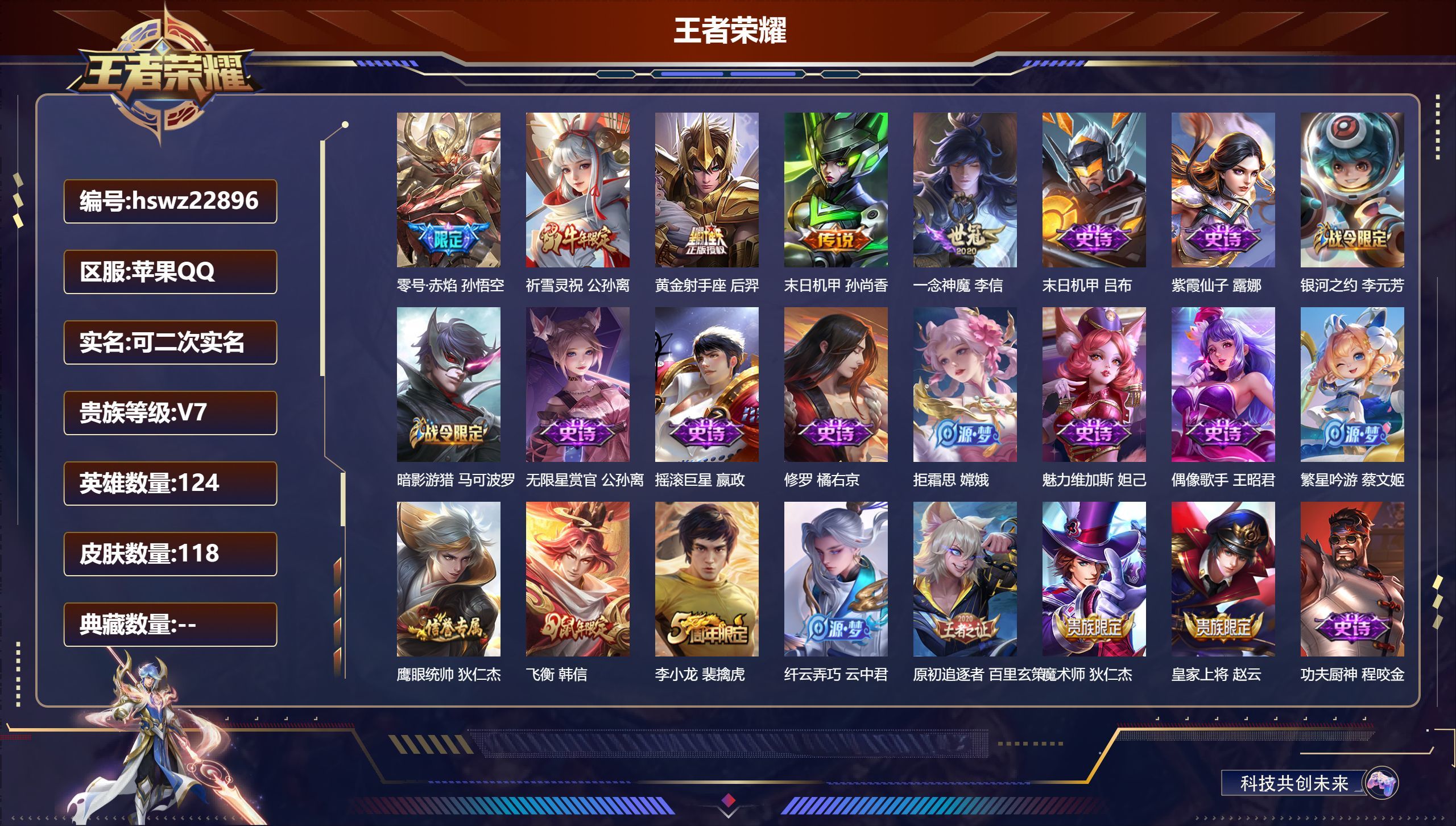 苹果QQ/永恒钻石/118皮肤/124英雄/0典藏/0珍品无双/0无双/0珍品传说/5传说/30史诗