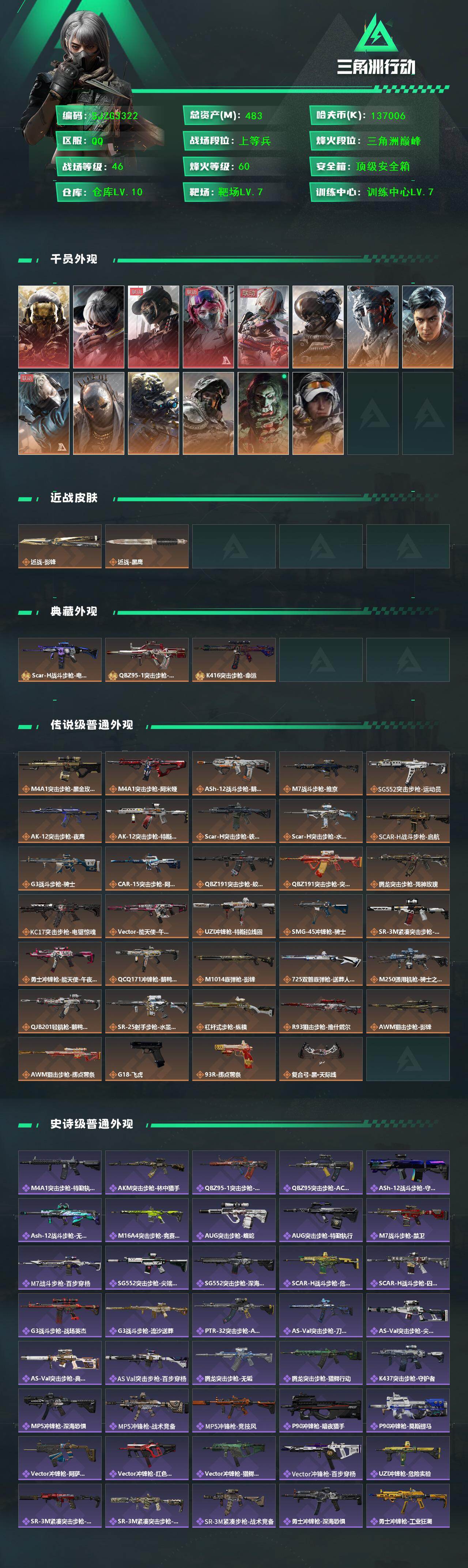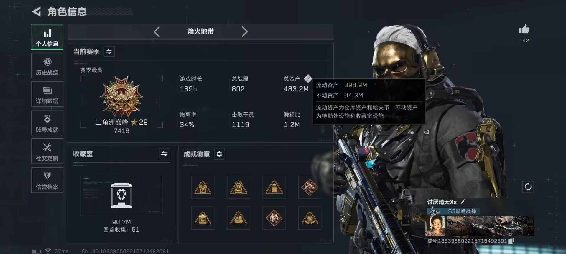 总资产(M):483M/哈夫币(K):137006K/传说枪皮数:37/全面战场等级:46_段位:上等兵/烽火地带等级:60_段位:三角洲巅峰/