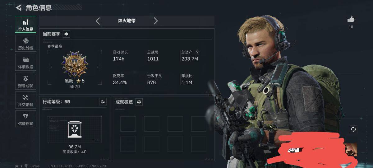 总资产(M):203M/哈夫币(K):63195K/全面战场等级:10_段位:列兵/烽火地带等级:60_段位:黑鹰