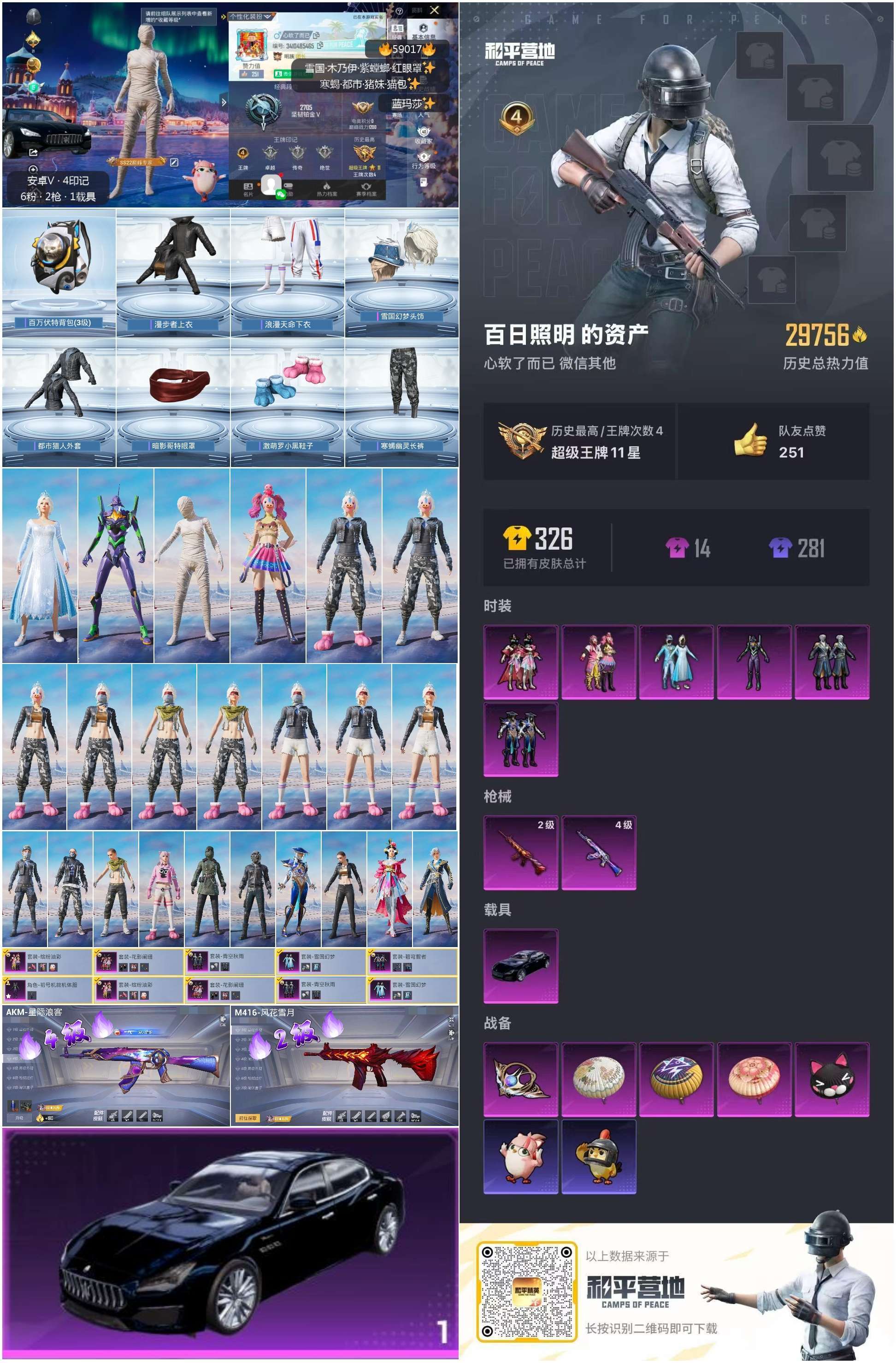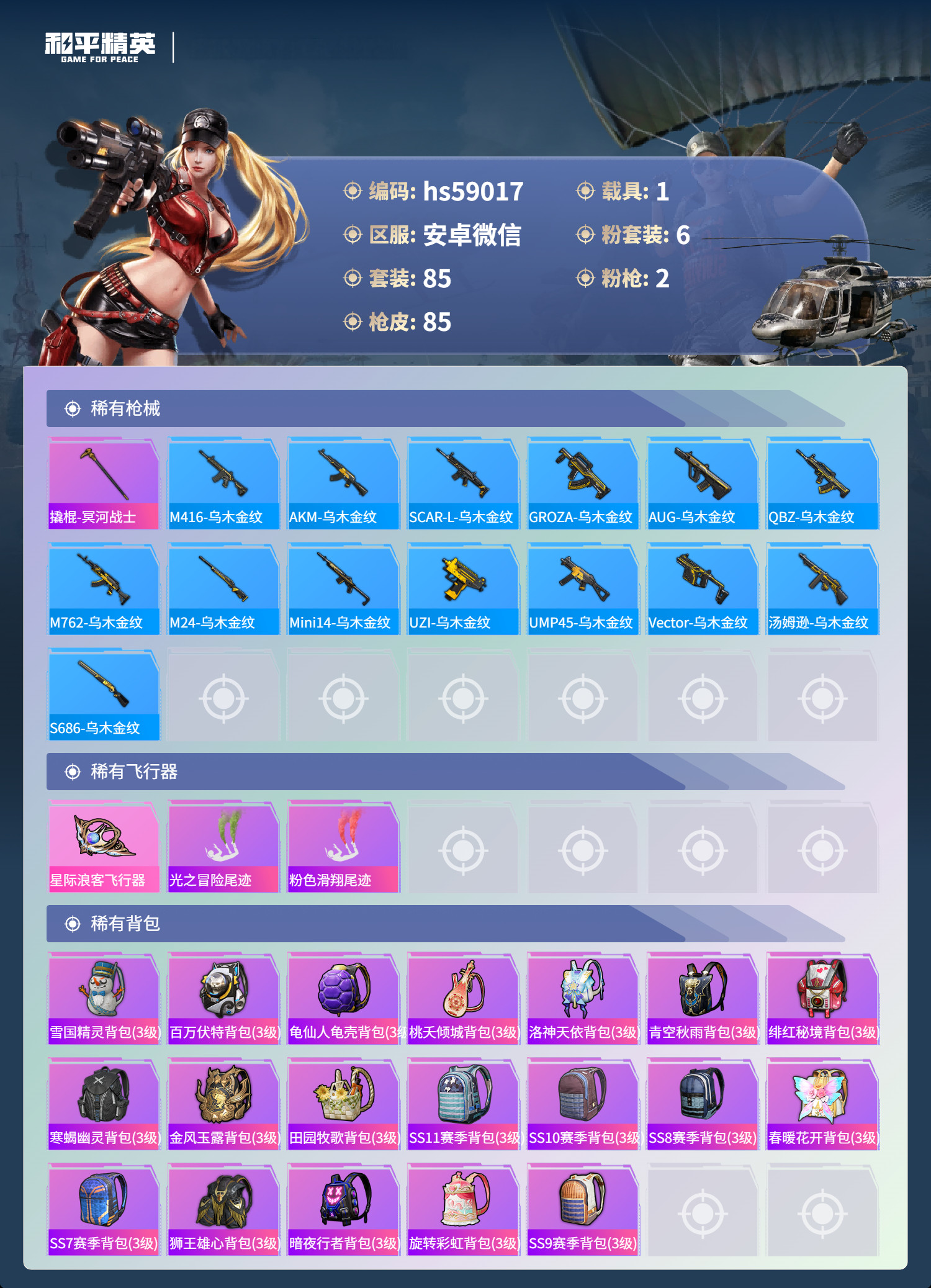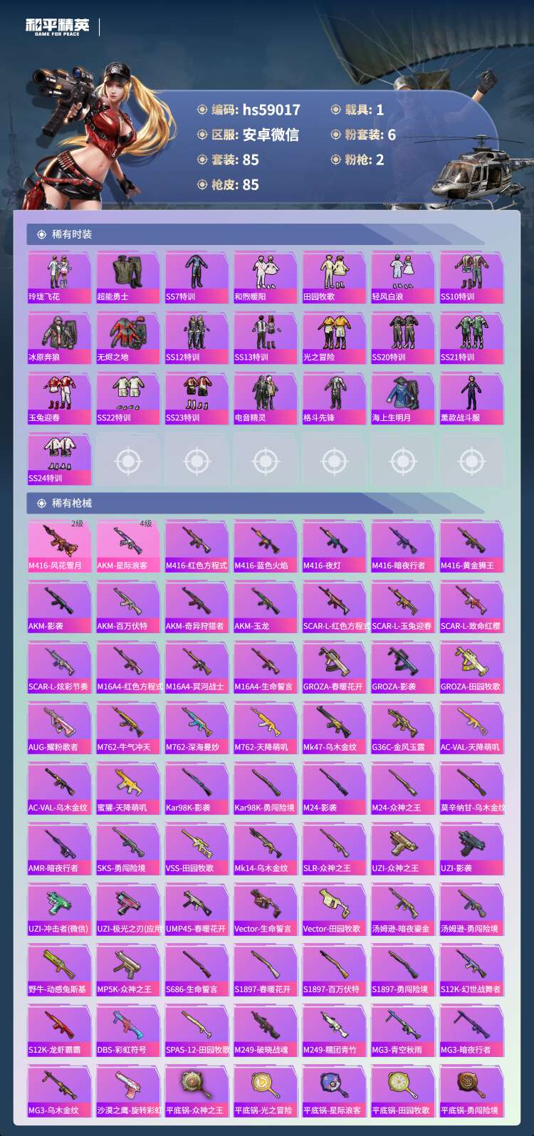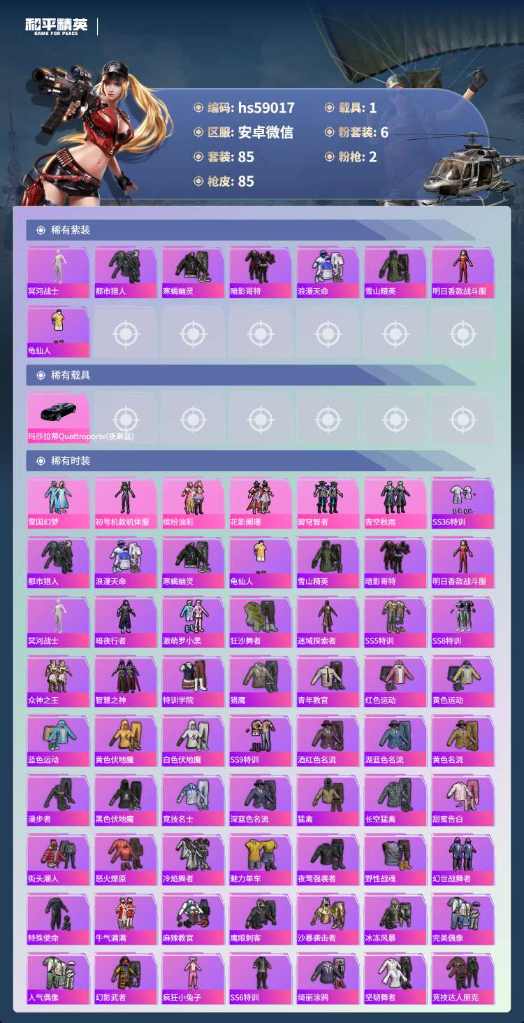 hs59017 安卓微-4王牌印记-6粉装-2特效枪-1载具-29777热力值-85套装-85枪皮