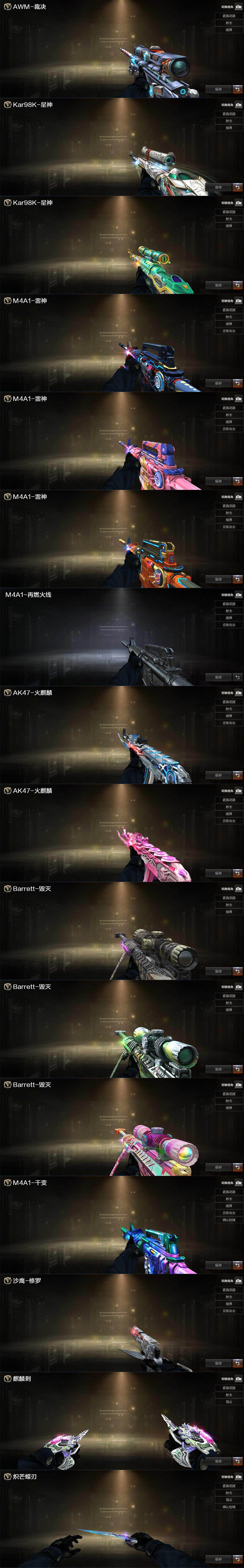 【热门武器】:传说圣谕,QBZ03-金色蔷薇,金色蔷薇-古蛇迷踪,修罗-古蛇迷踪,M200-竞技荣光,Kar98K-星神,羊驼玩偶,沙鹰-修罗,炽芒蝶刃,炽芒蝶刃-破浪逐光 皮肤