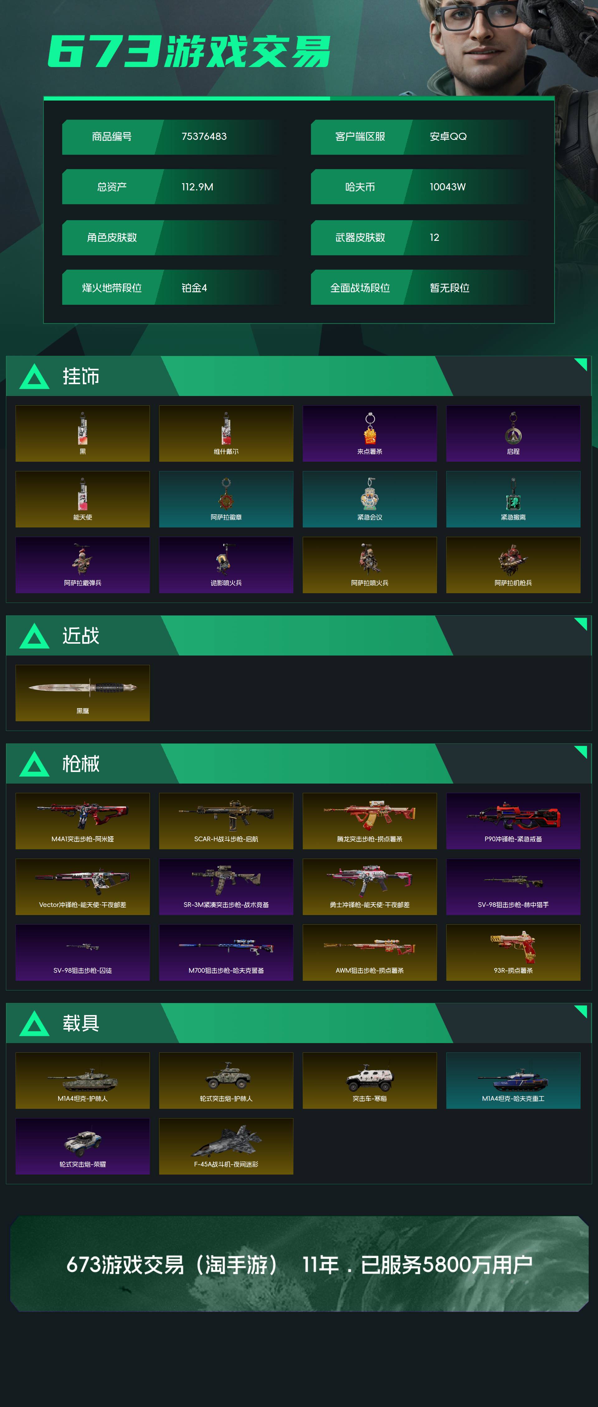 烽火段位铂金4 战场段位暂无段位 总资产112.9M 哈夫币10043W 挂饰12 近战1 枪械12 载具6